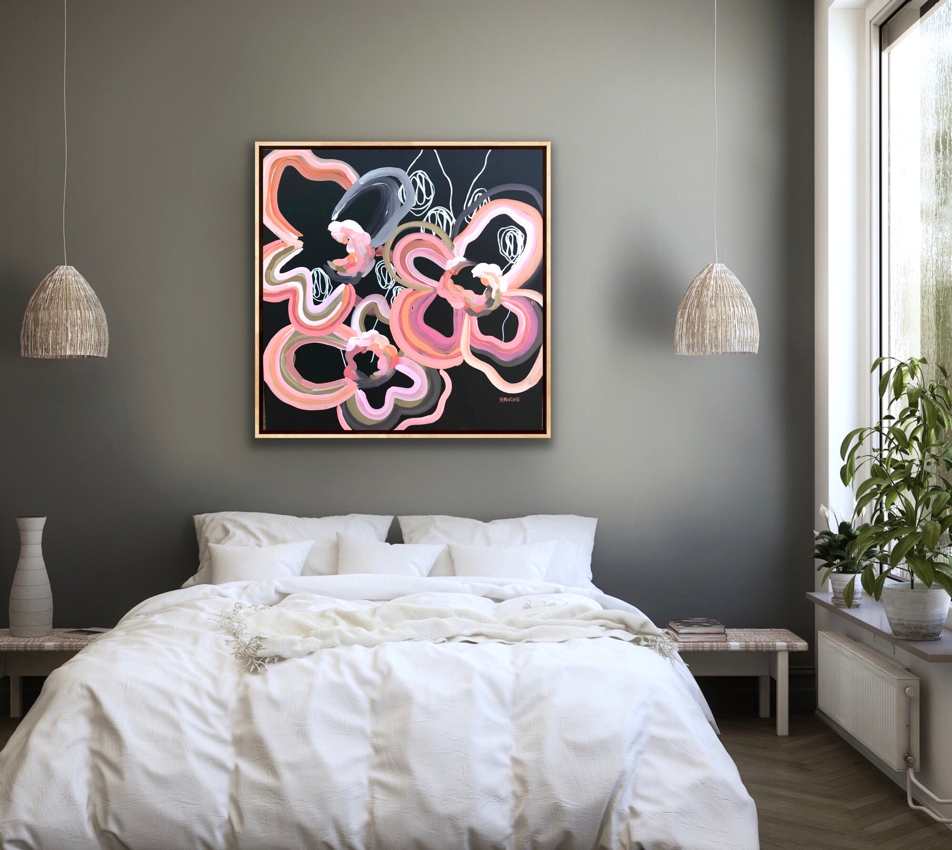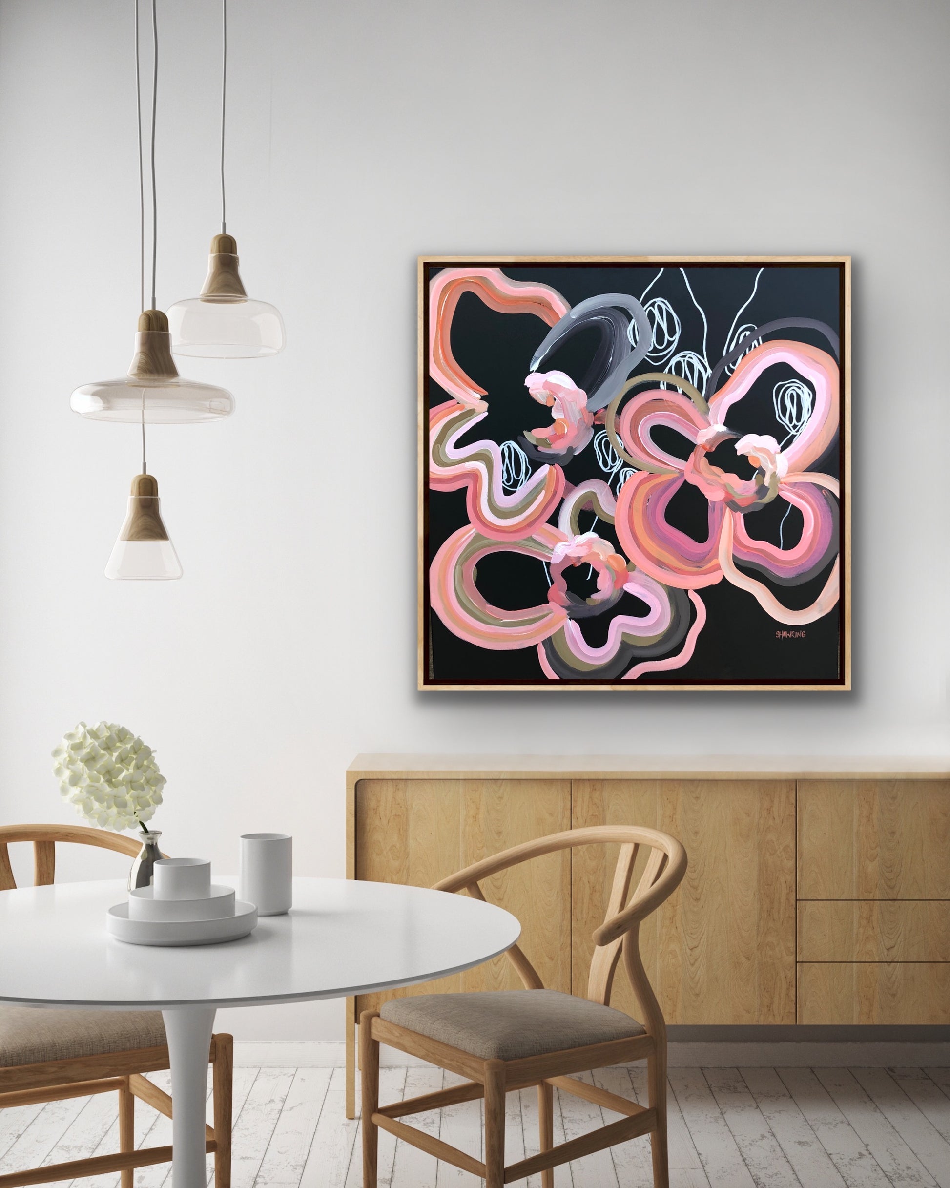 - This artwork would look great framed in an oak timber or black floating frame as shown in the photo.