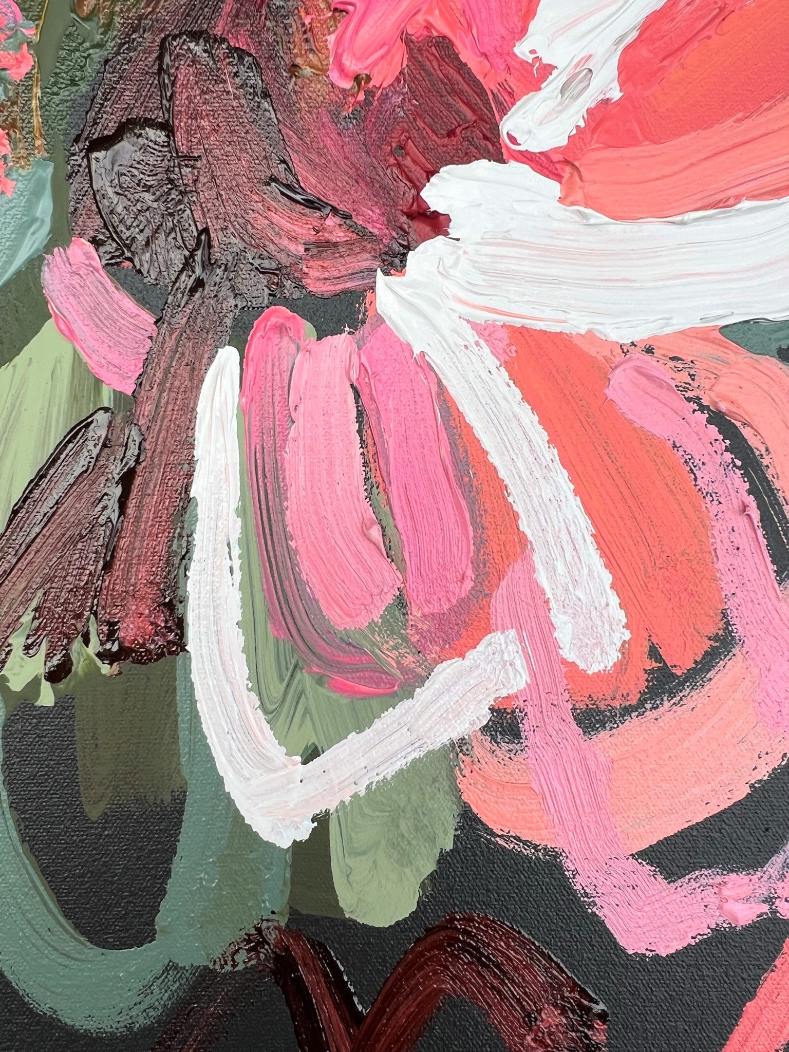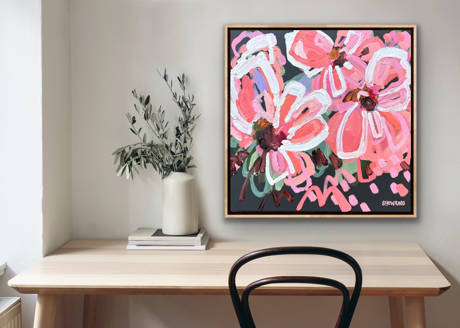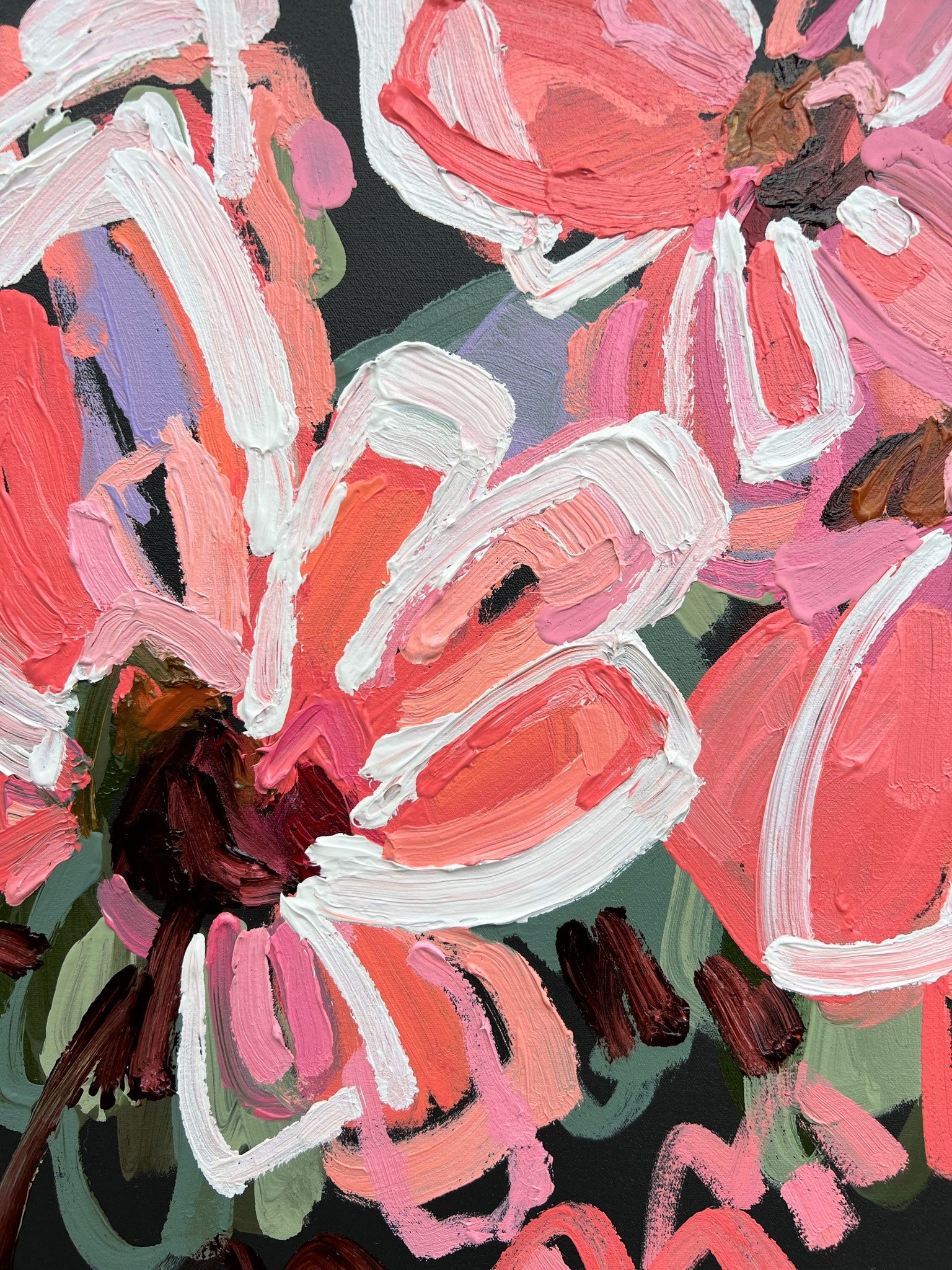 The flowers were created in an expressive style in the colours of love! Eye catching vibrant pinks, delicious apricots, peaches, melons, lilac, sage and olive greens have been painted onto a deep charcoal background that would suit a range of different decors.