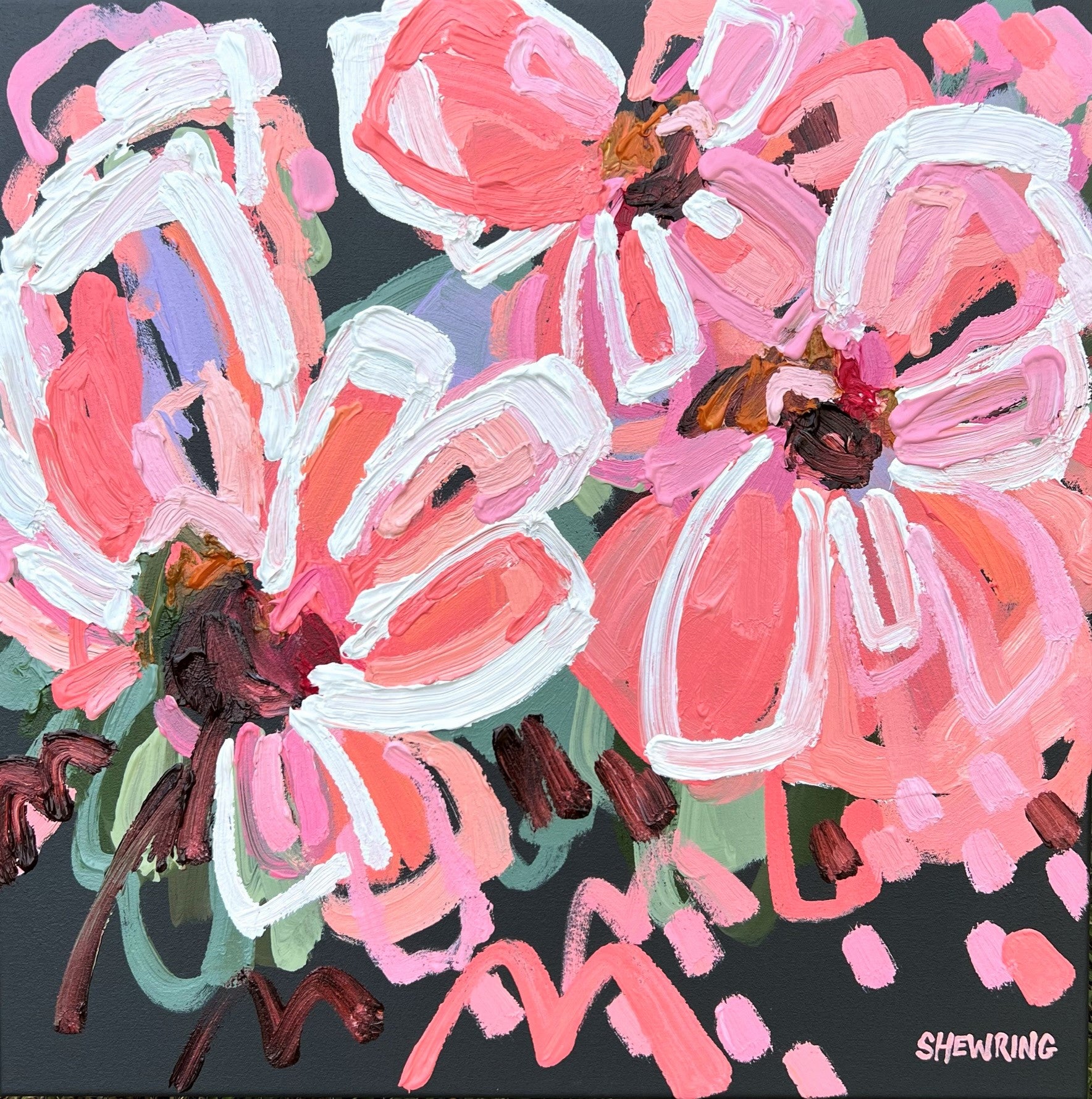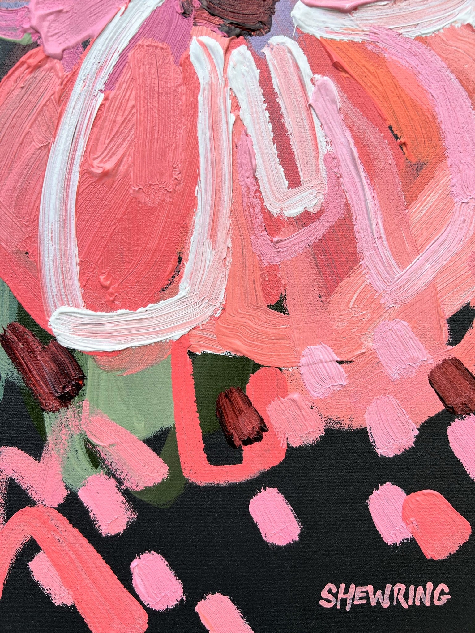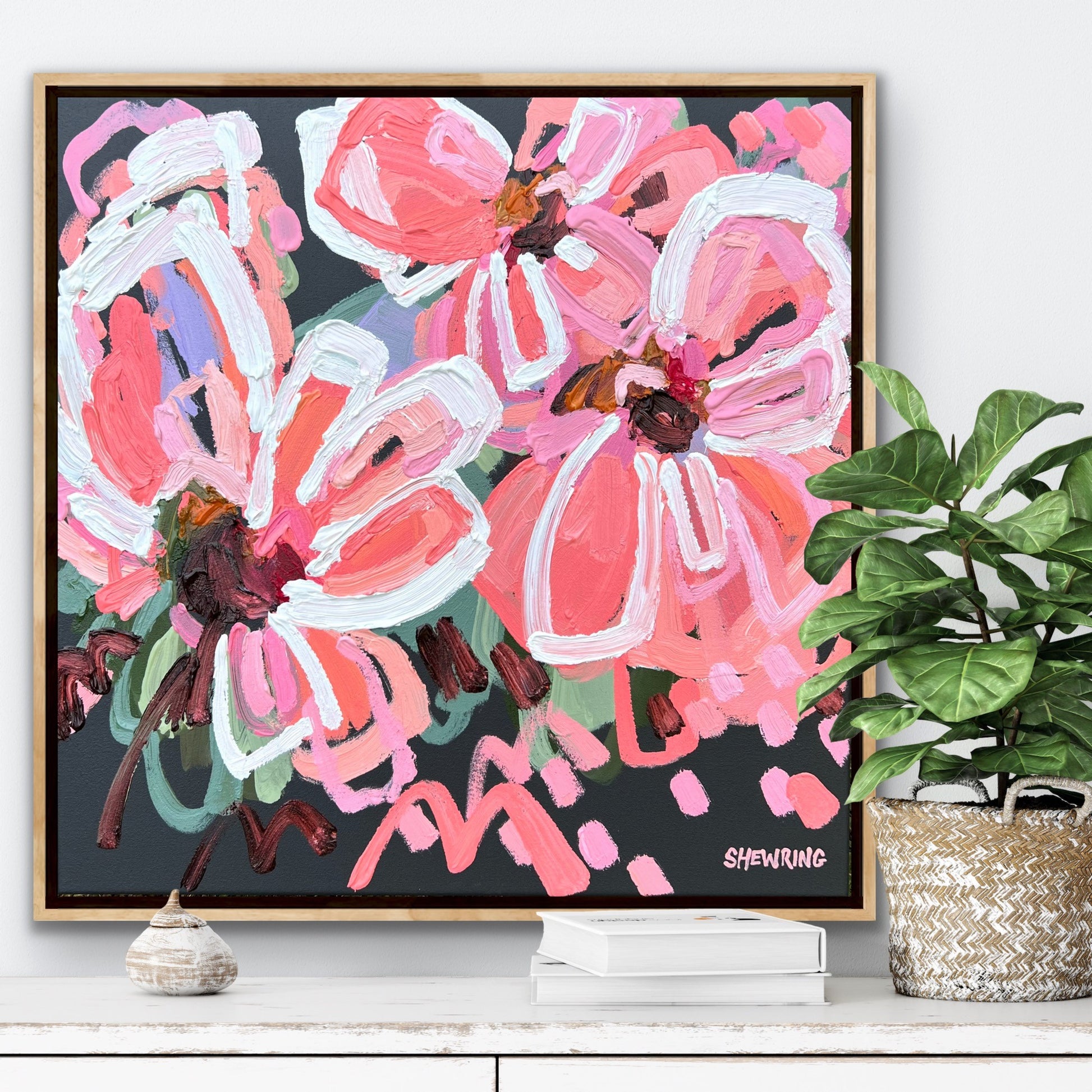 The flowers were created in an expressive style in the colours of love! Eye catching vibrant pinks, delicious apricots, peaches, melons, lilac, sage and olive greens have been painted onto a deep charcoal background that would suit a range of different decors.