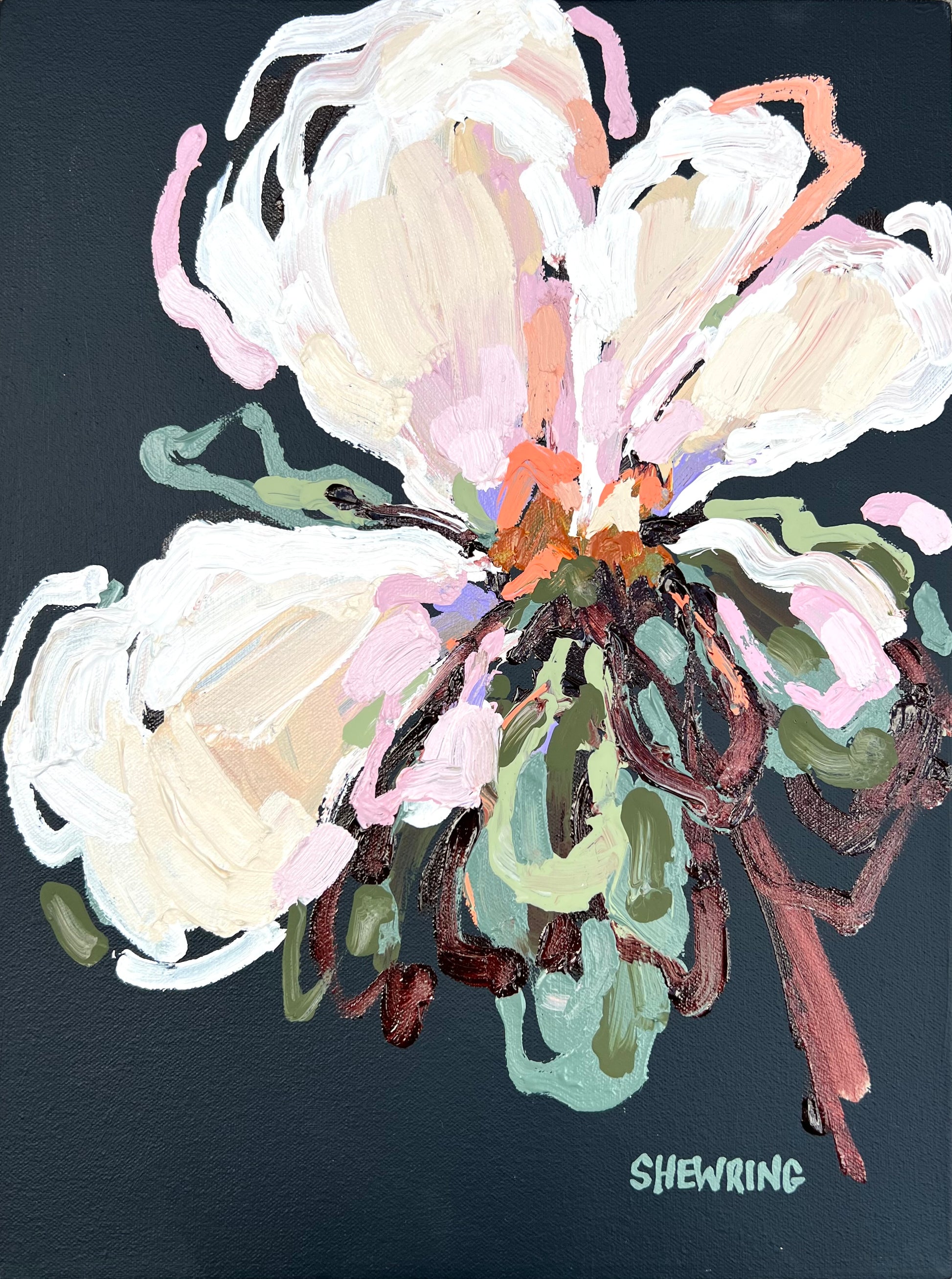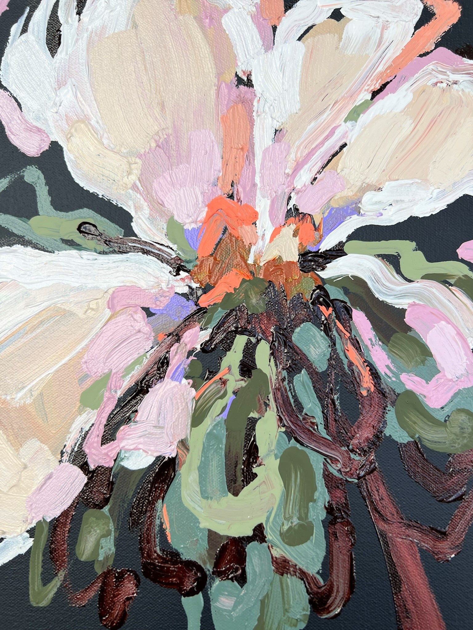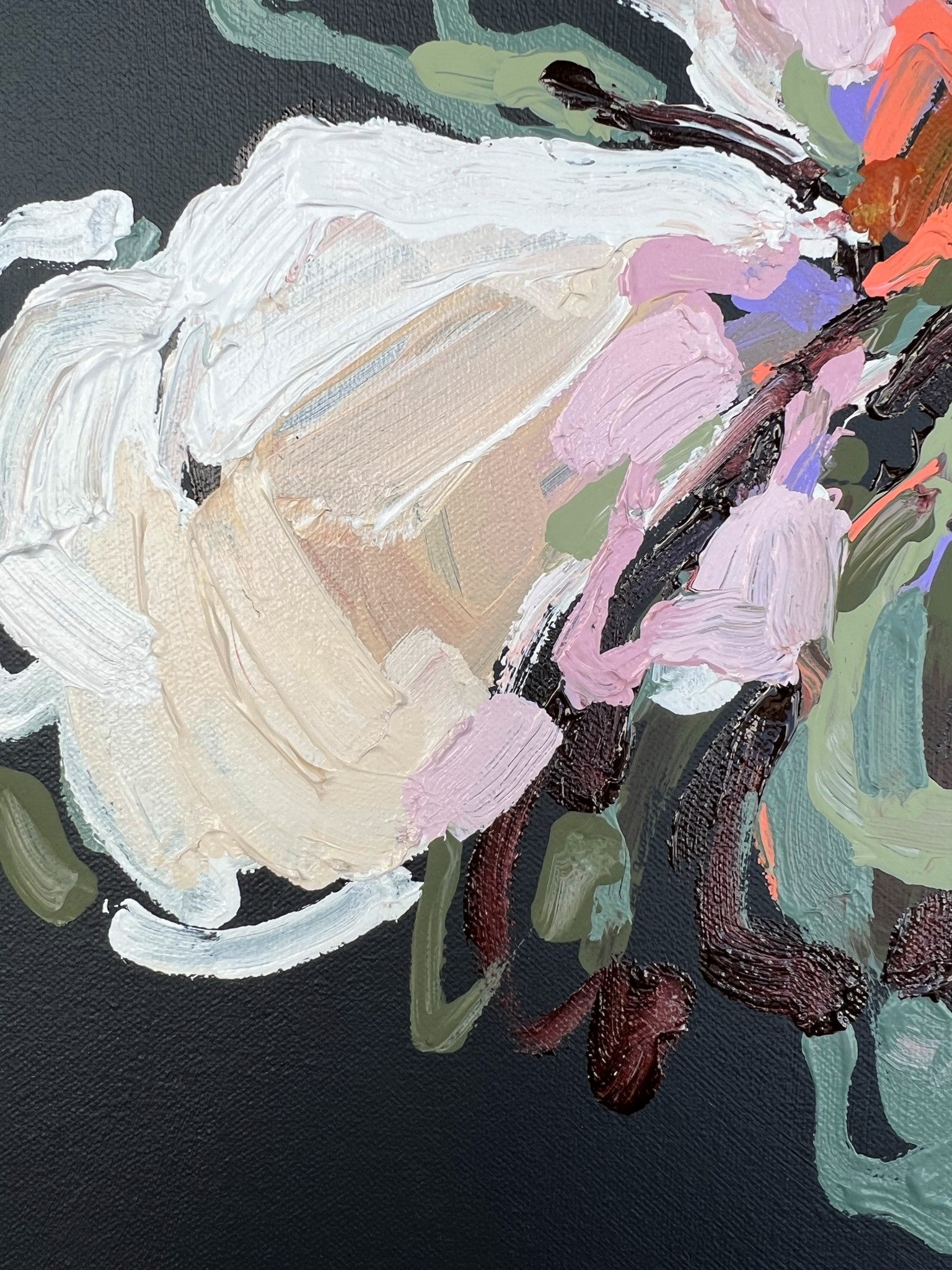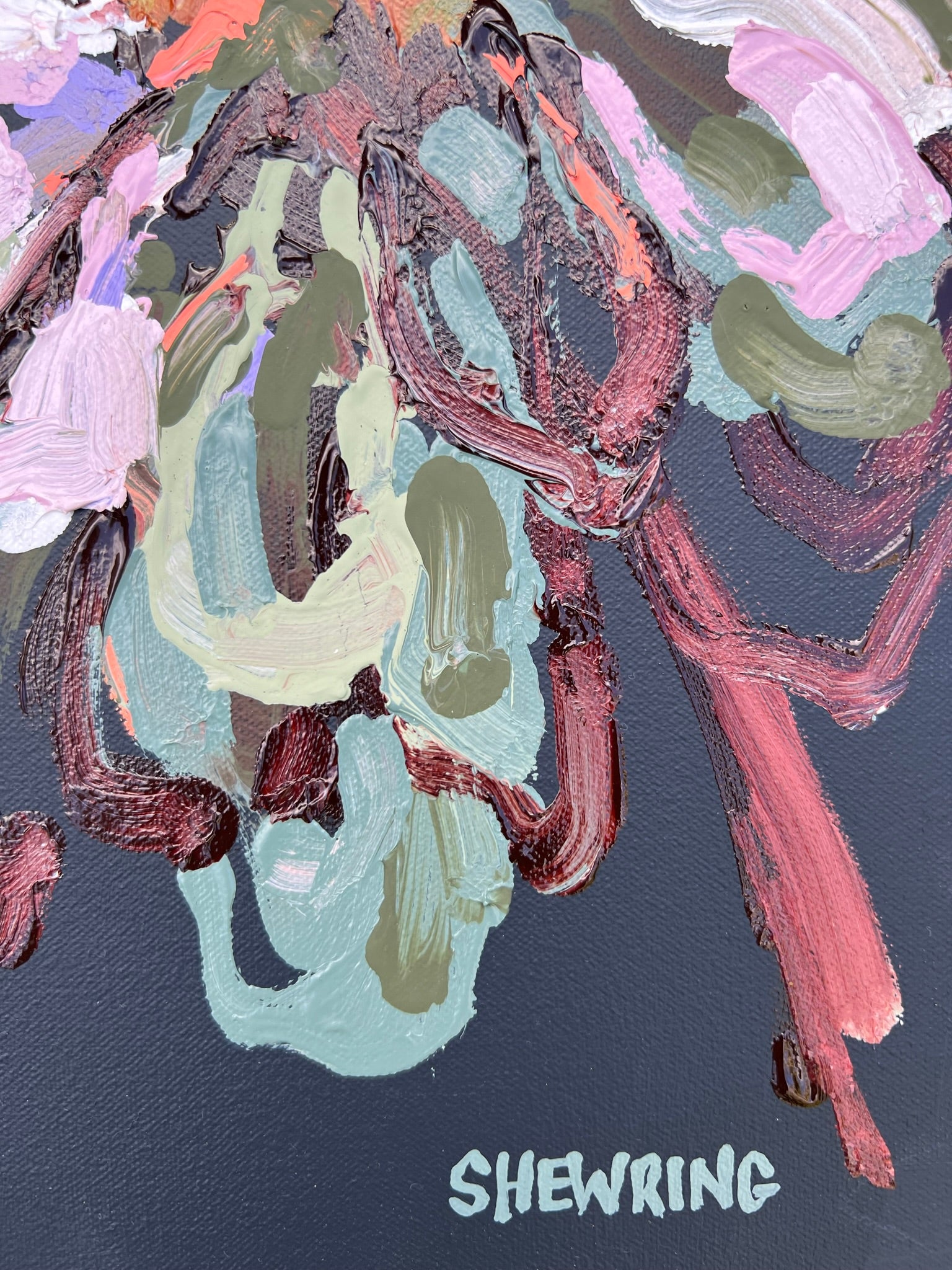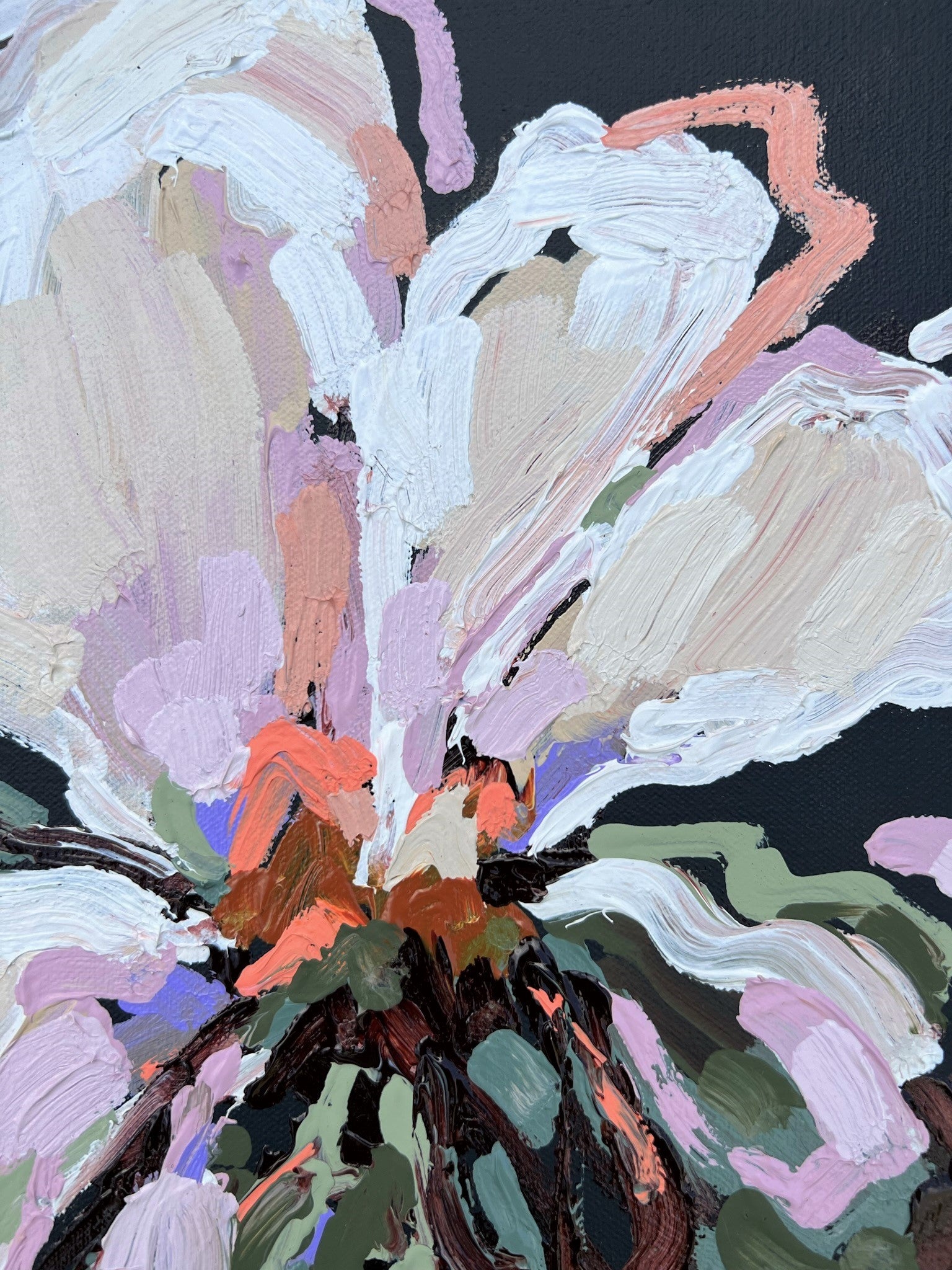 About Love is a beautifully textured flower abstract with gorgeous dusty pinks and creams and lilac, orange tangerine, leather coloured impressions of leaves with bursts of terracotta, melons, sage and olive greens. This painting has expressive individual brushstrokes that bring it to life!