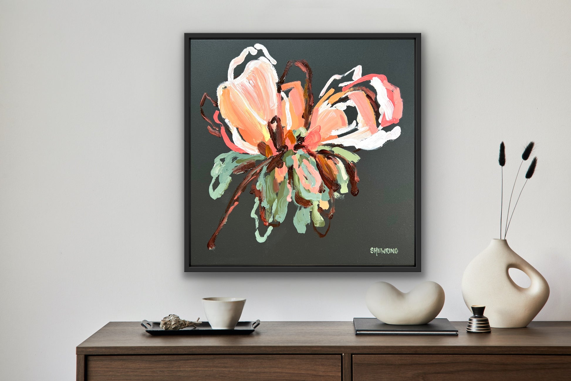 Framed in black painted timber grain float frame.