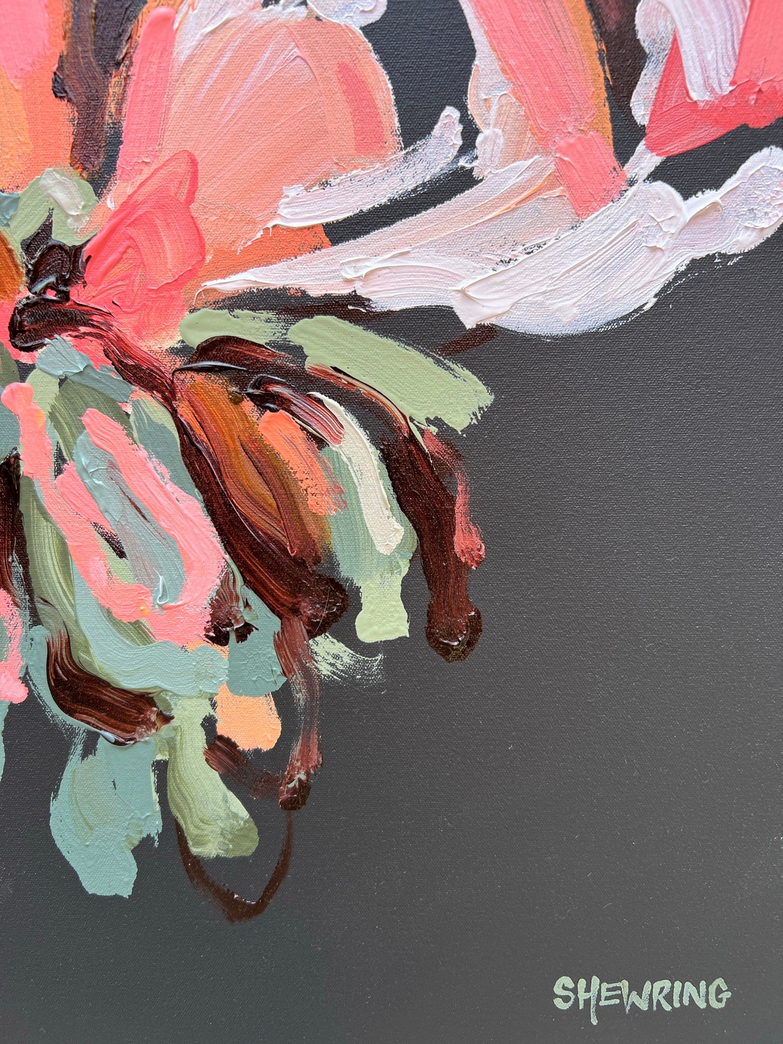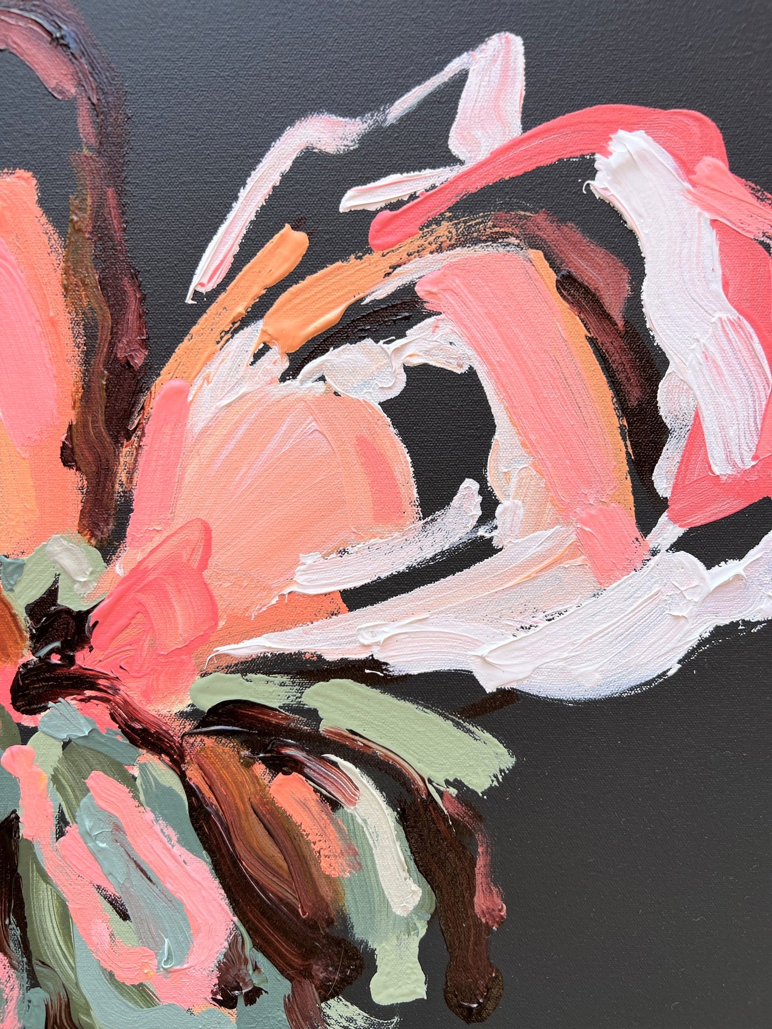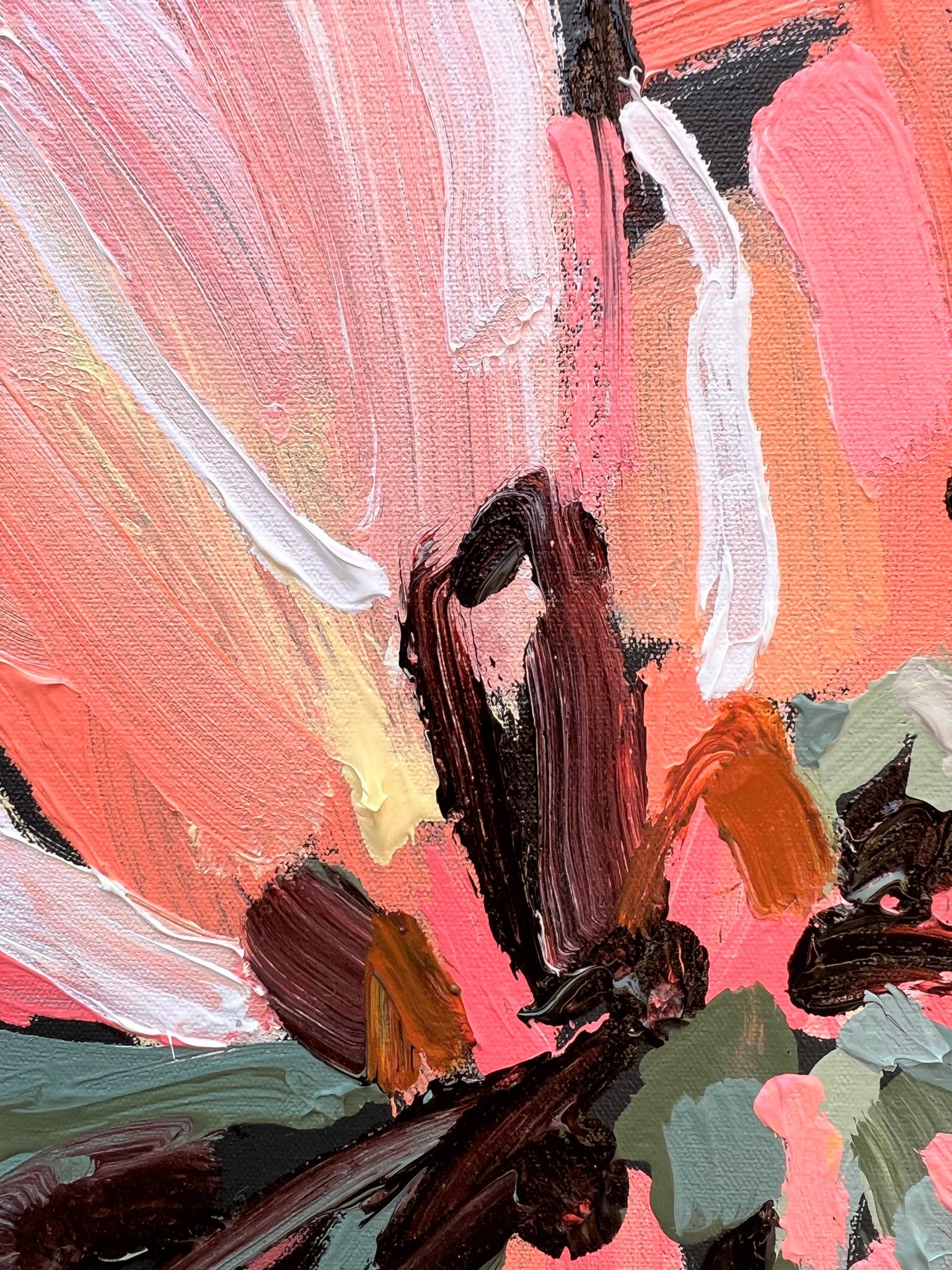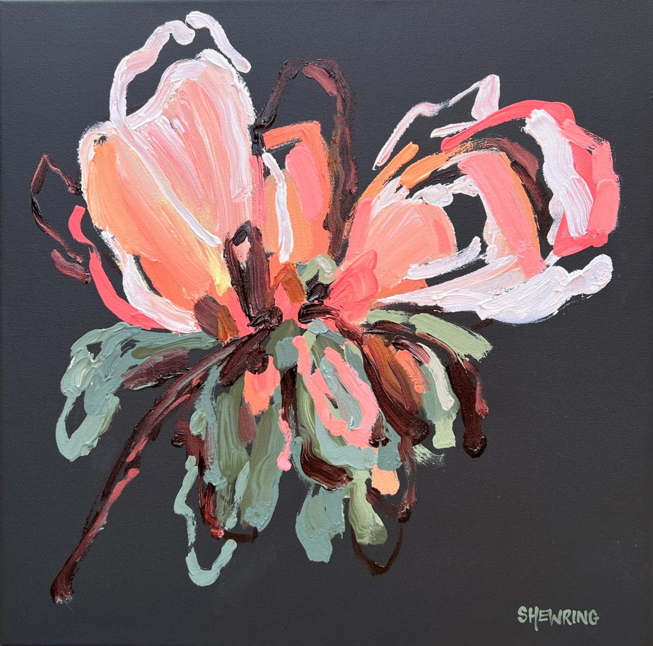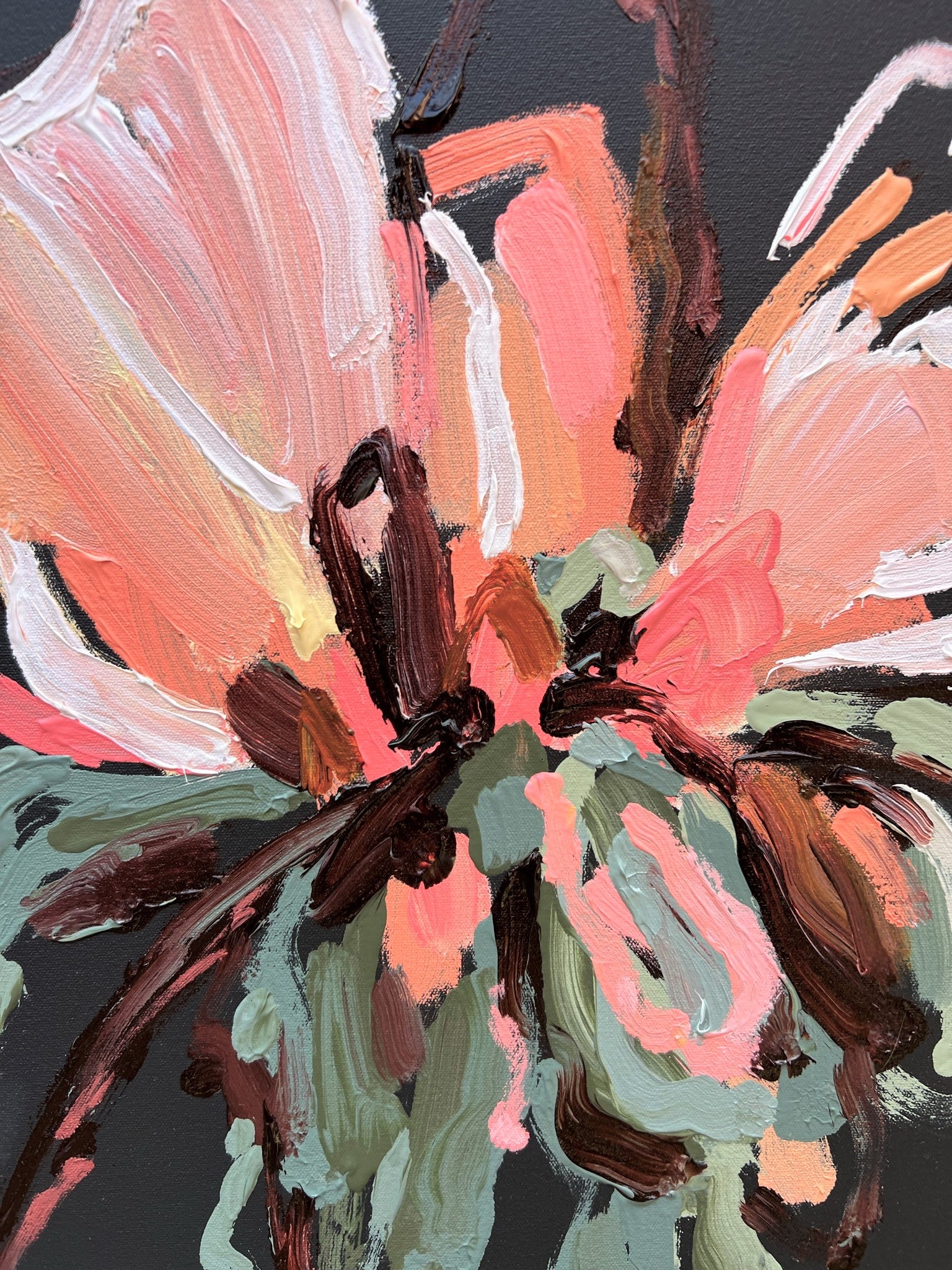 Always My Love is a beautifully textured flower abstract with gorgeous peach, apricot and watermelon colours with a touch of lemon yellow. Chocolate coloured impressions of leaves with bursts of sage and olive greens. This painting has expressive individual brushstrokes that bring it to life!