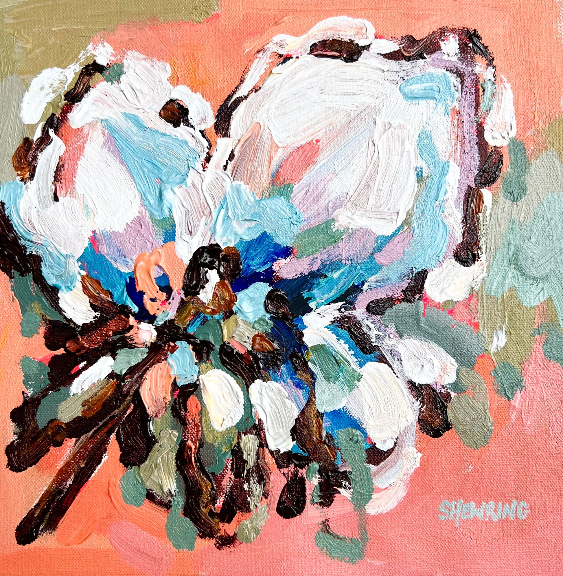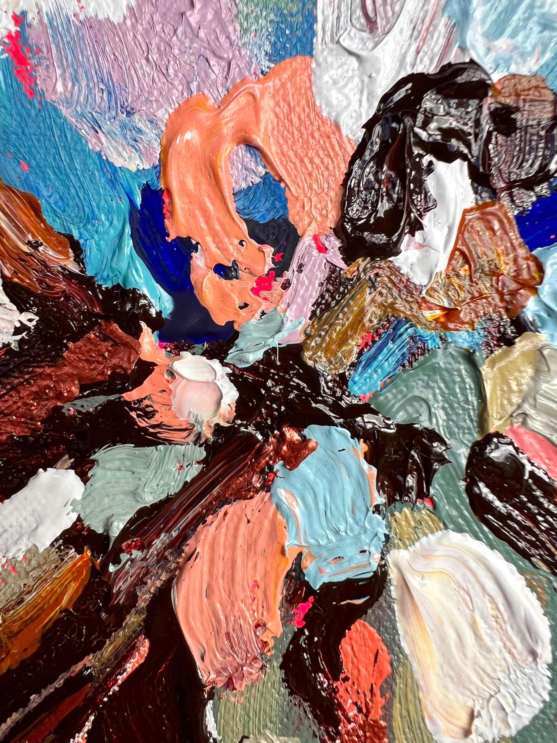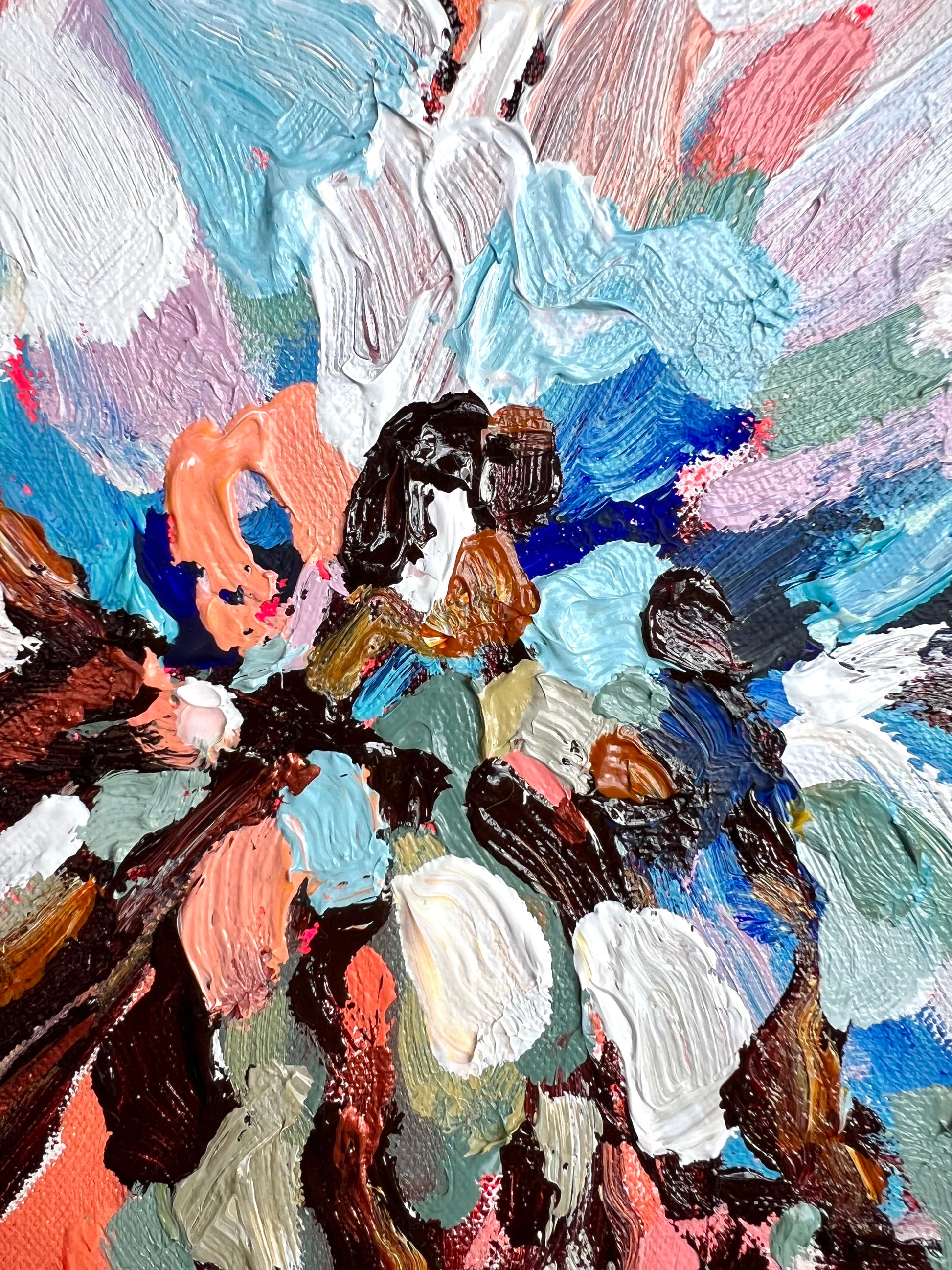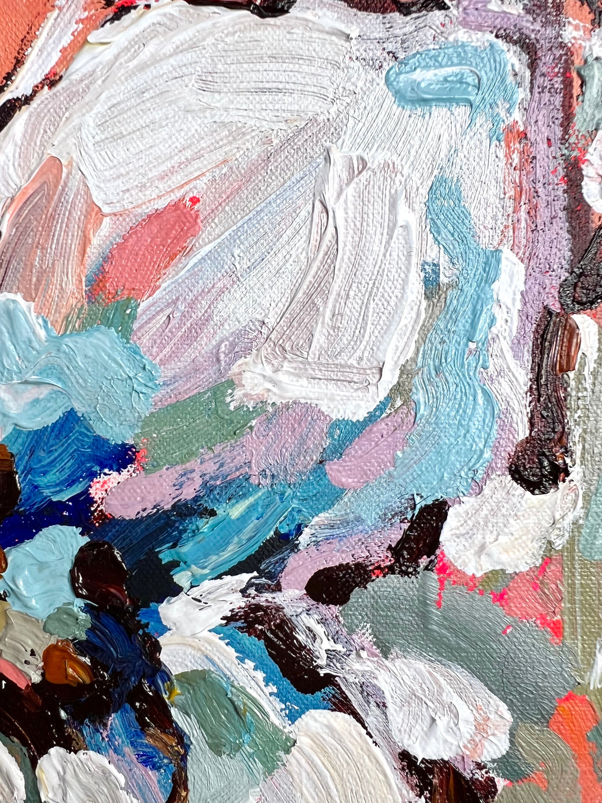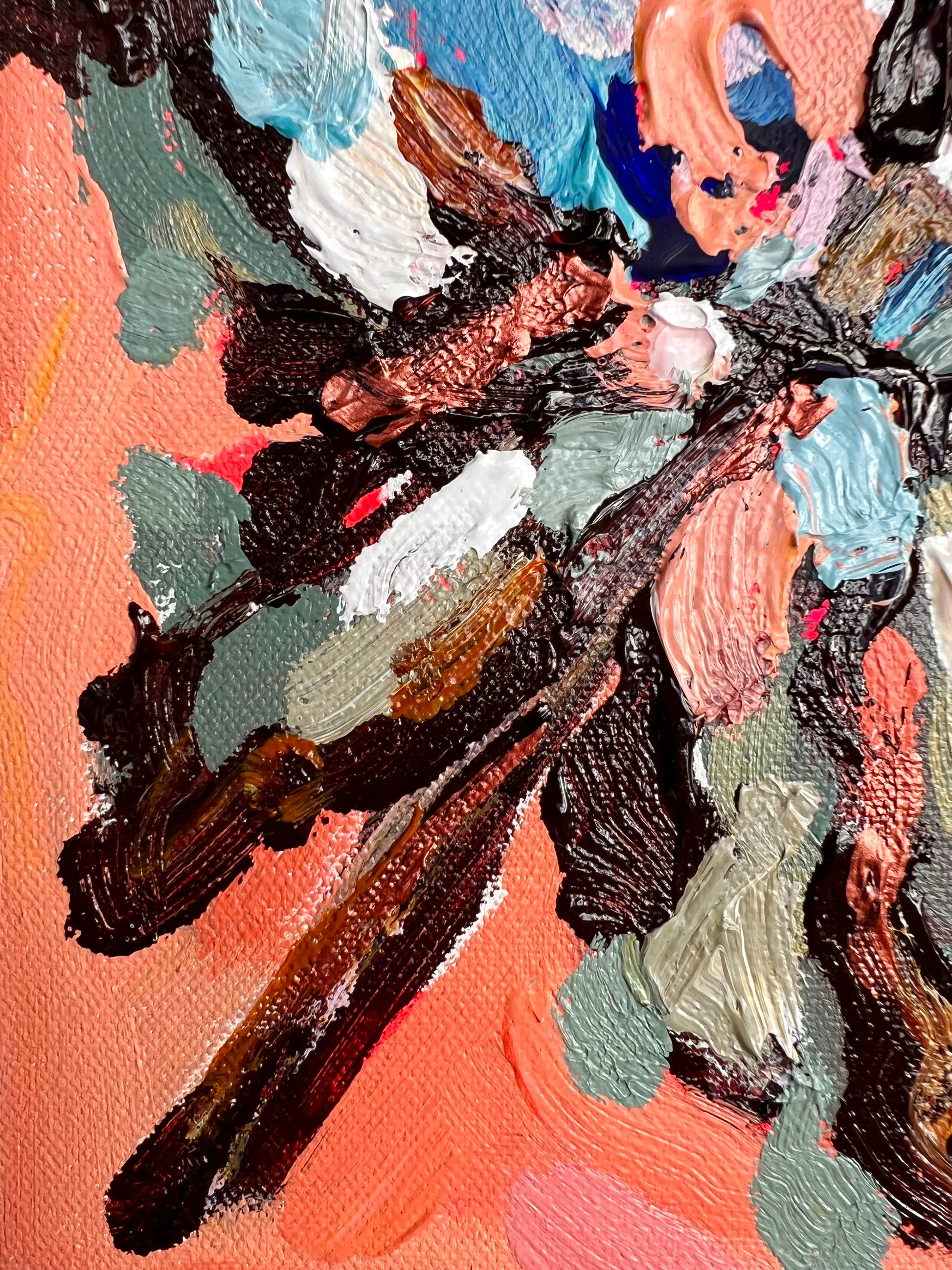 Aromatic Blue is a textured flower abstract with beautiful shades of tropical sea blues contrasted with orange tangerine, dusty pinks, chocolate coloured impressions of leaves with bursts of sage and olive greens and a sparkle of bronze. This painting has expressive individual brushstrokes that bring it to life!