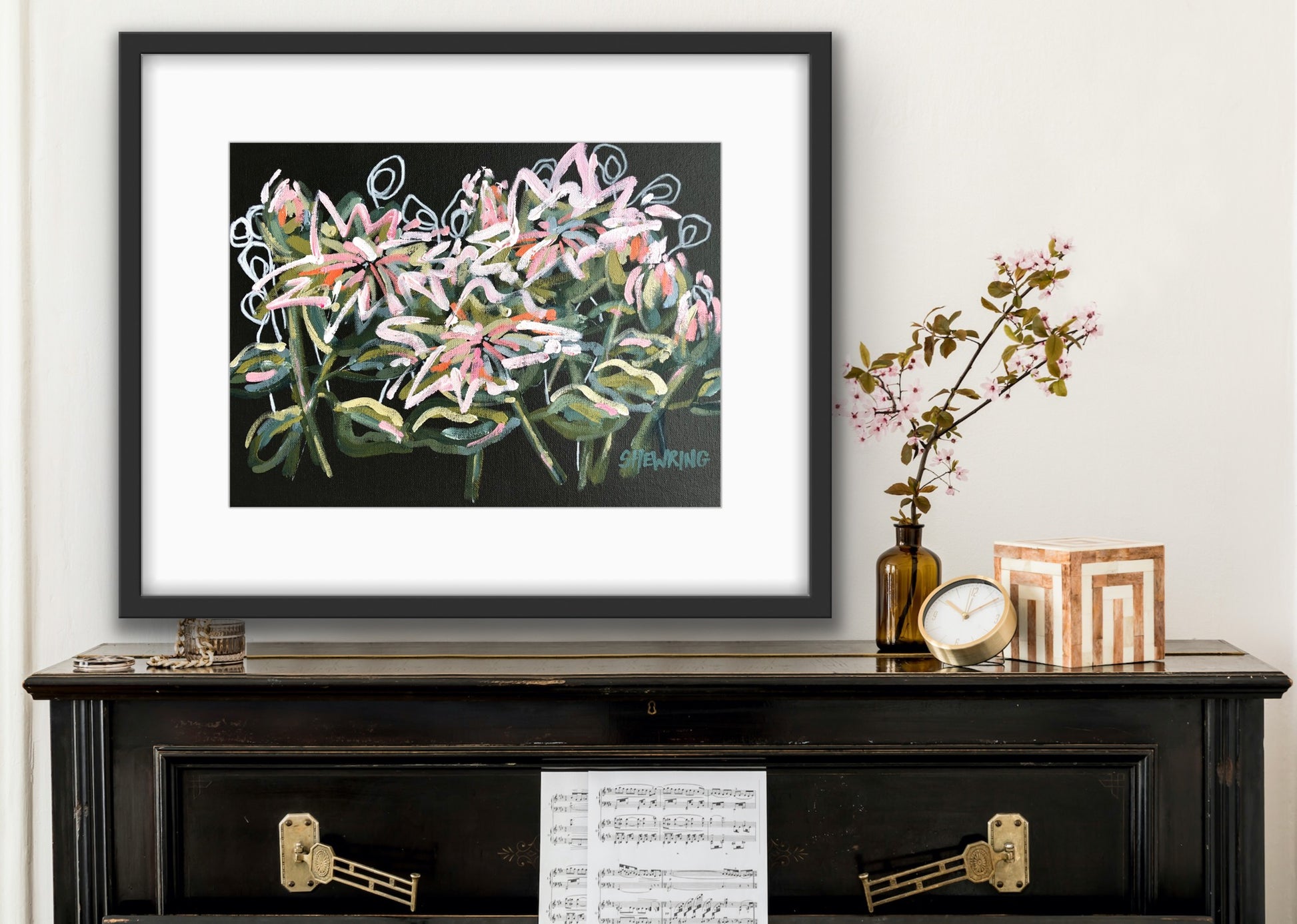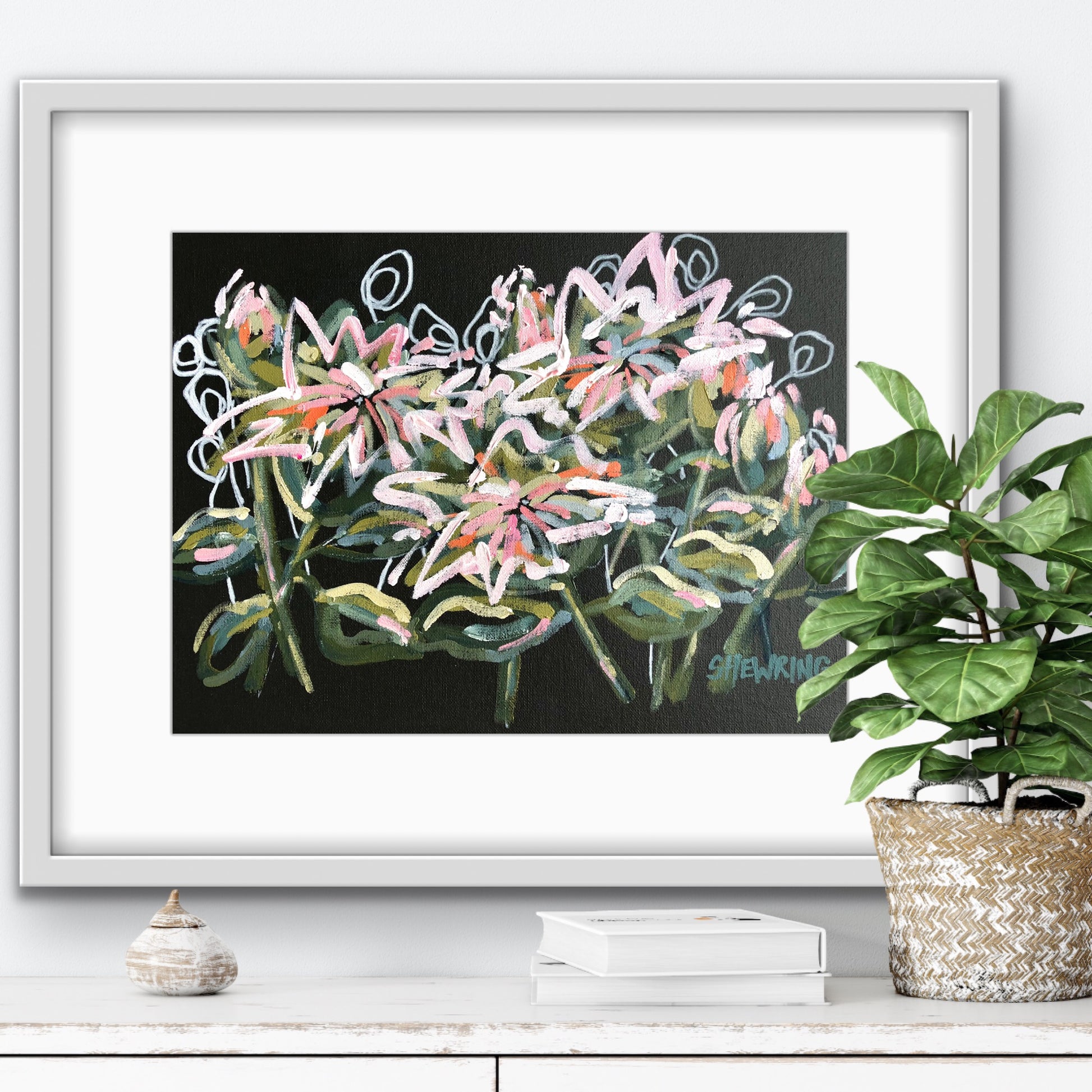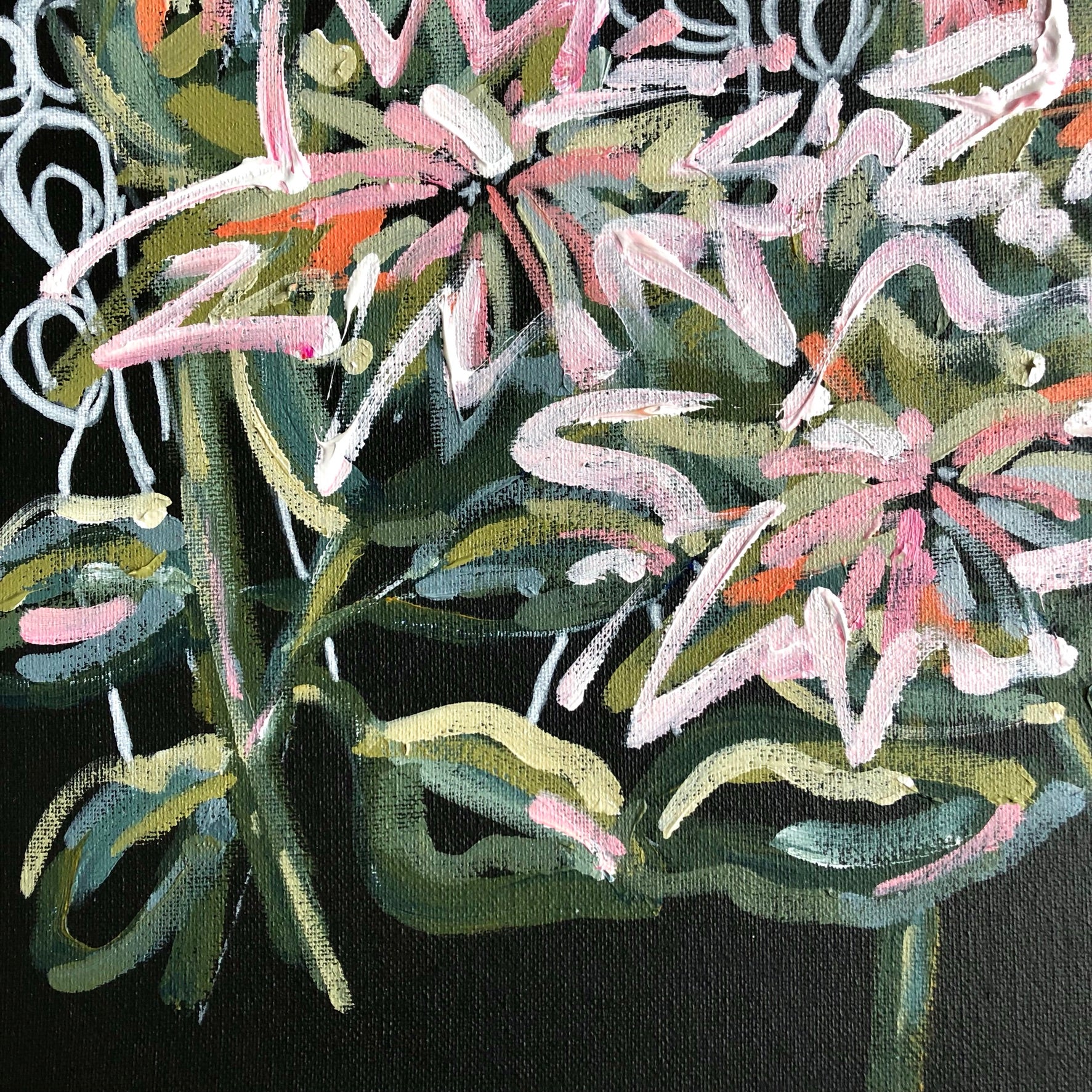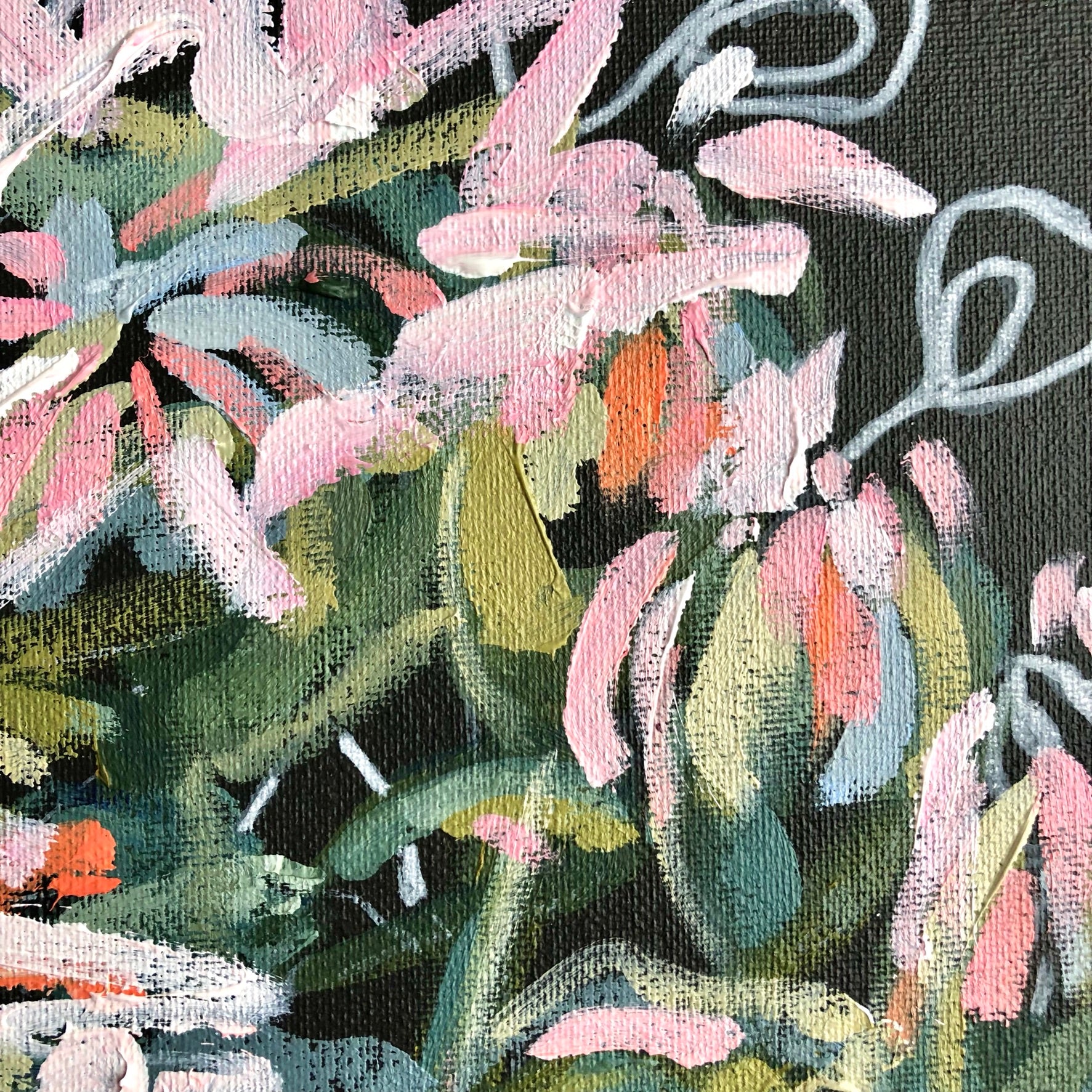 This painting has the sunset colours of blush pink and tangerine orange with olive and warm blue green foliage.
