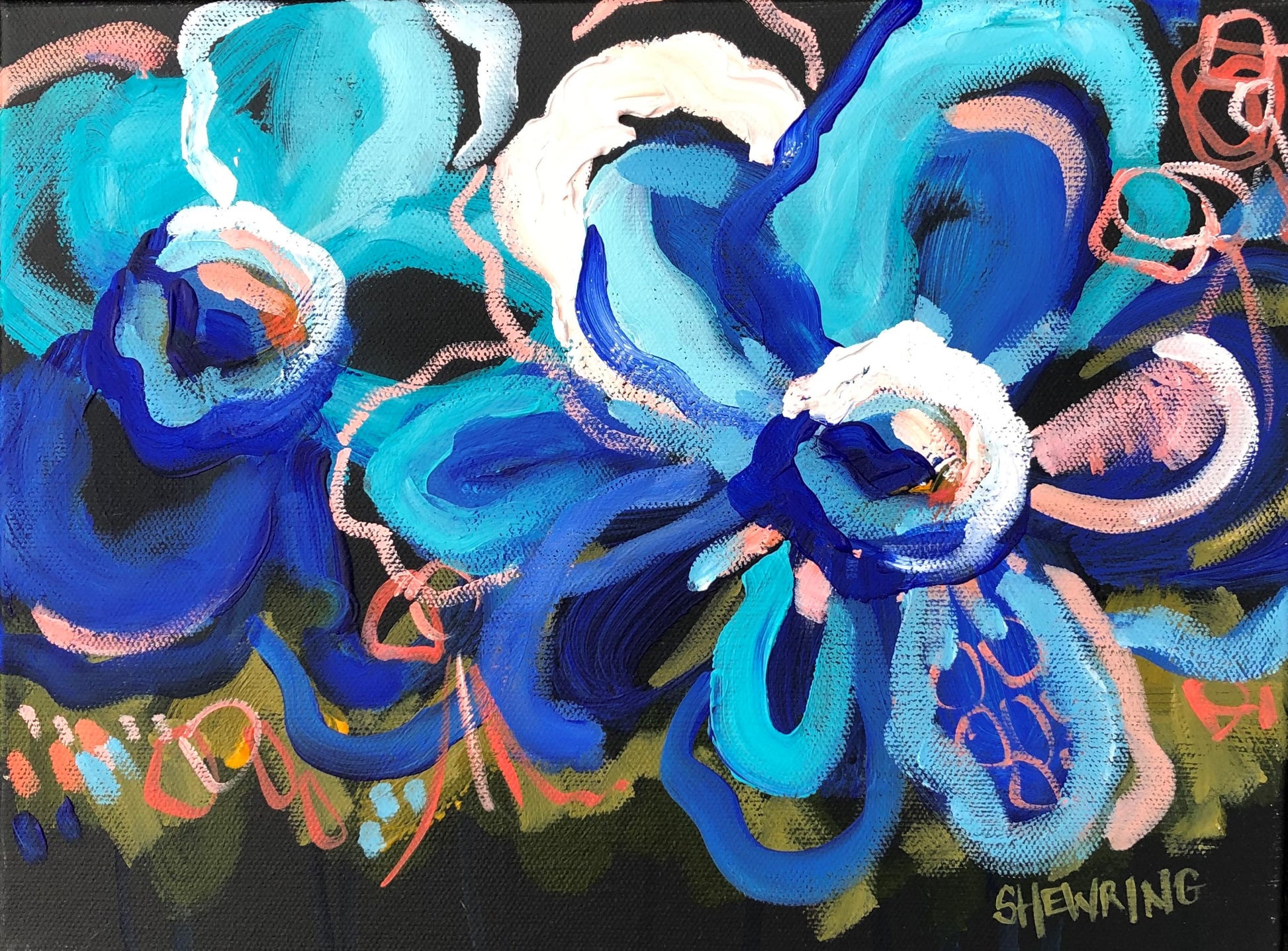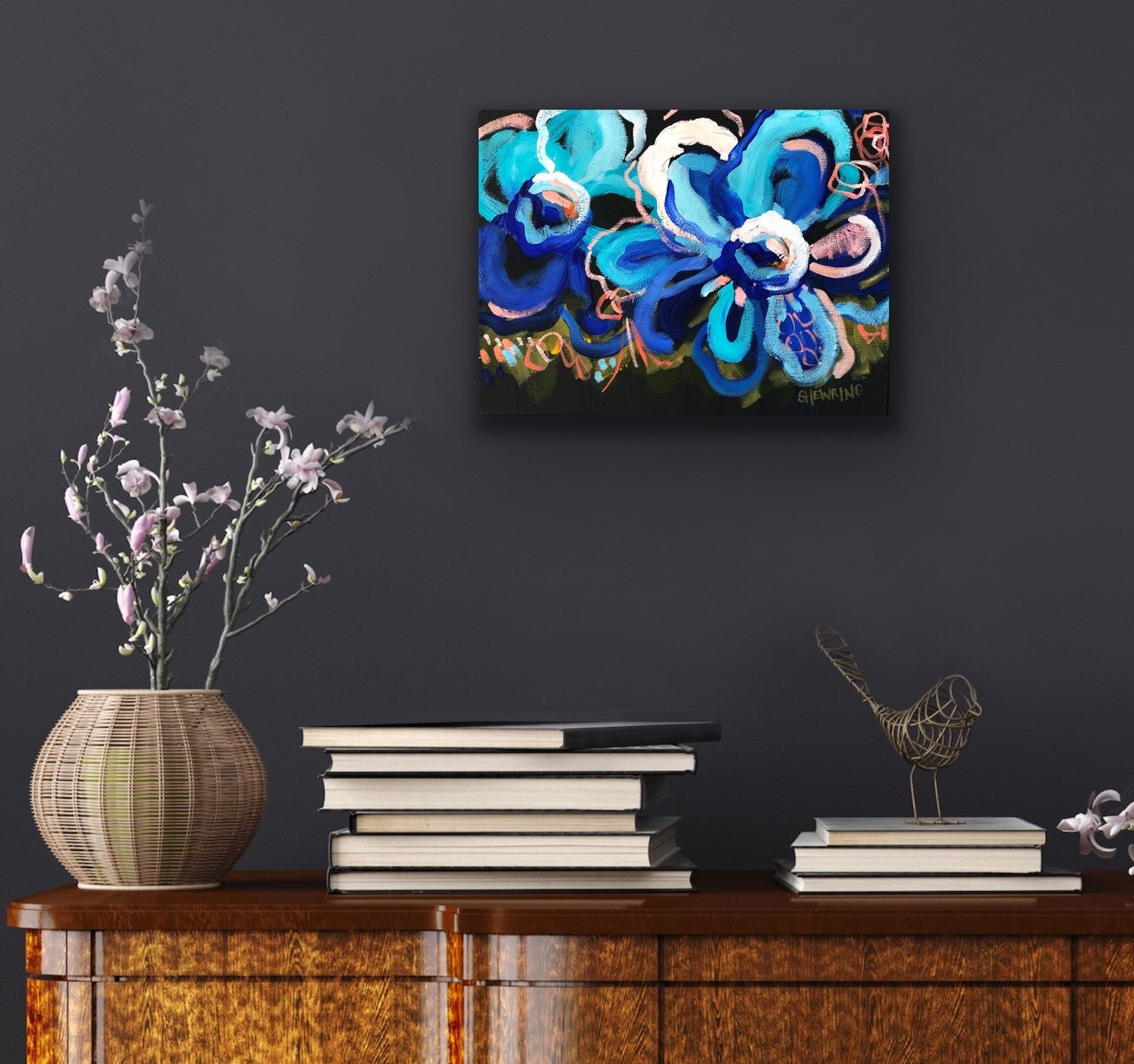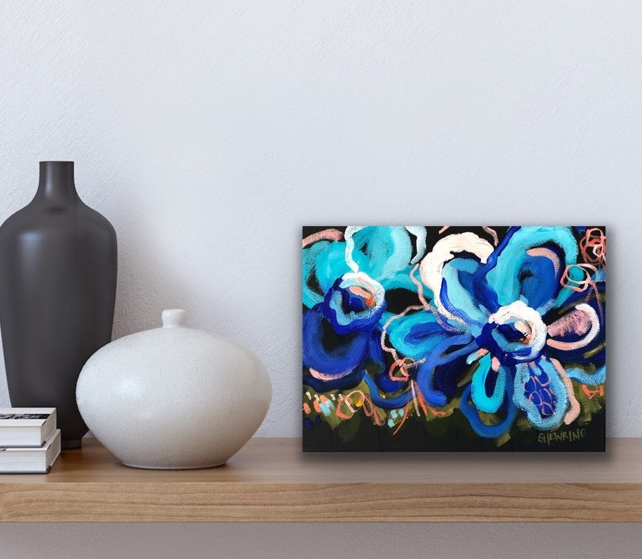 Painting abstract flowers and foliage is such a passion of mine, I adore their awesome colours. In this painting I place their beauty over a dramatic deep coloured background. Flowers are a symbol of new life, abundance and beauty, they bring such joy into my home. I want to share the love and good positive vibes they carry into your room.