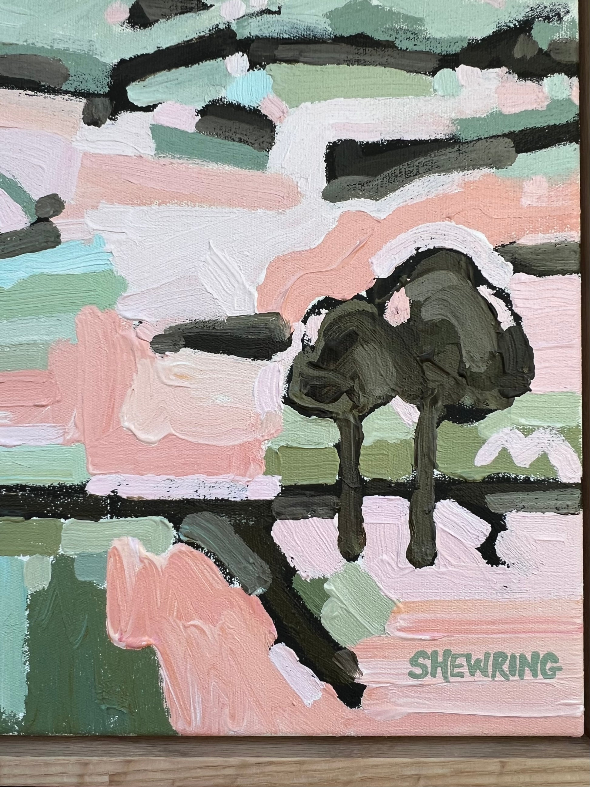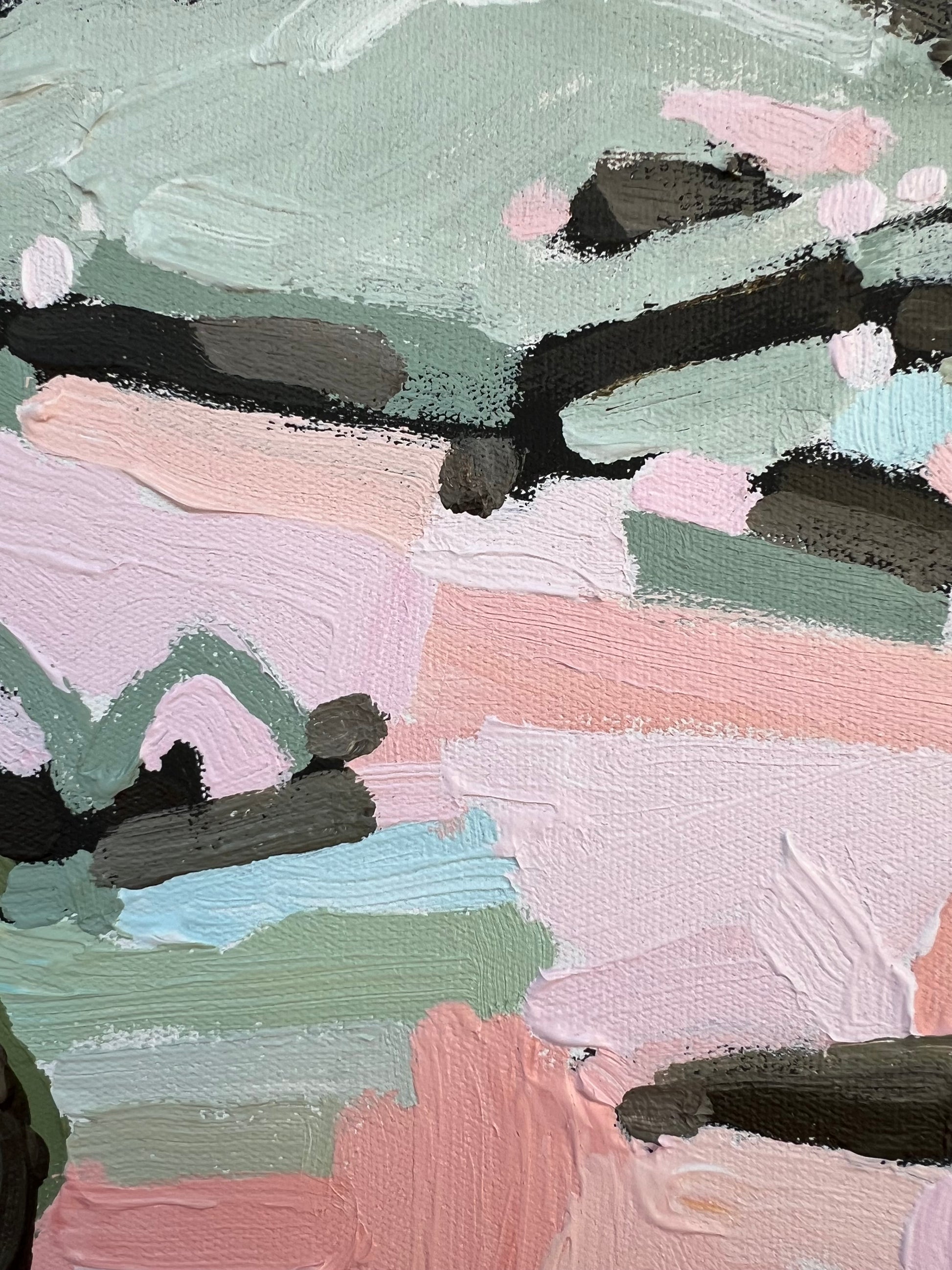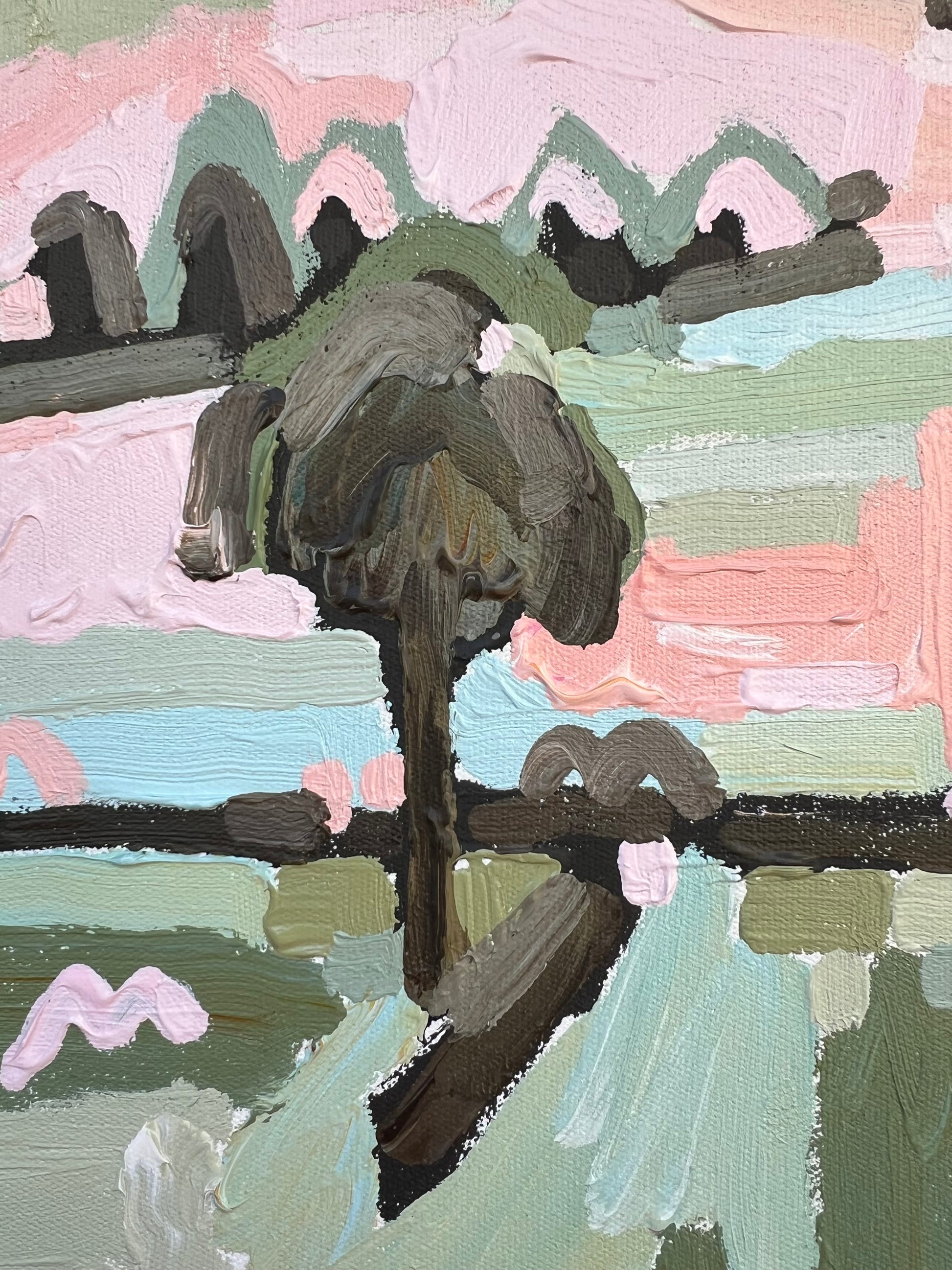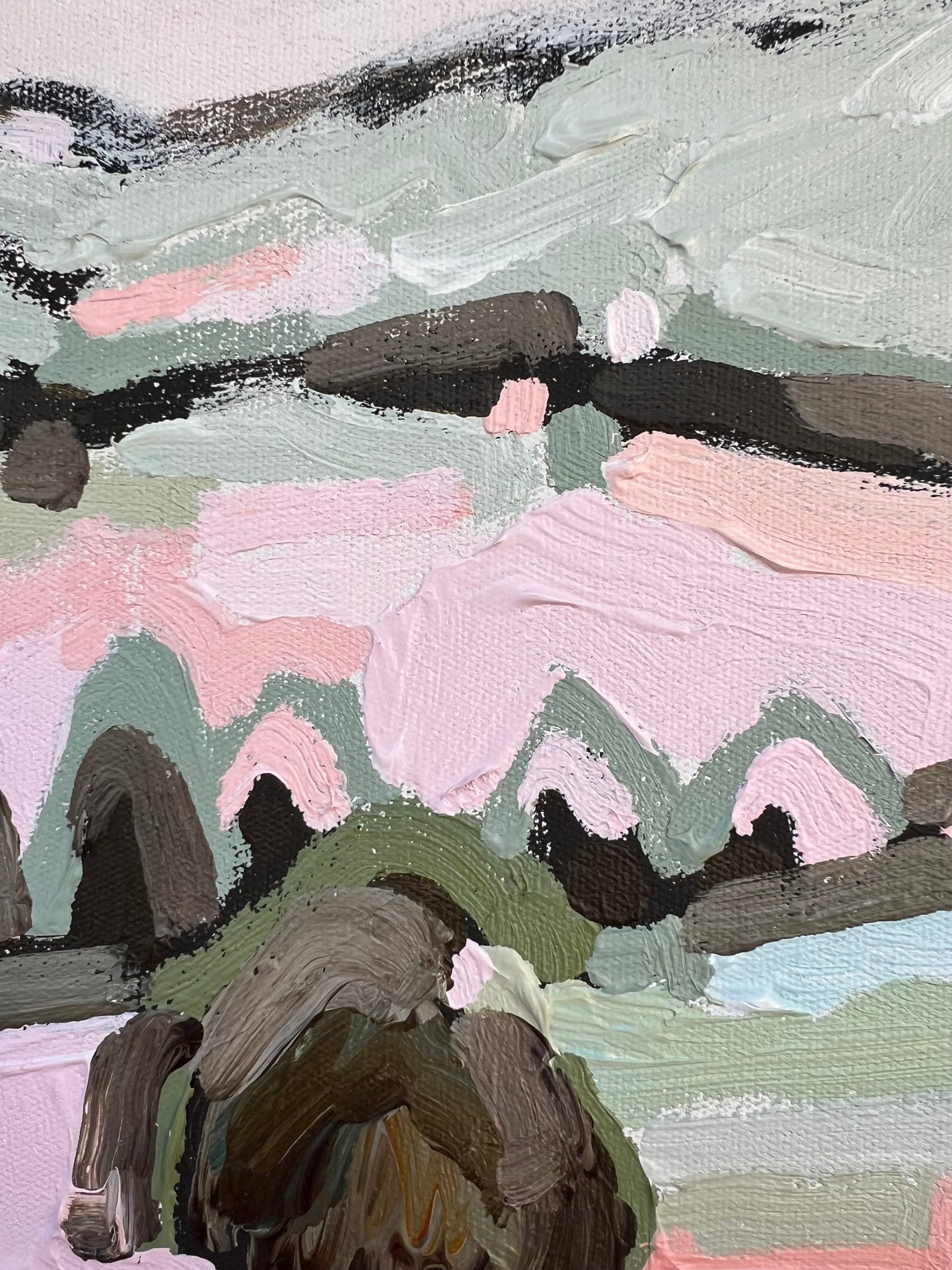 Capturing the warmth of the day and the peaceful feeling of immersing yourself into the countryside this artwork has been painted with expressive brushstrokes in a palette of beautiful lush greens and gorgeous pinks that bring it to life!