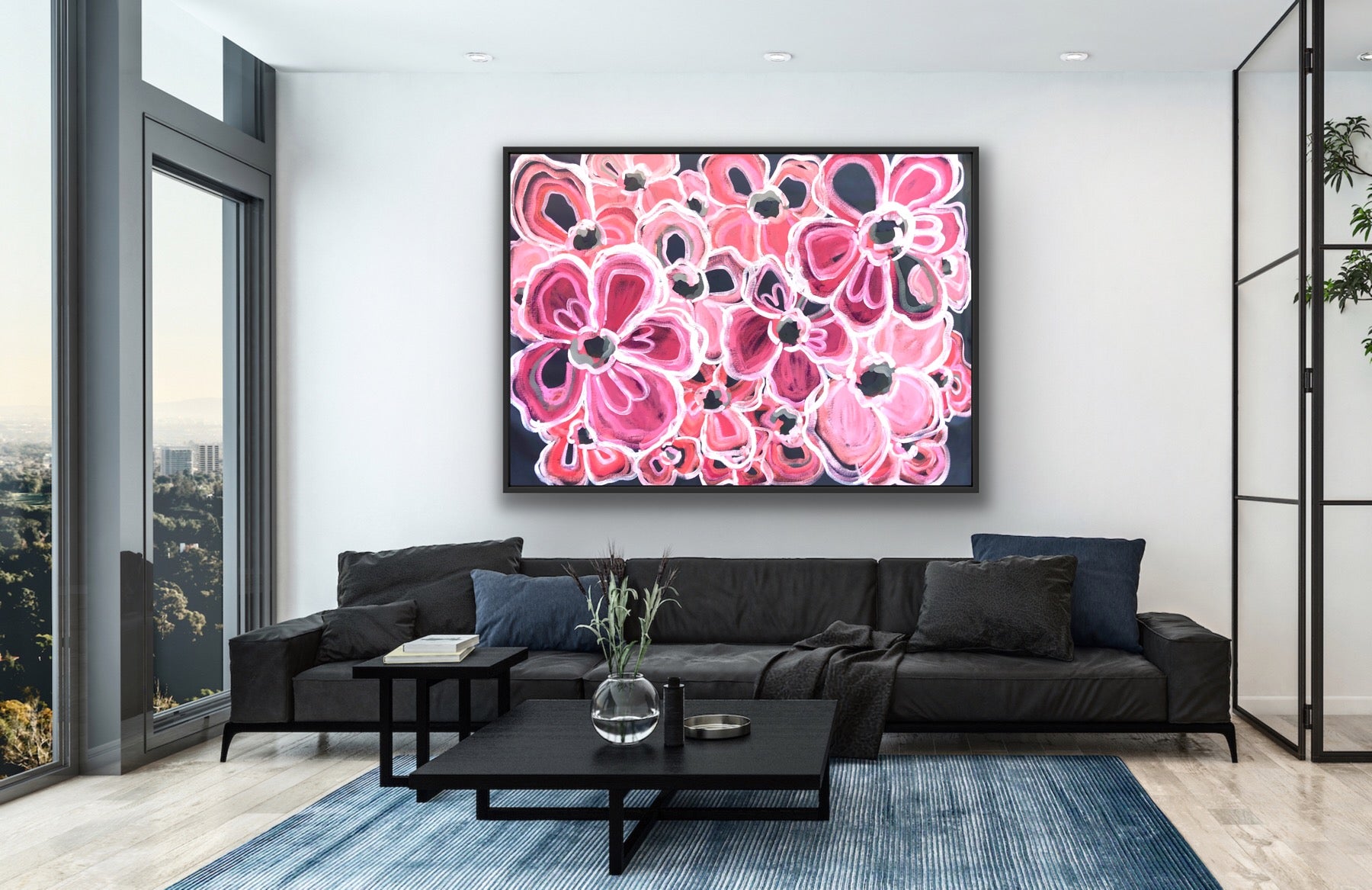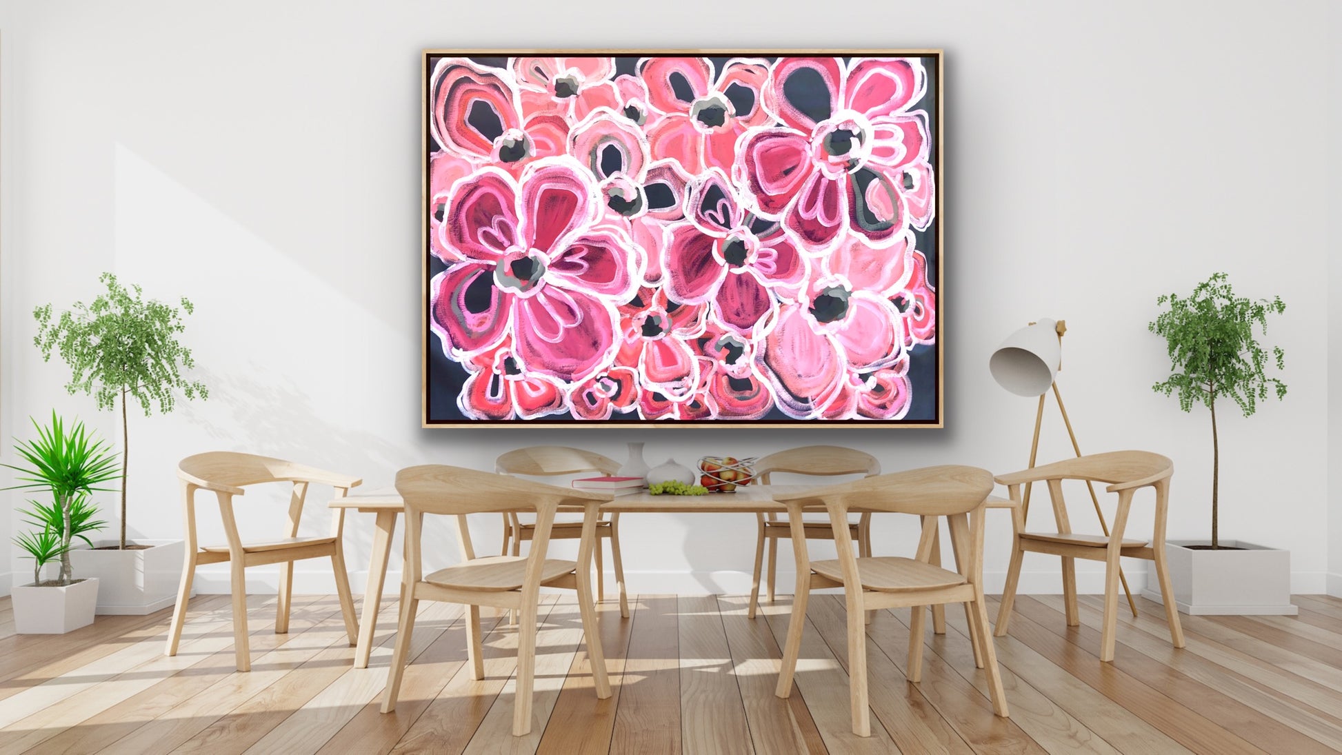 Big Love is a bright flower abstract with delicious colours of berries and watermelon created during the warm summer months. This painting has expressive individual brushstrokes that bring it to life!