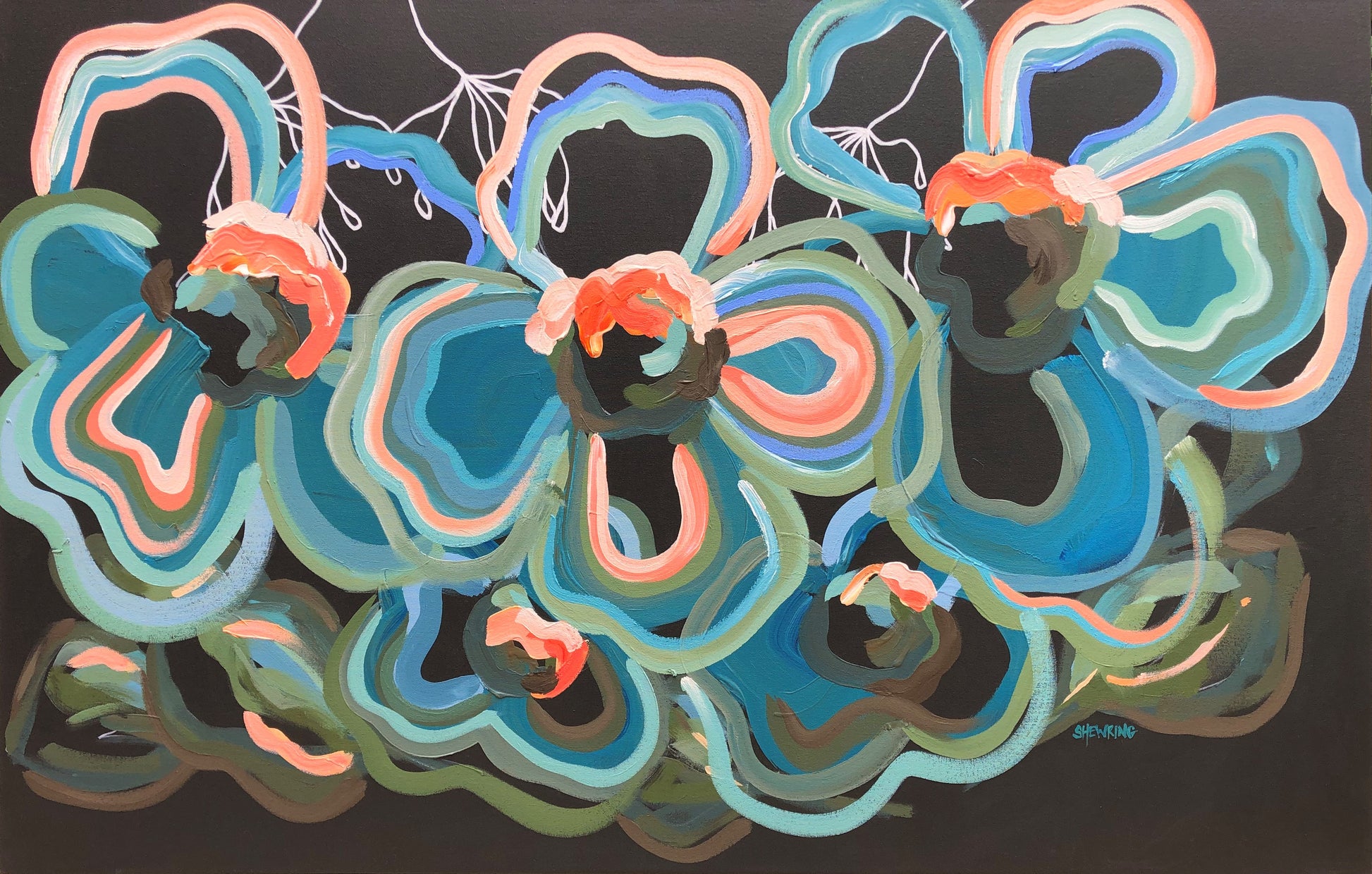 The abstract flowers are painted in blue teal and olive greens with tangerine orange highlights.