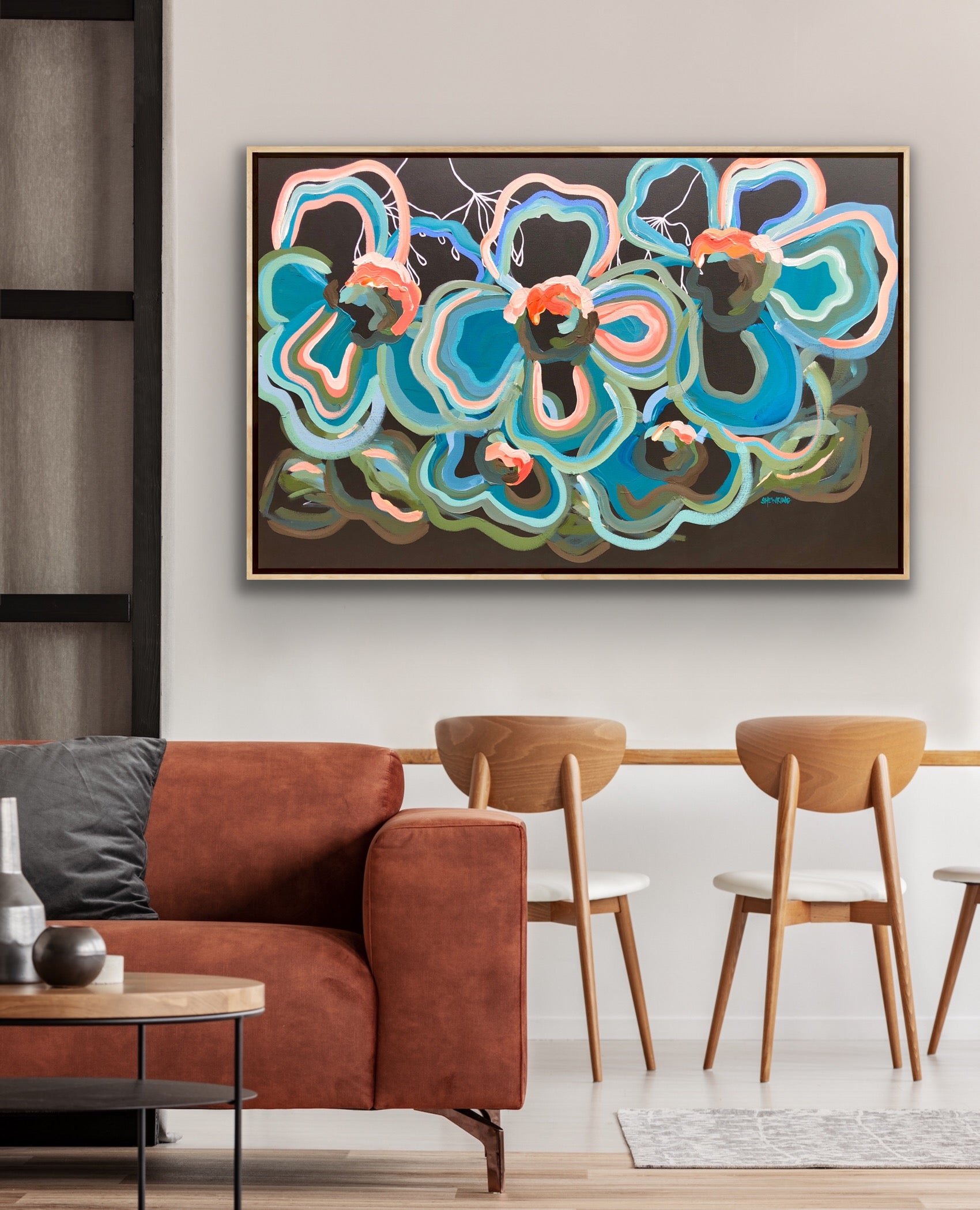 Blue Botanica is a bright and bold abstract with re-imagined shapes and colours from nature. This painting has expressive individual brushstrokes that bring it to life!