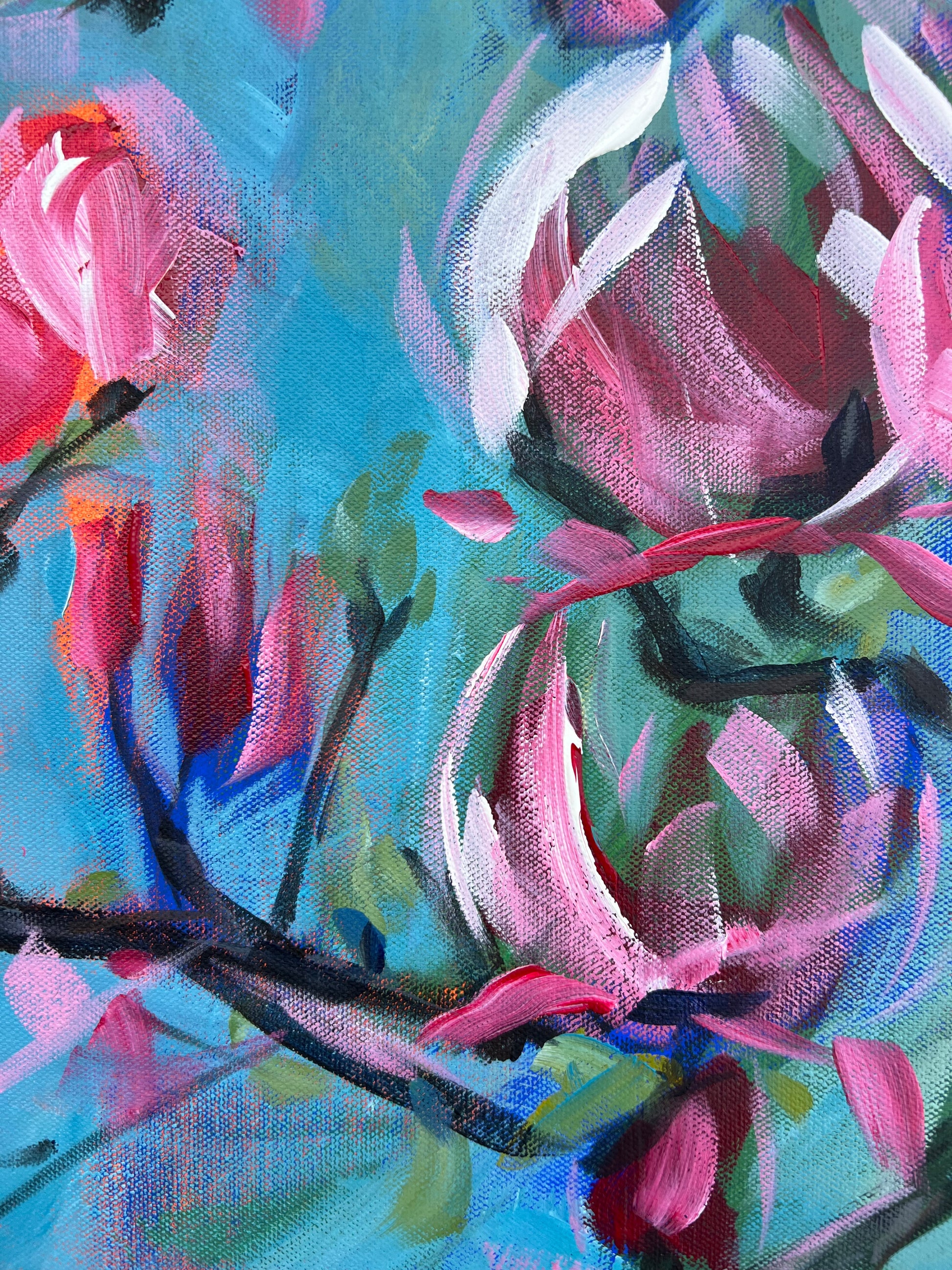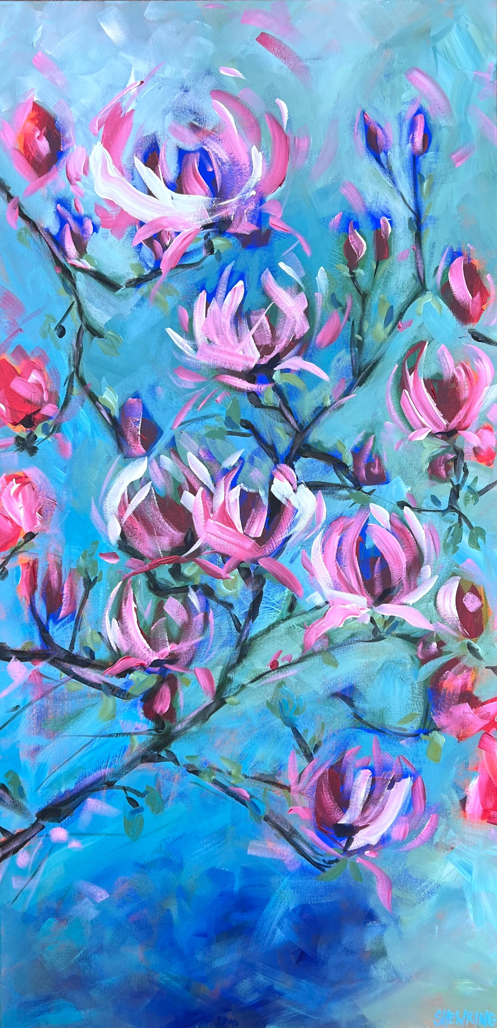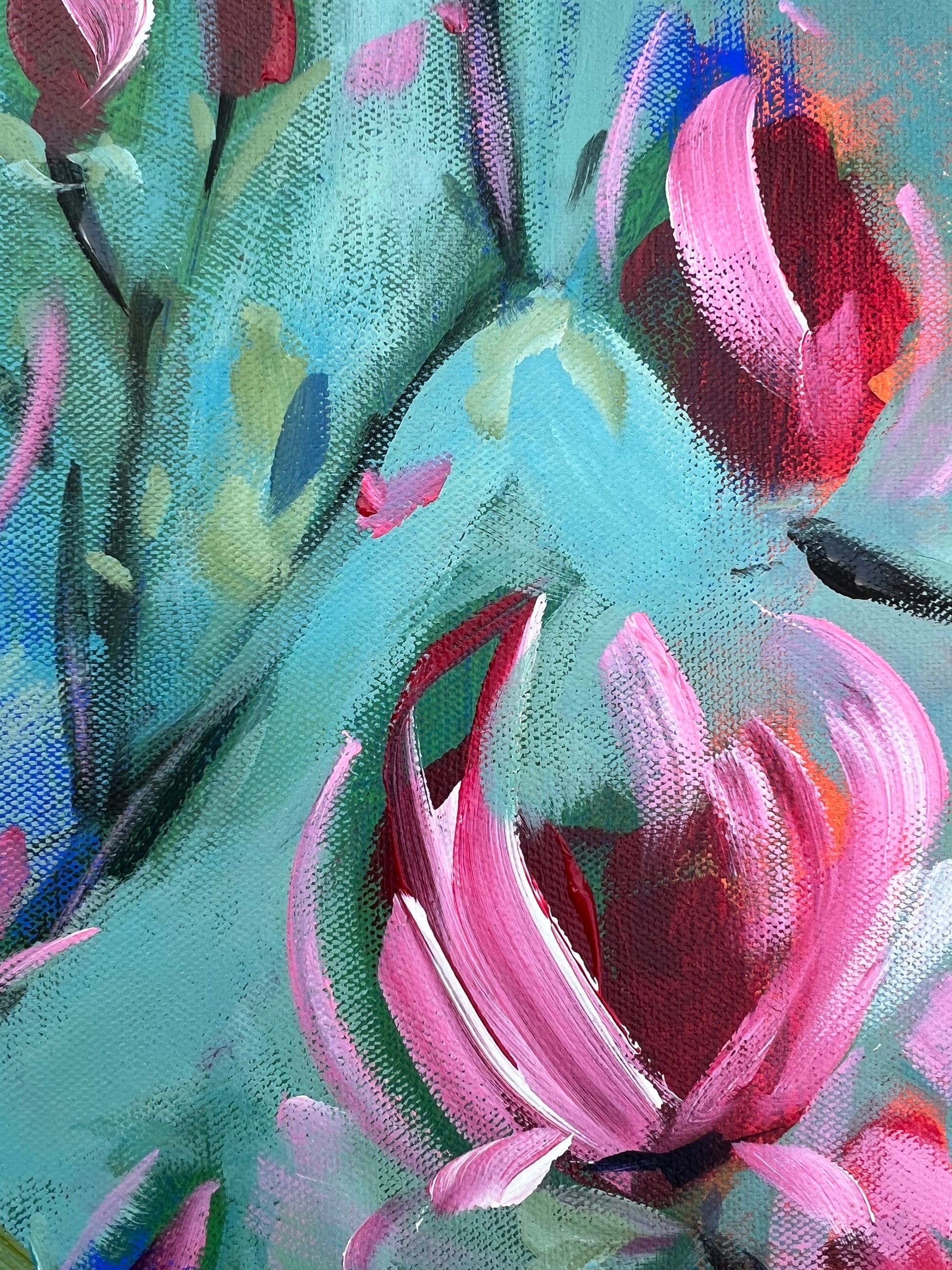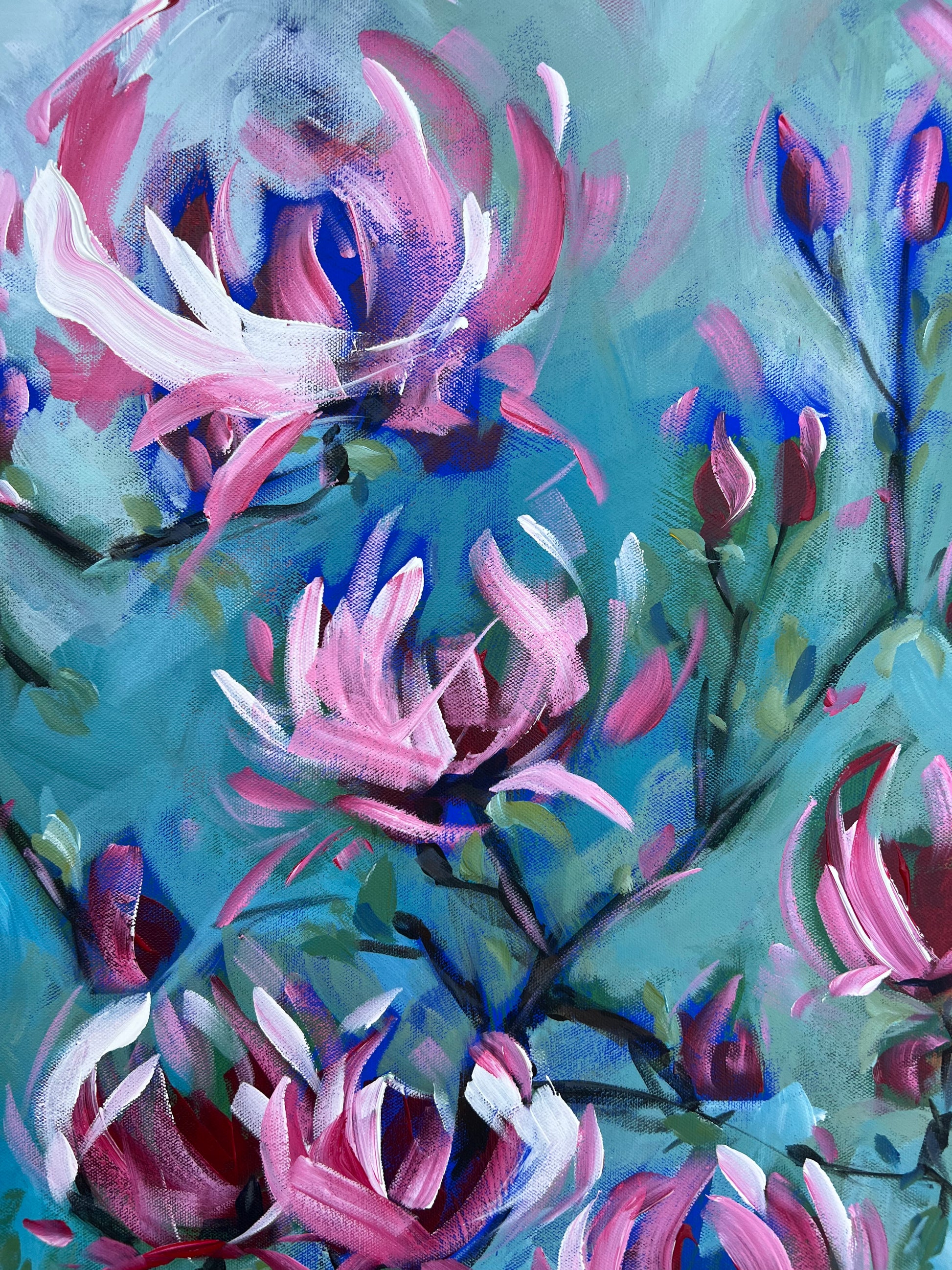 I am obsessed with colour and nature! Outside in the natural environment is where I spend my time sketching the organic forms that surround me. I take them back to my studio where I abstract the beauty and vibrancy of the experience into my paintings. What excites me is creating compositions using a luminous mix of rich colours and texture bringing the outdoors inside feeling happiness from connecting with nature.