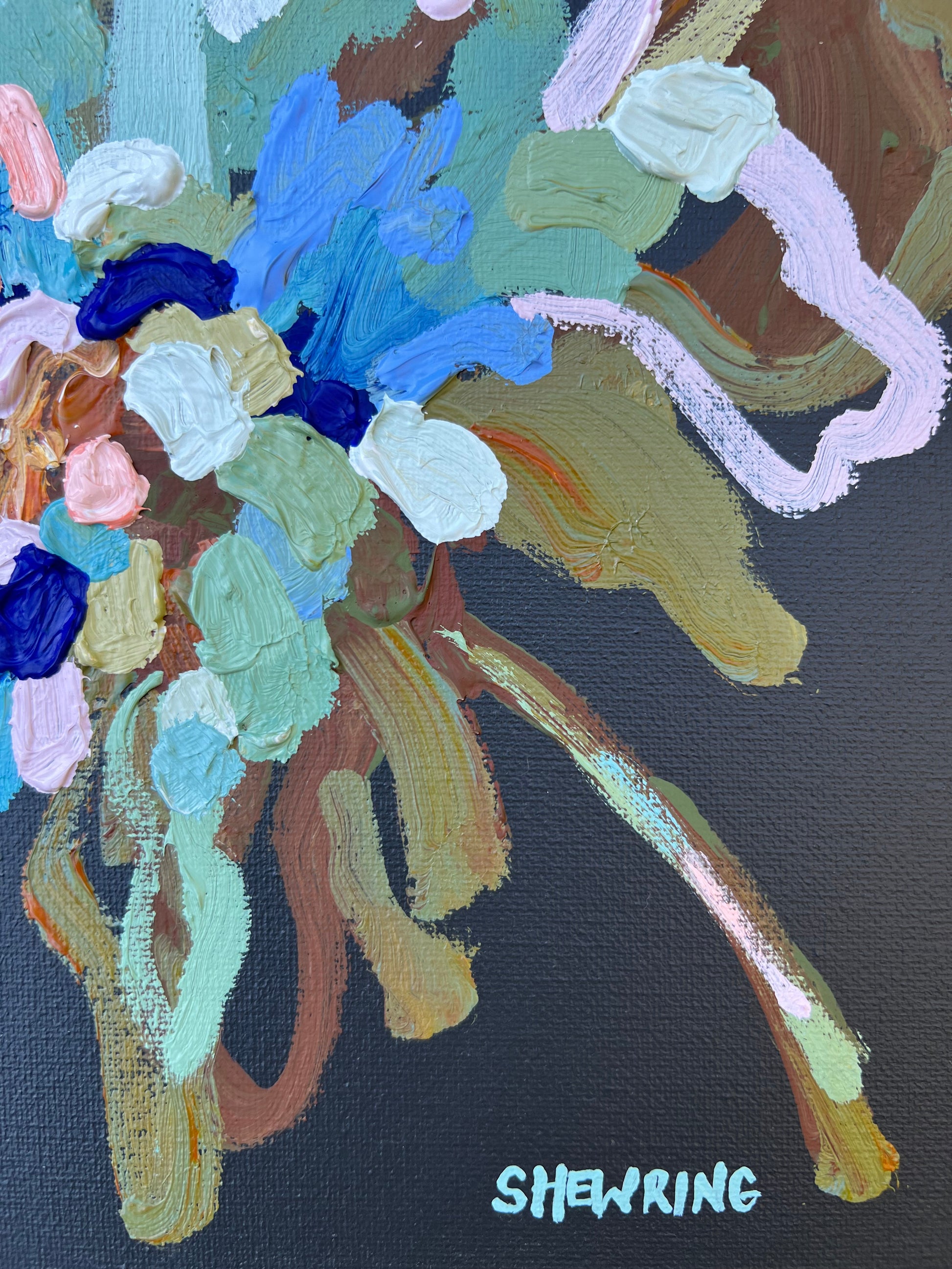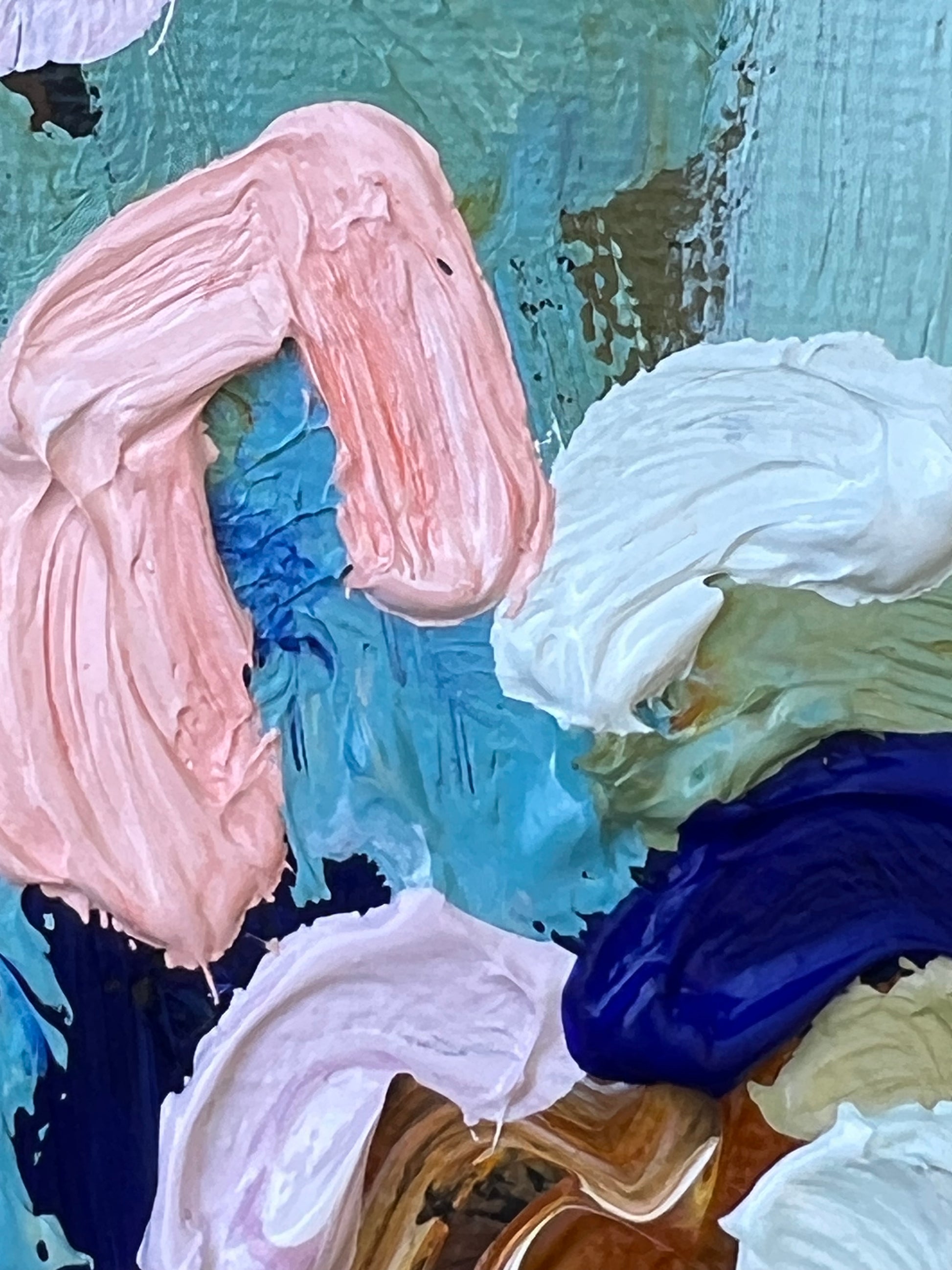 Blue Passion is a textured flower abstract with beautiful shades of tropical sea blues contrasted with orange tangerine, dusty pinks, chocolate coloured impressions of leaves with bursts of sage and olive greens. This painting has expressive individual brushstrokes that bring it to life!