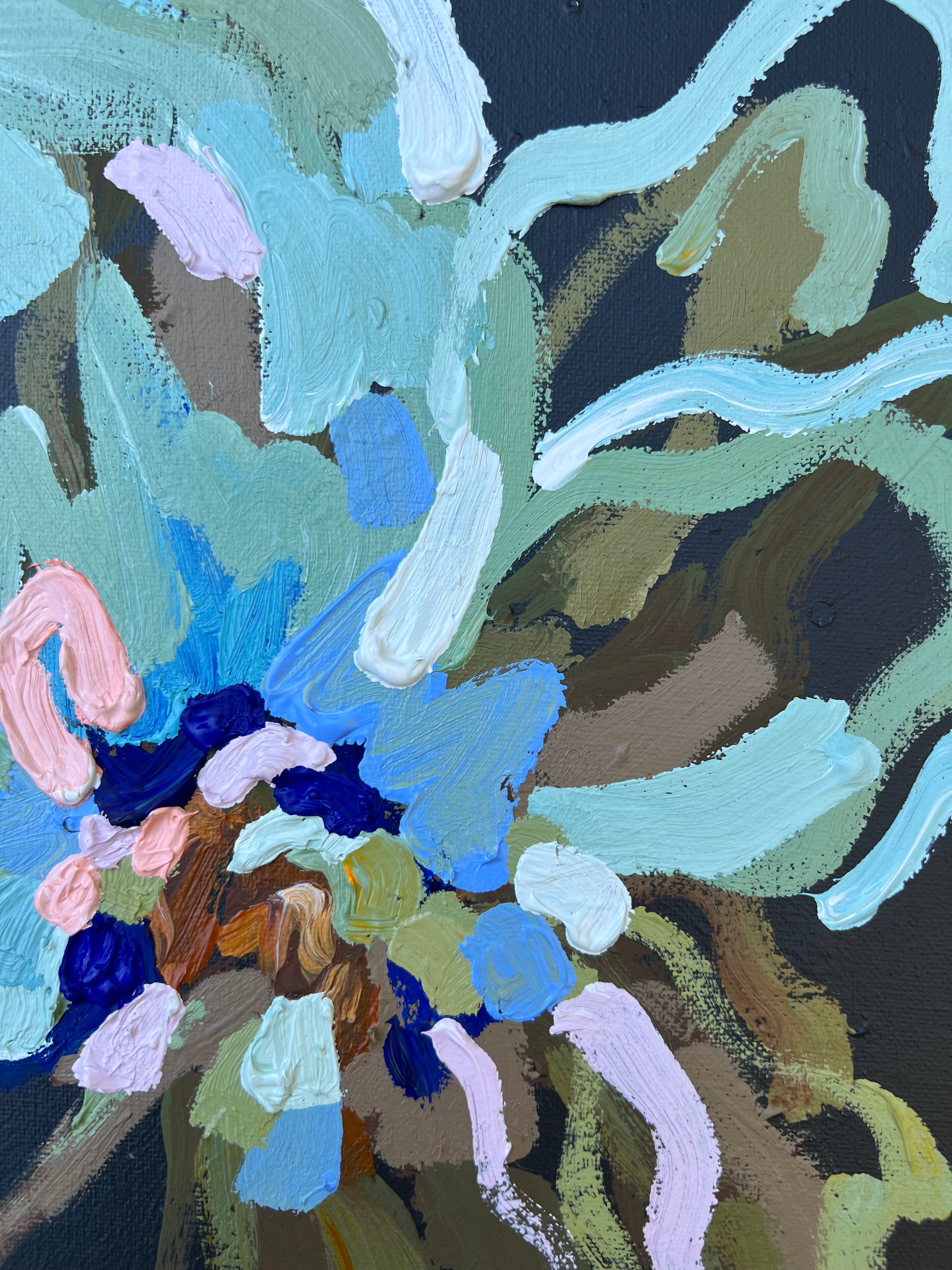 Blue Sunshine is a textured flower abstract with beautiful shades of tropical sea blues contrasted with orange tangerine, dusty pinks, chocolate coloured impressions of leaves with bursts of sage and olive greens. This painting has expressive individual brushstrokes that bring it to life!