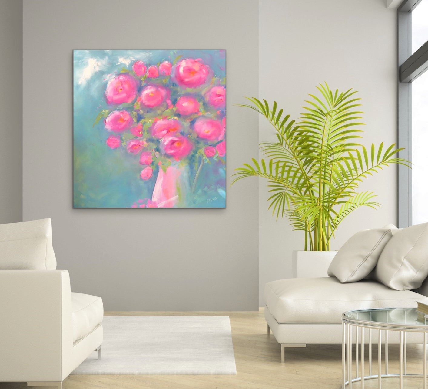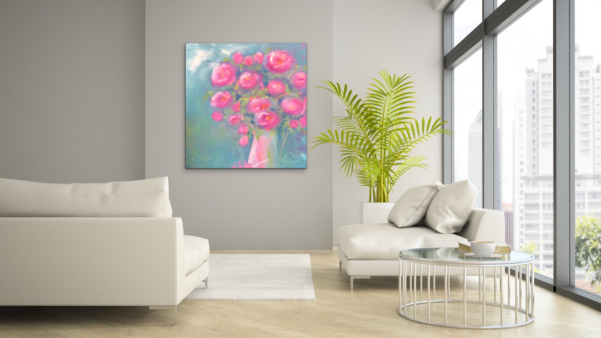 Candy Floss Blossom is a bright and bold flower abstract inspired by the delicious ice-cream colours of melons and strawberries. This painting has the passionate colours of love!