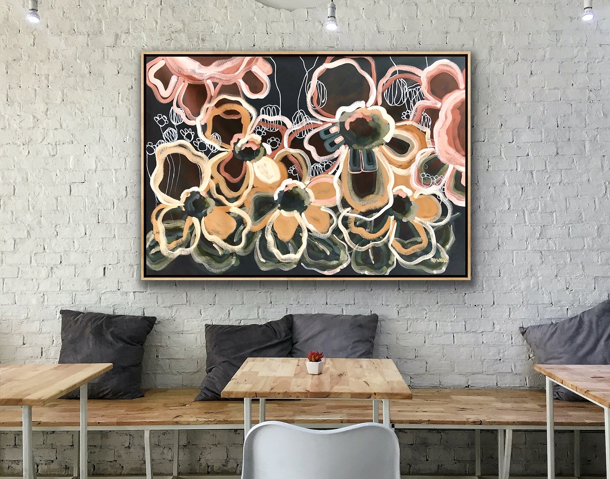 Caramel Mocha was inspired by the warm earth tones of the Australian landscape. I painted the flowers and foliage in an abstract expressive style in earthy autumn and coffee tones with bursts of soft apricot, deep lead blues and sage and olive greens that would suit a range of different decors.