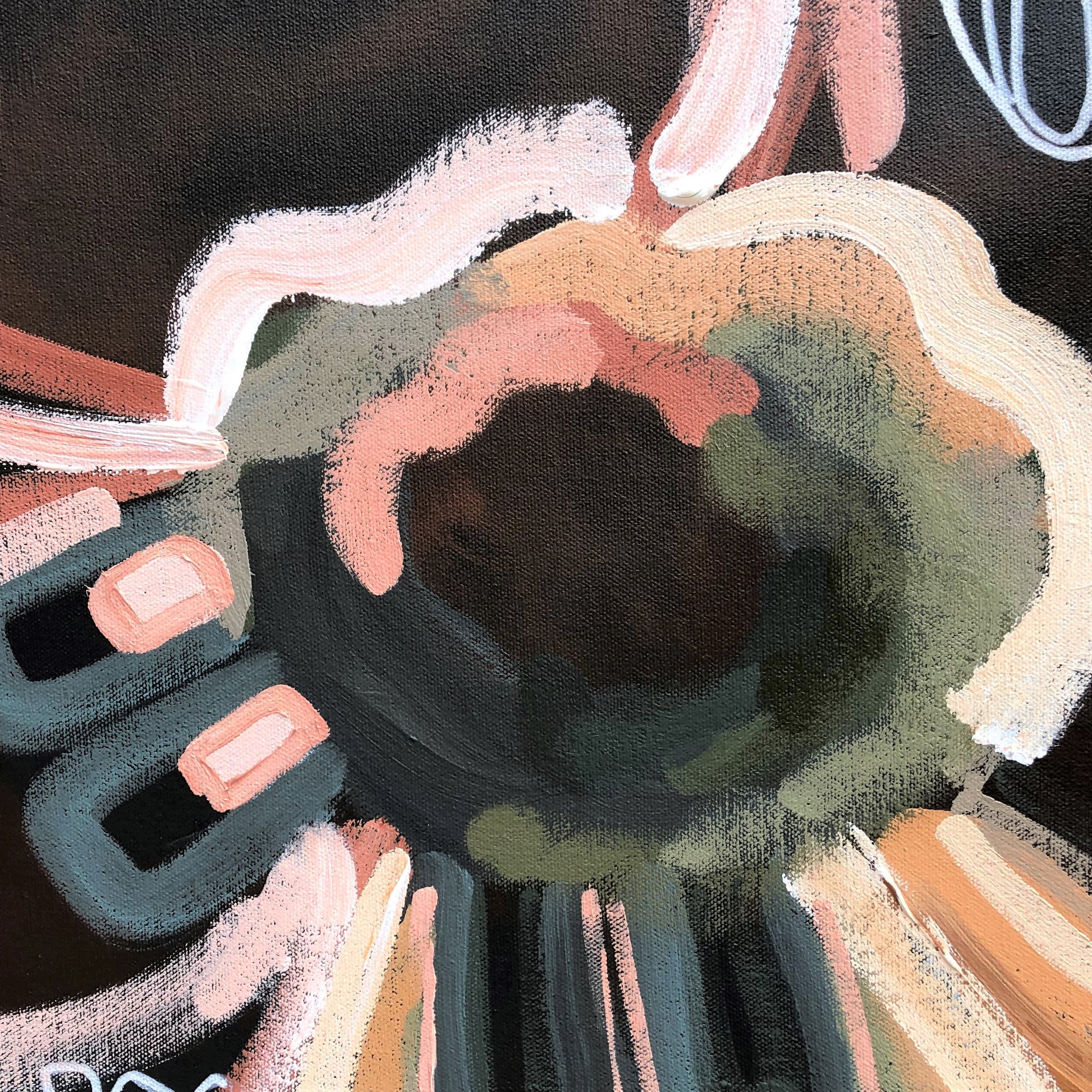 My artwork is full of life, movement and colour with loose organic shapes taken from nature. In this painting I place their beauty over a dramatic warm charcoal background.