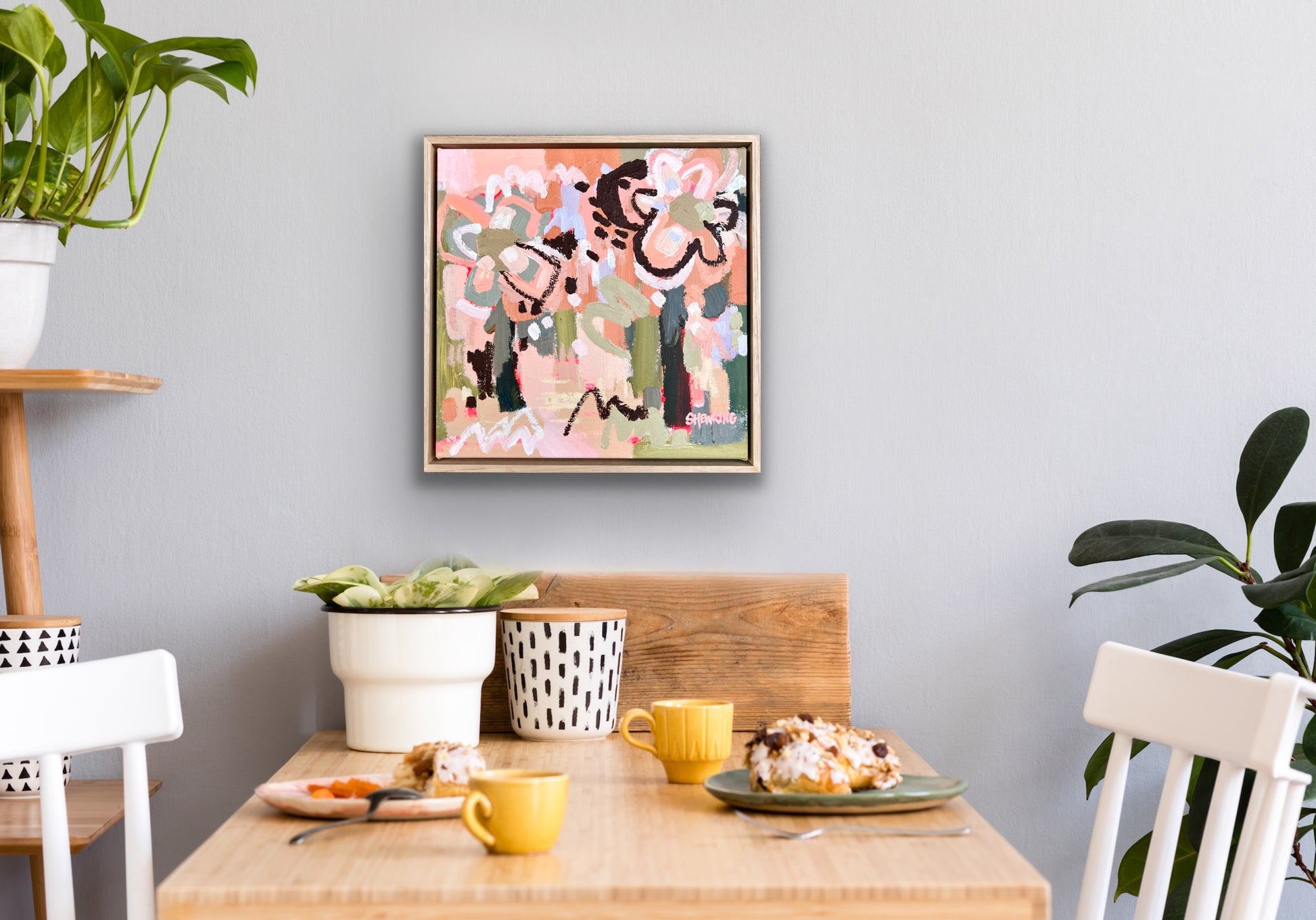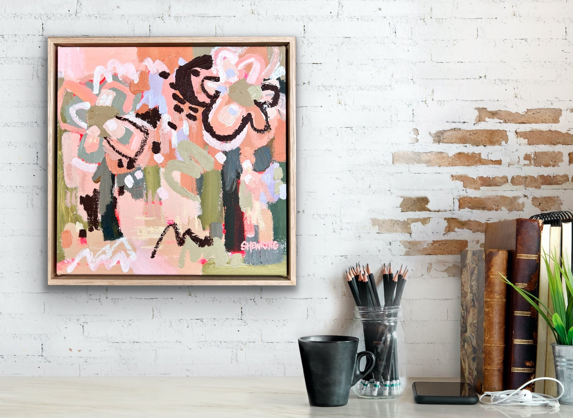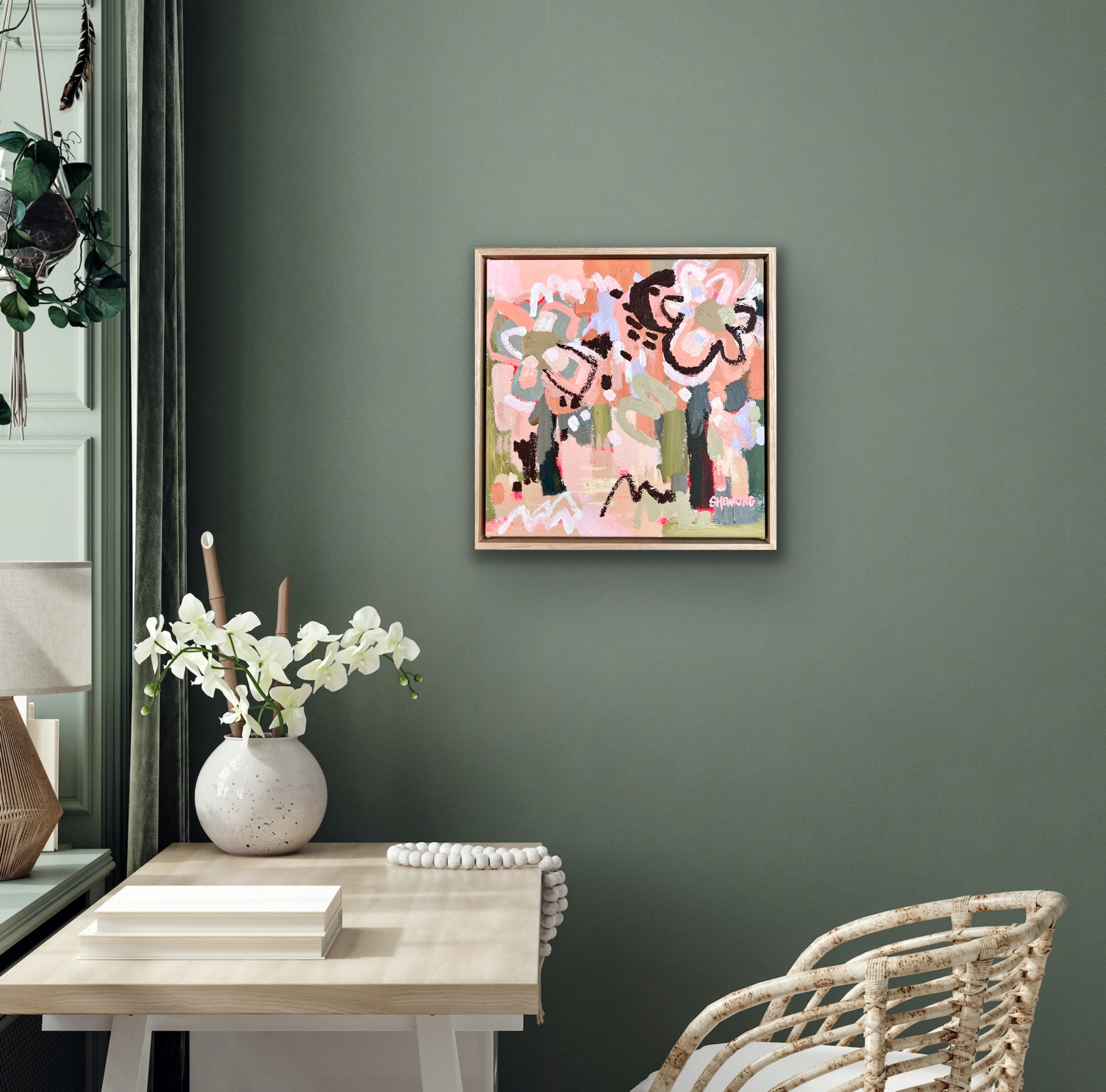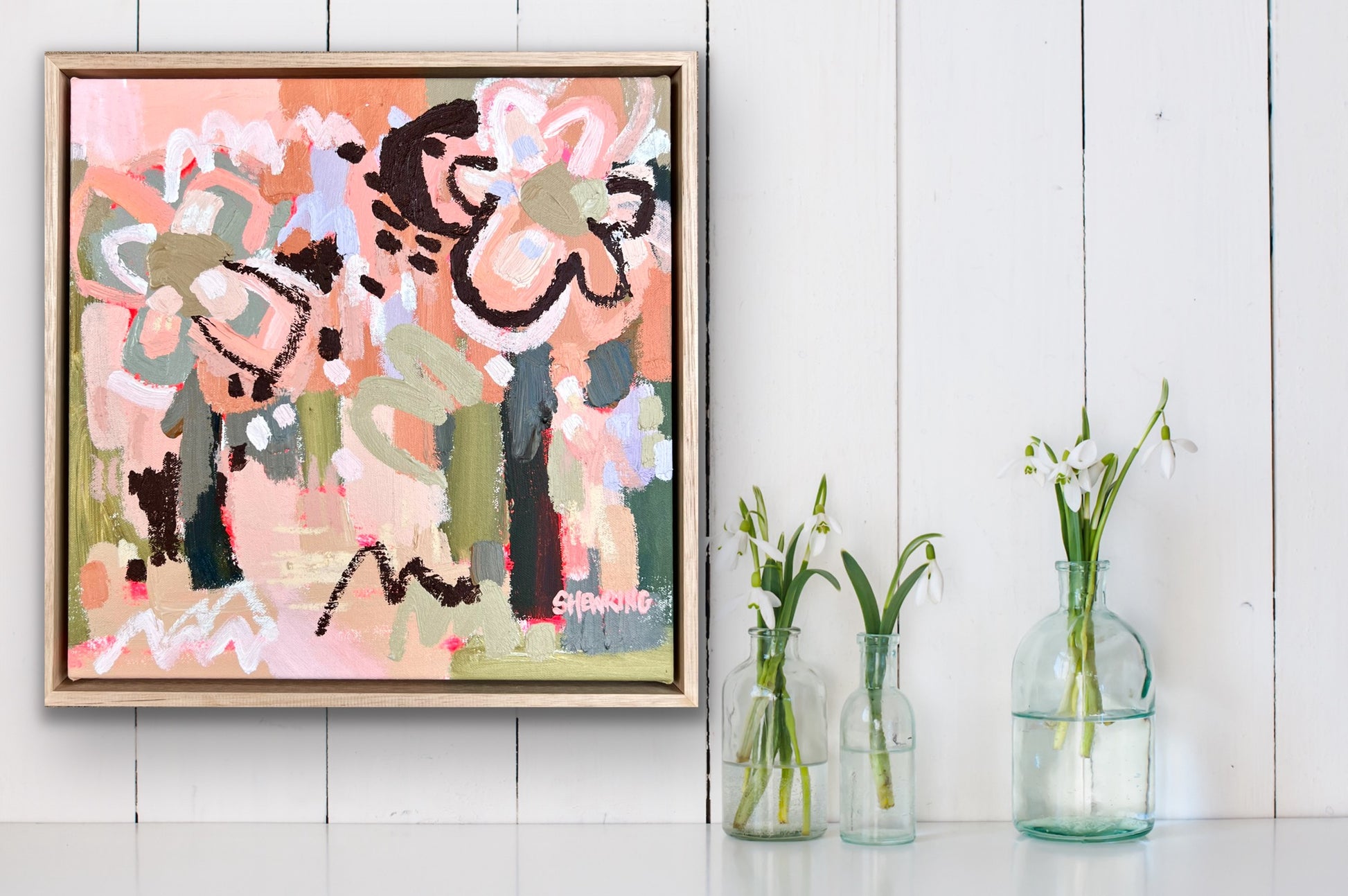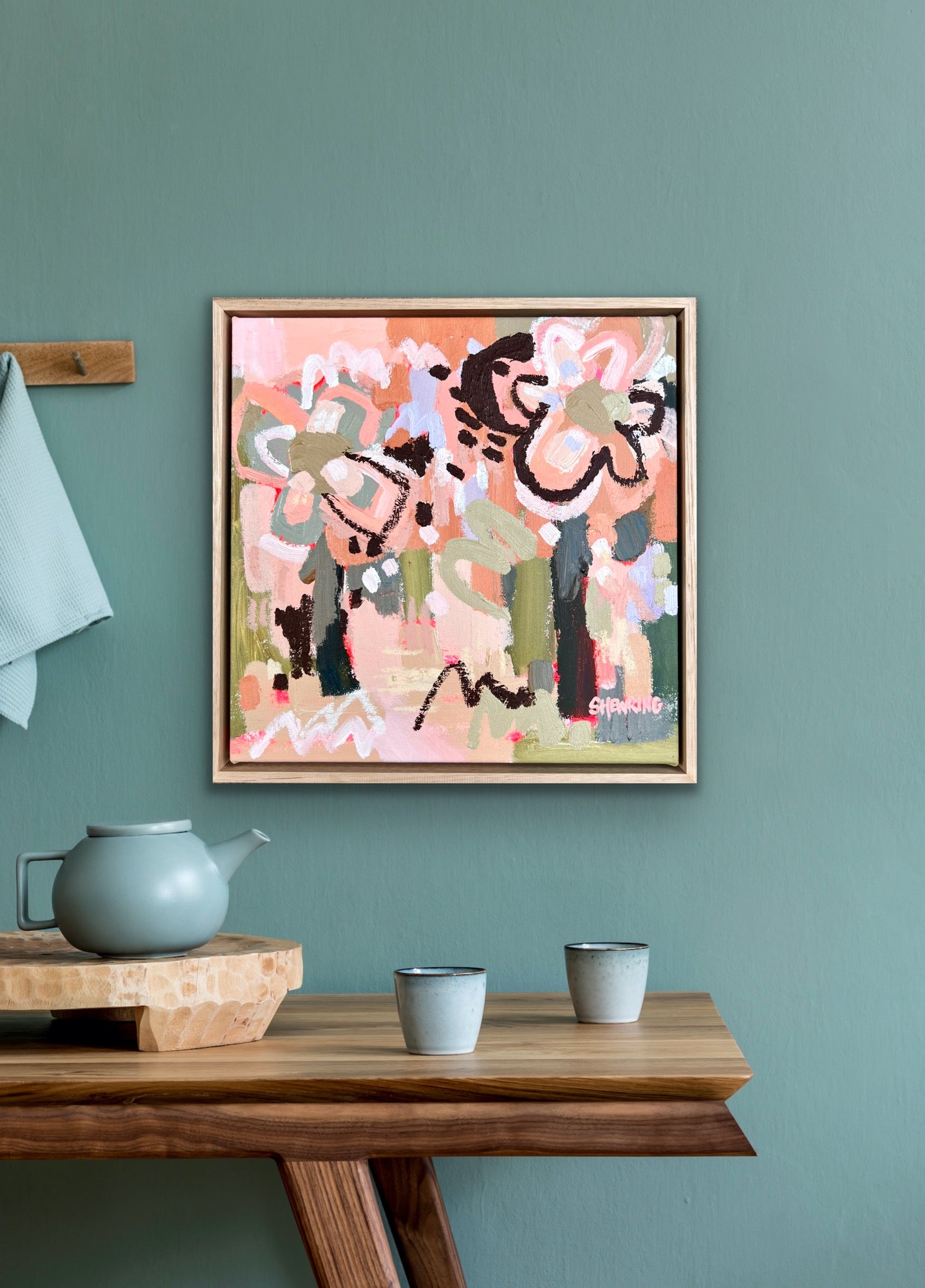 Framed in oak natural timber float frame 35 x 35 cm (canvas 32 x 32 cm). Sold