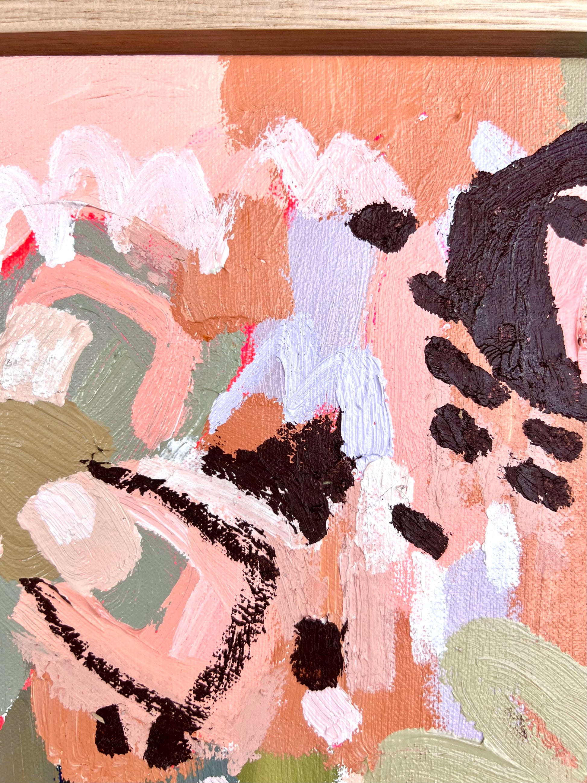 - Painted onto artist professional quality stretched canvas with an external oak timber frame and an internal hardwood frame with wire on the back so it is ready to hang.
