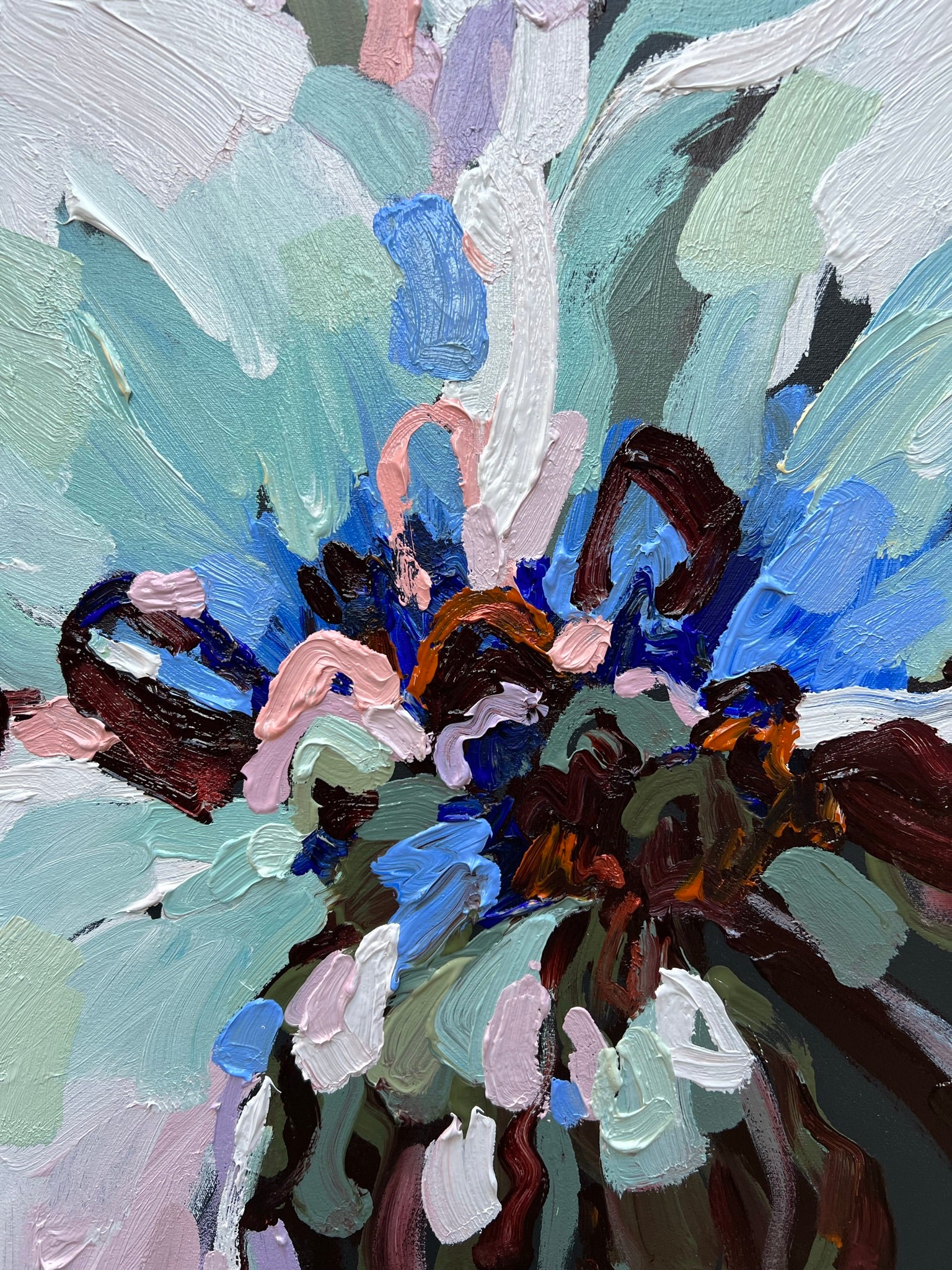 Casablanca is a textured flower abstract with beautiful shades of tropical sea blues contrasted with orange tangerine, dusty pinks, chocolate coloured impressions of leaves with bursts of sage and olive greens and a sparkle of bronze.