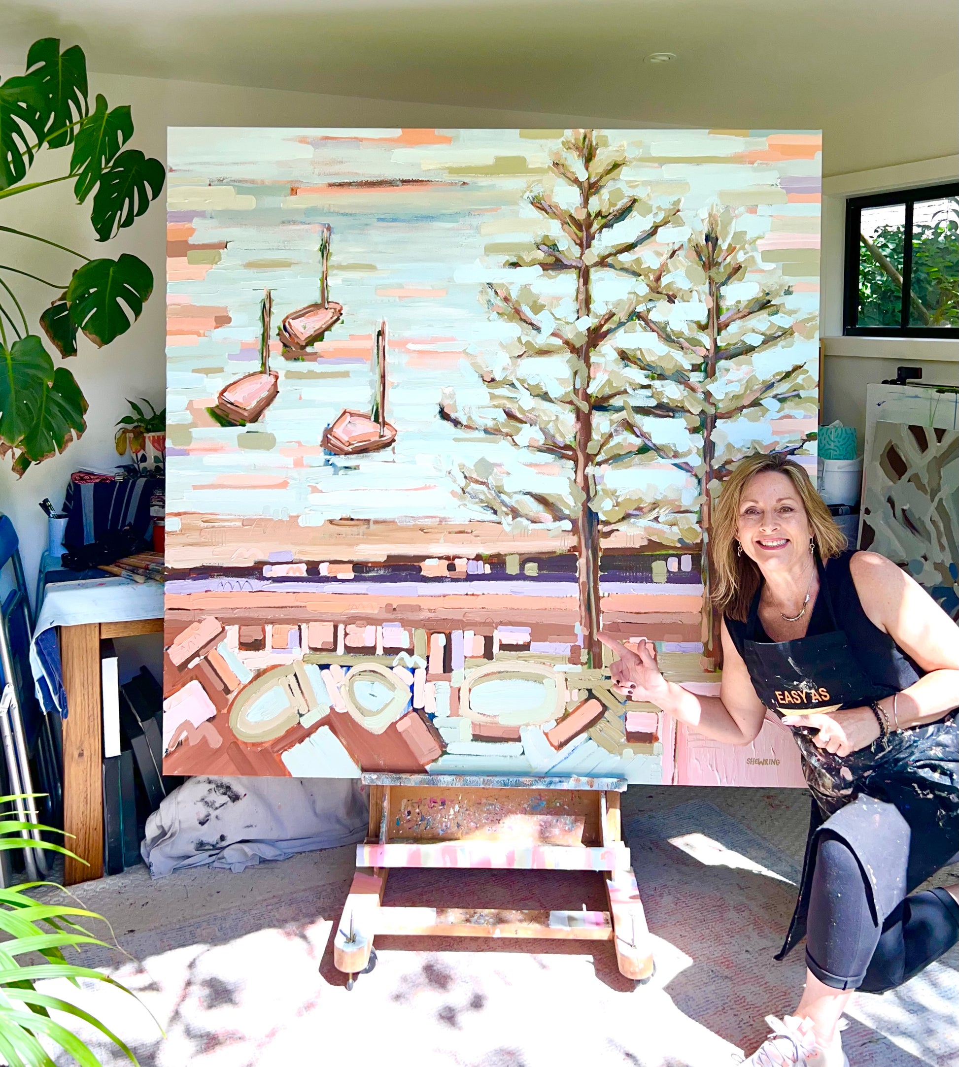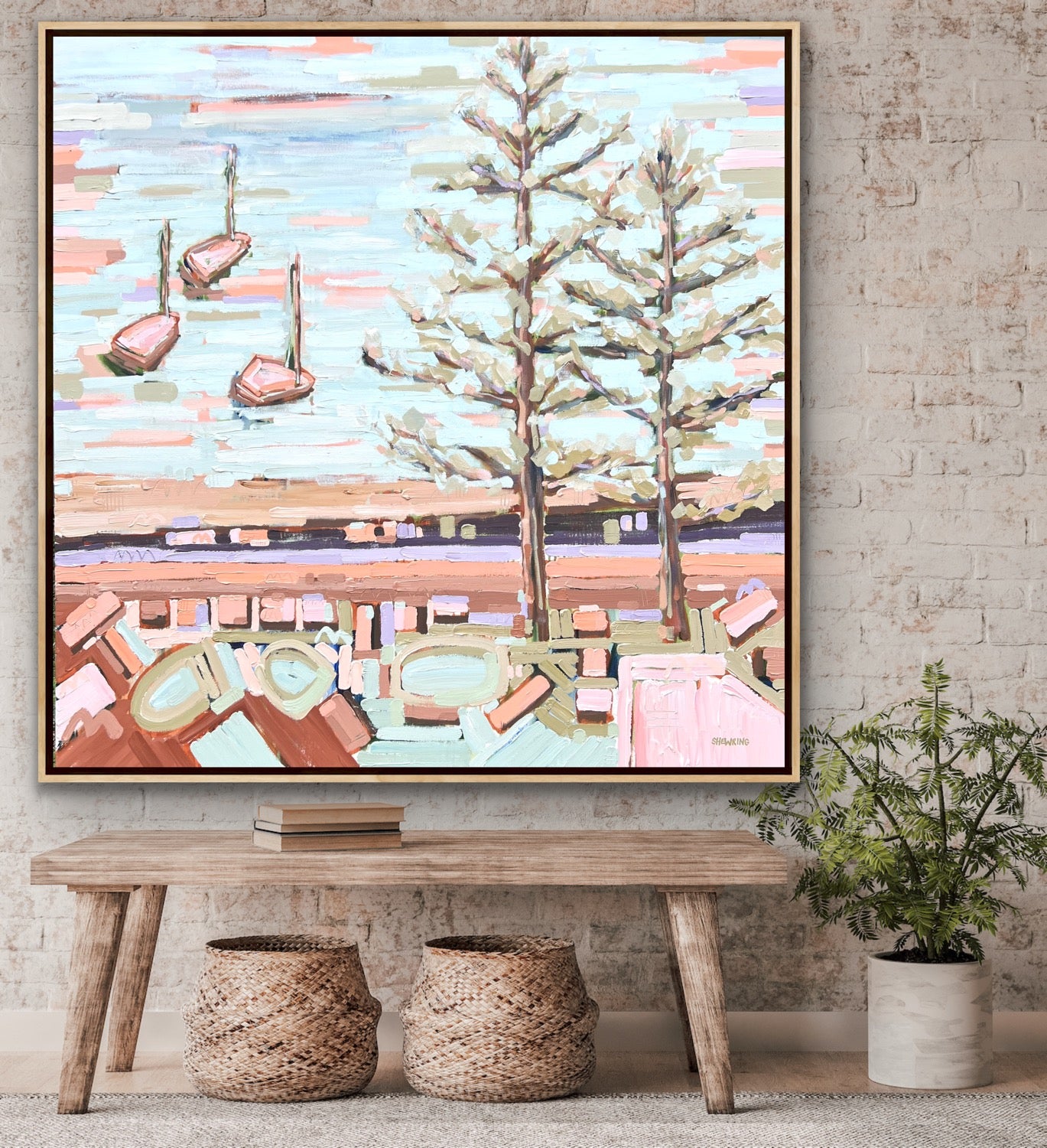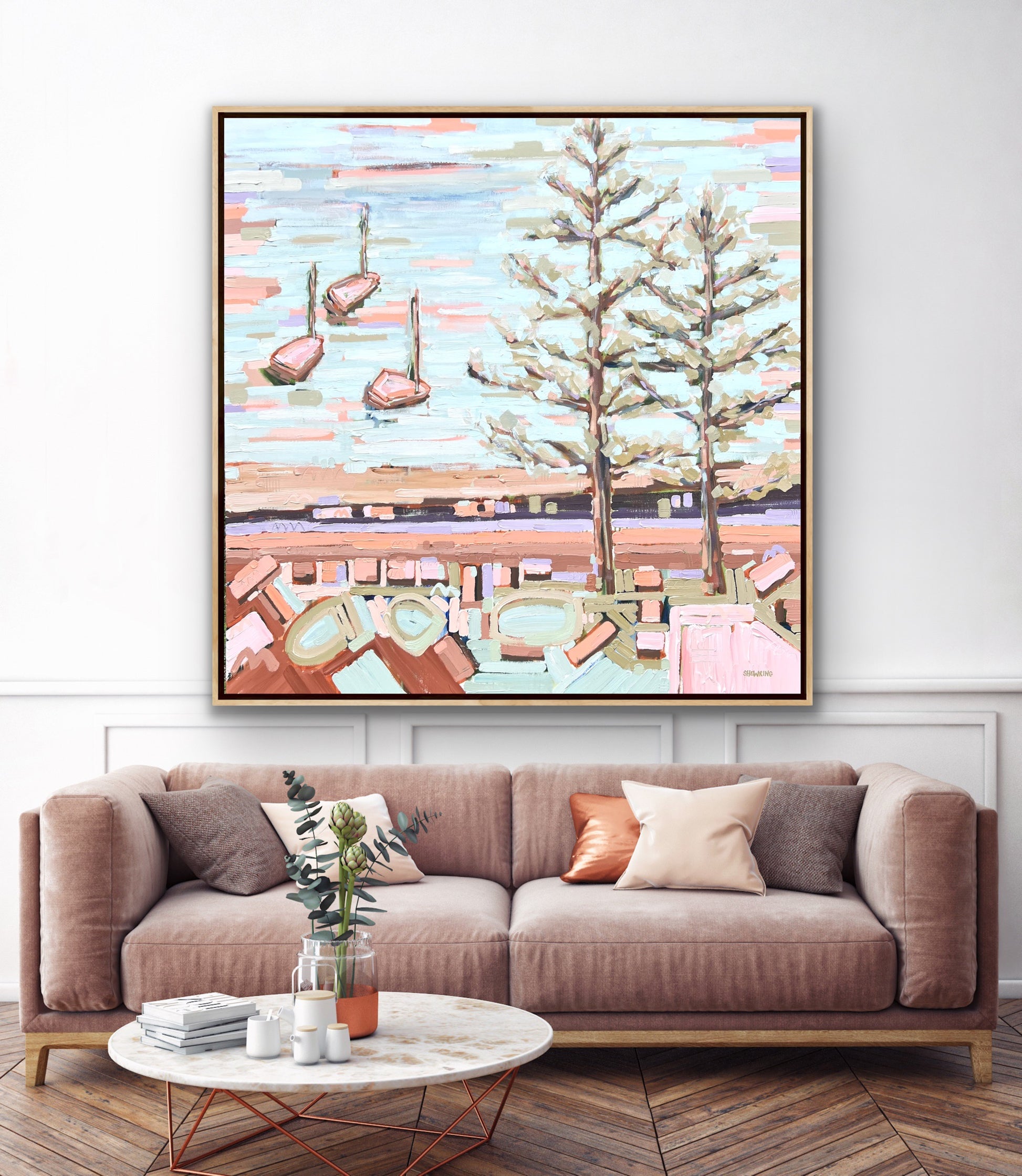 Charming Bayside was inspired by the stunningly beautiful bayside beaches of Melbourne. I created this painting to reflect the warm sunny seaside vibe with palm trees, boats capturing the breeze and the gardens, cafes and walking trails that hug the bay.