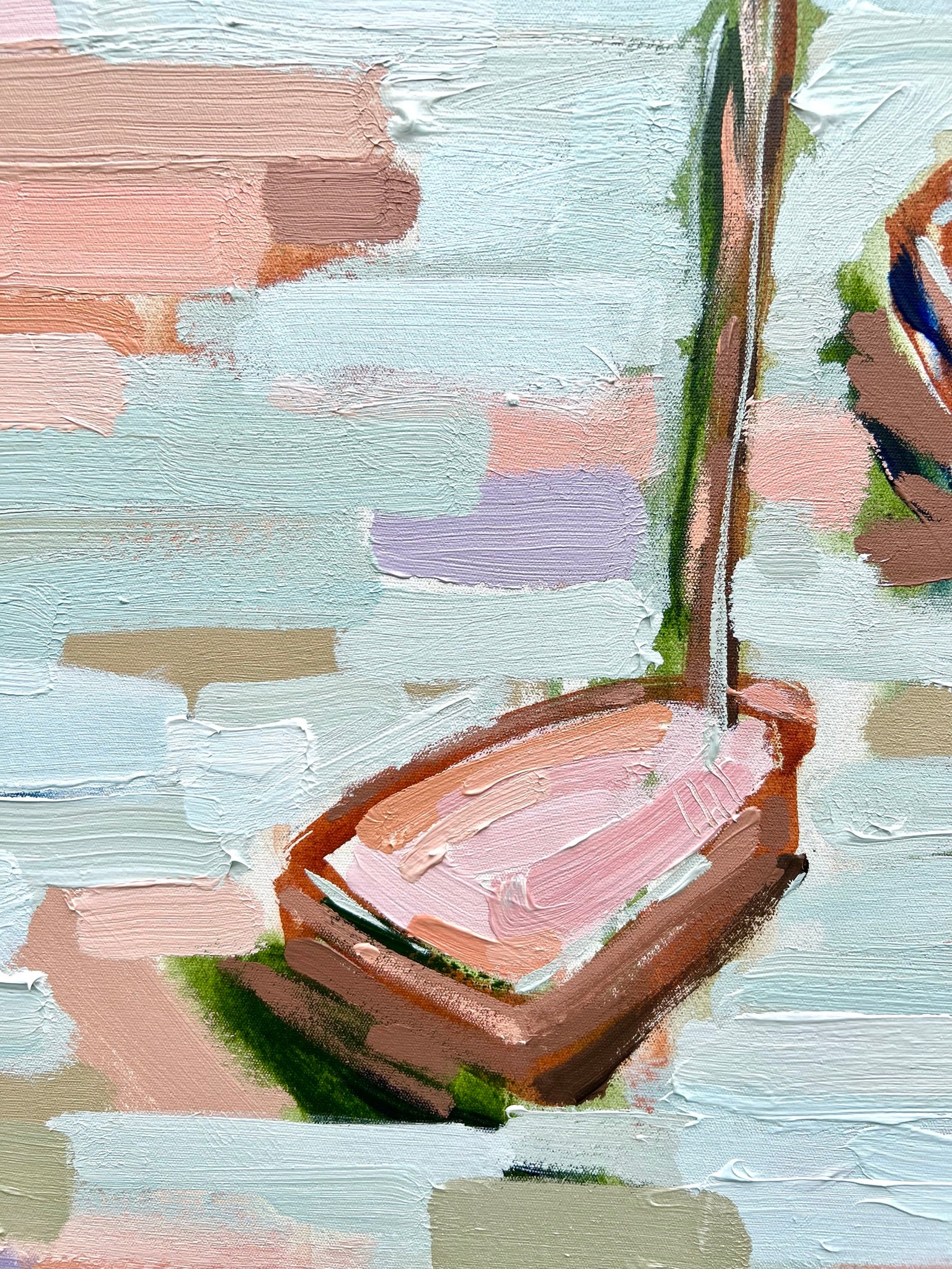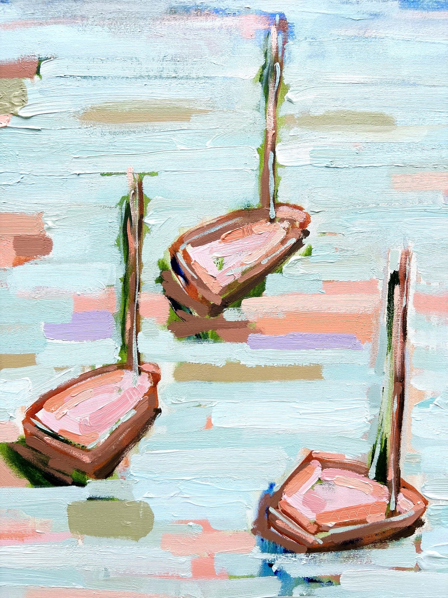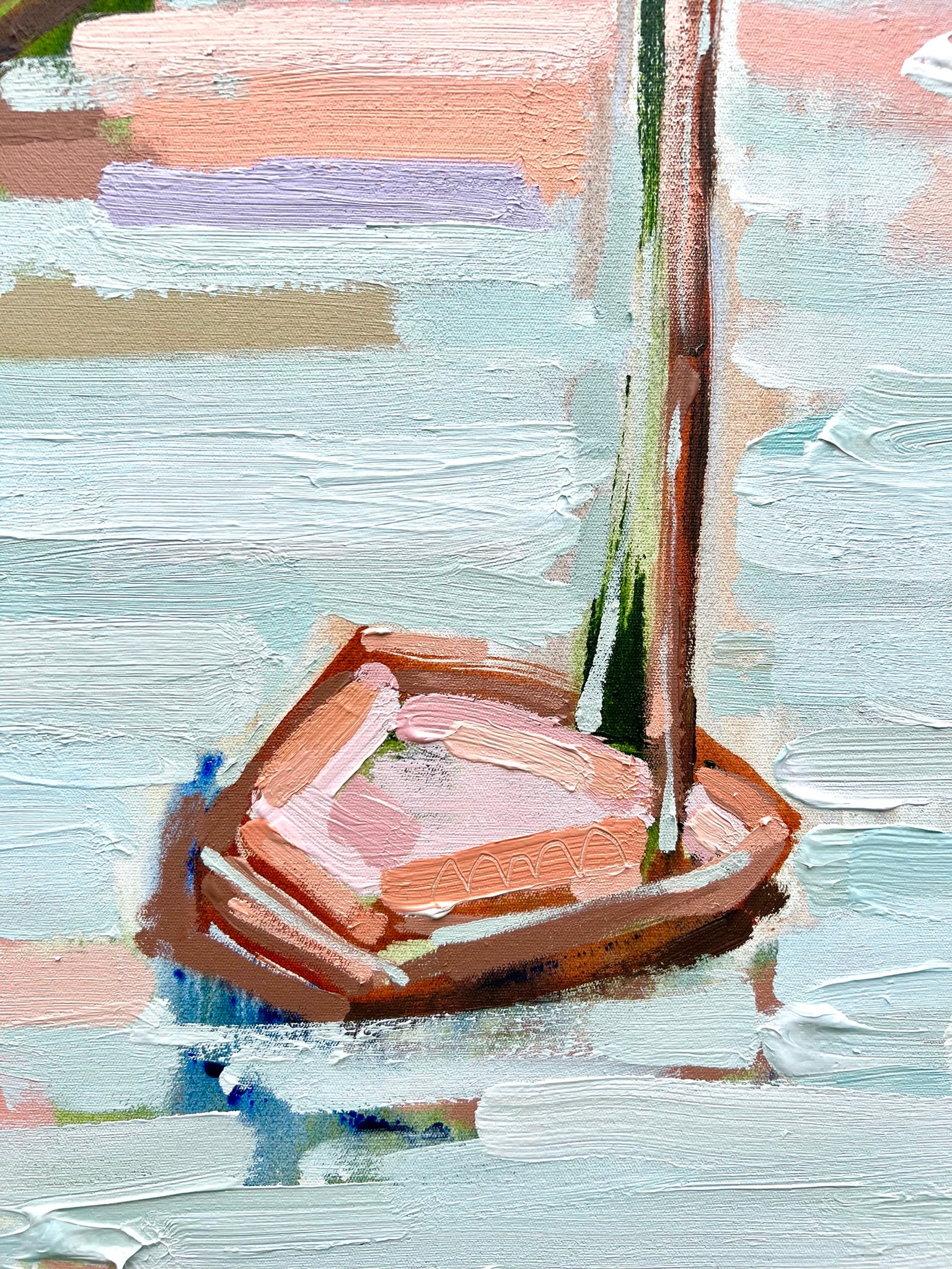 Charming Bayside was inspired by the stunningly beautiful bayside beaches of Melbourne. I created this painting to reflect the warm sunny seaside vibe with palm trees, boats capturing the breeze and the gardens, cafes and walking trails that hug the bay.