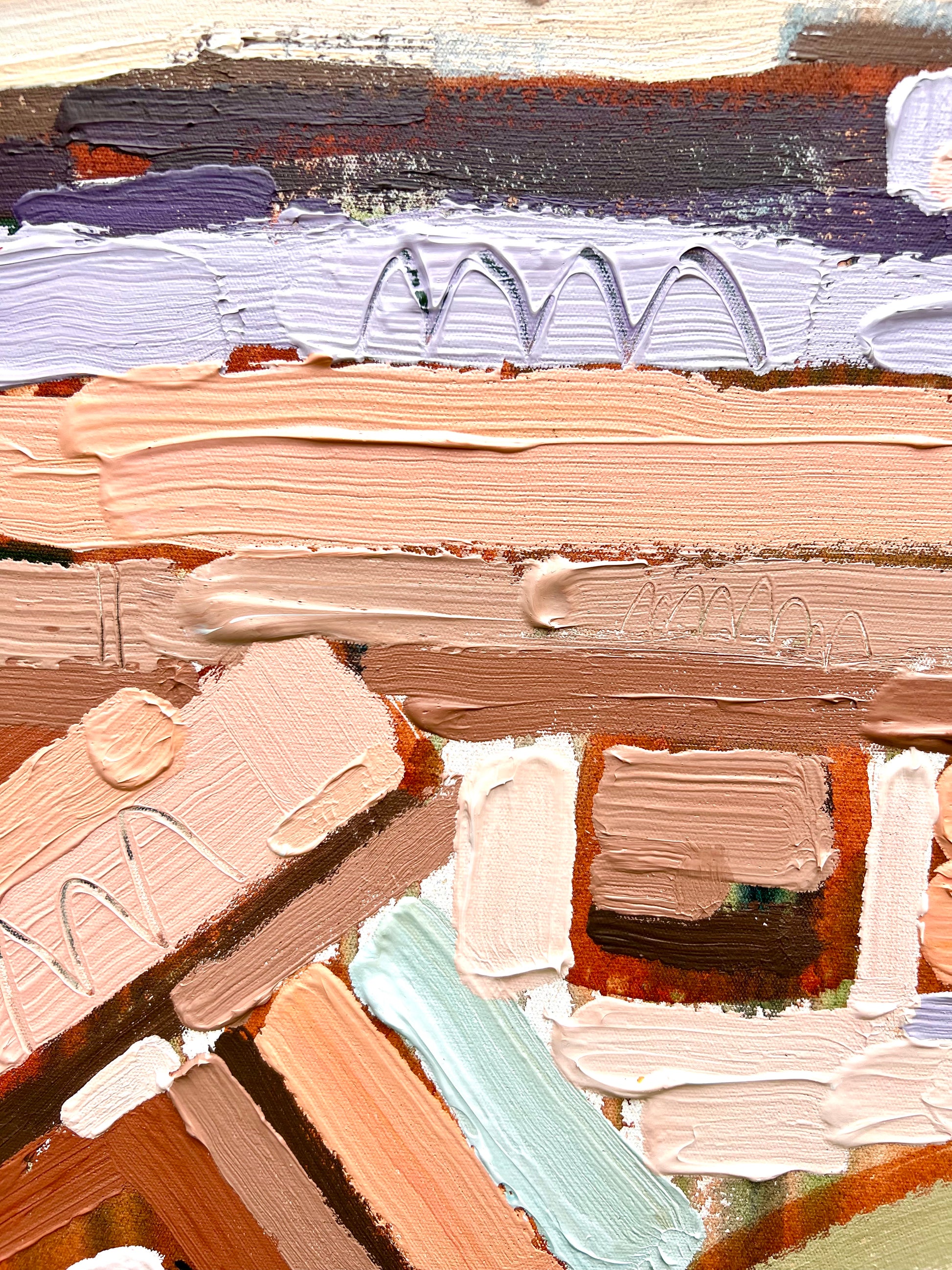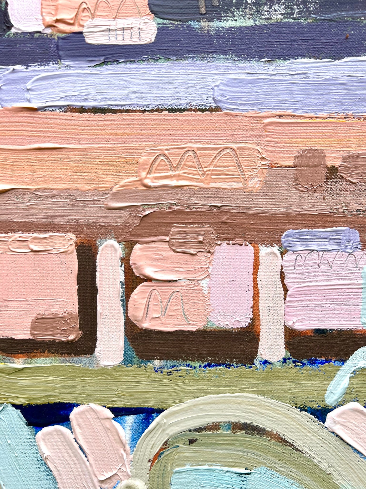 Chunky texture, loads of carved handmade marks sculpted into the paint draws you closer immersing you in that floaty feeling of the seaside. Grab a beach umbrella, let’s go!