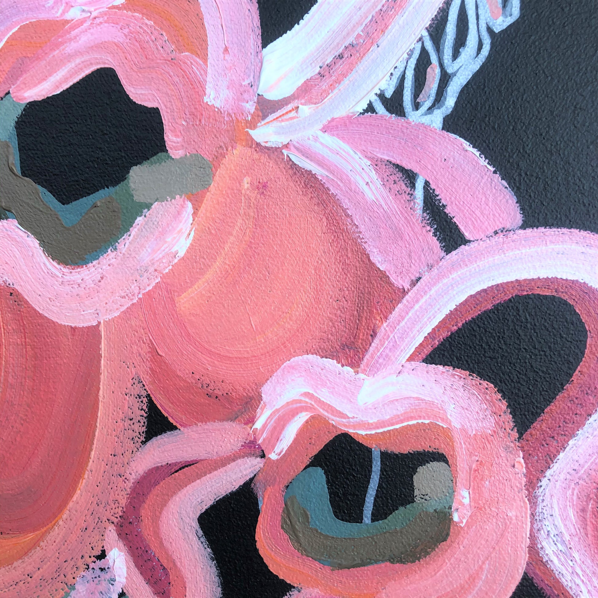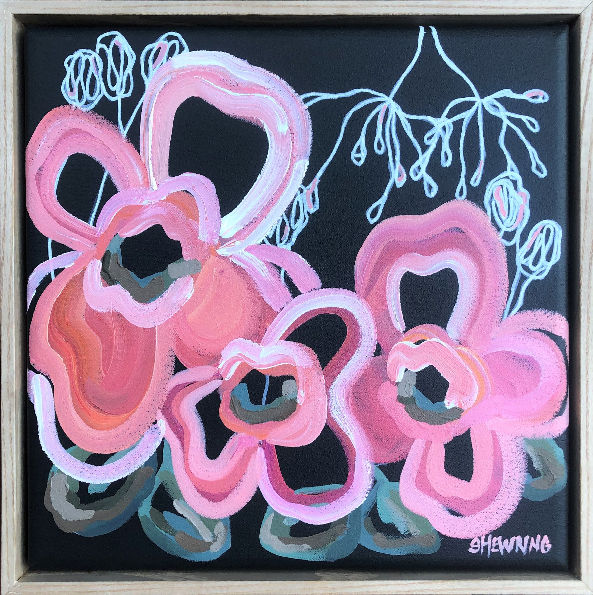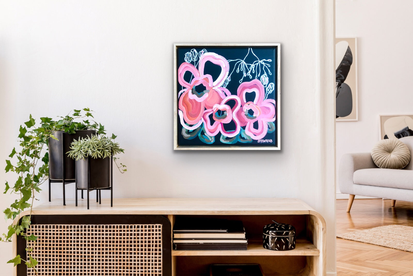 Love Bites is a bright and bold flower abstract inspired by the delicious summer colours of melons, strawberries and raspberries. This painting is framed in oak float style frame and has expressive individual brushstrokes that bring it to life!