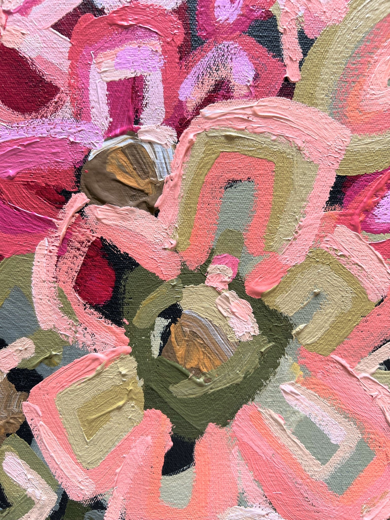 The flowers were created in an expressive style in the colours of love! Eye catching vibrant pinks, delicious apricots, peaches, melons, sage and olive greens have been painted onto a deep charcoal background that would suit a range of different decors.