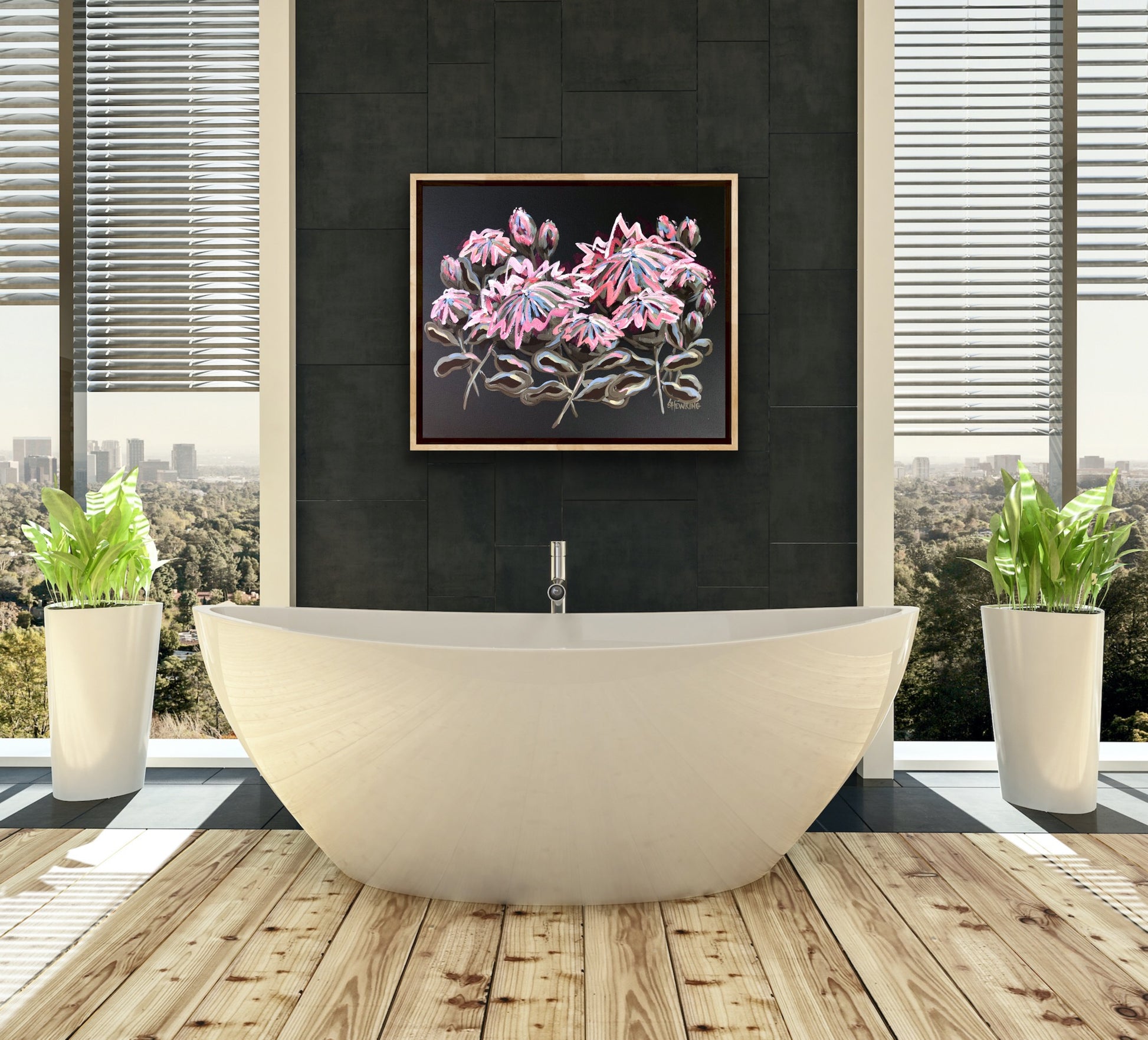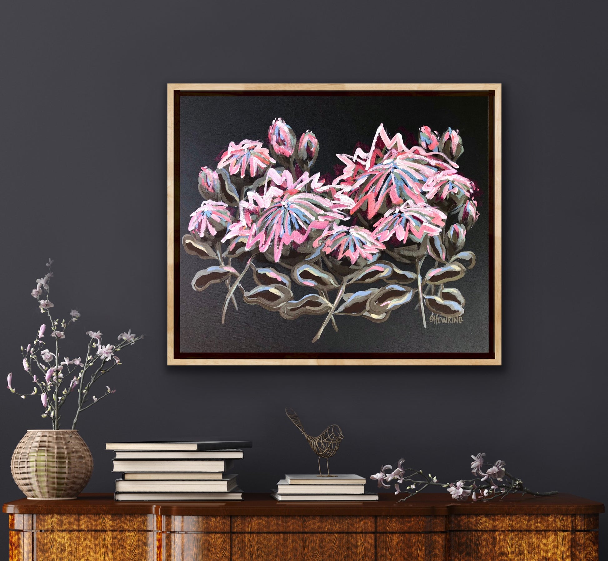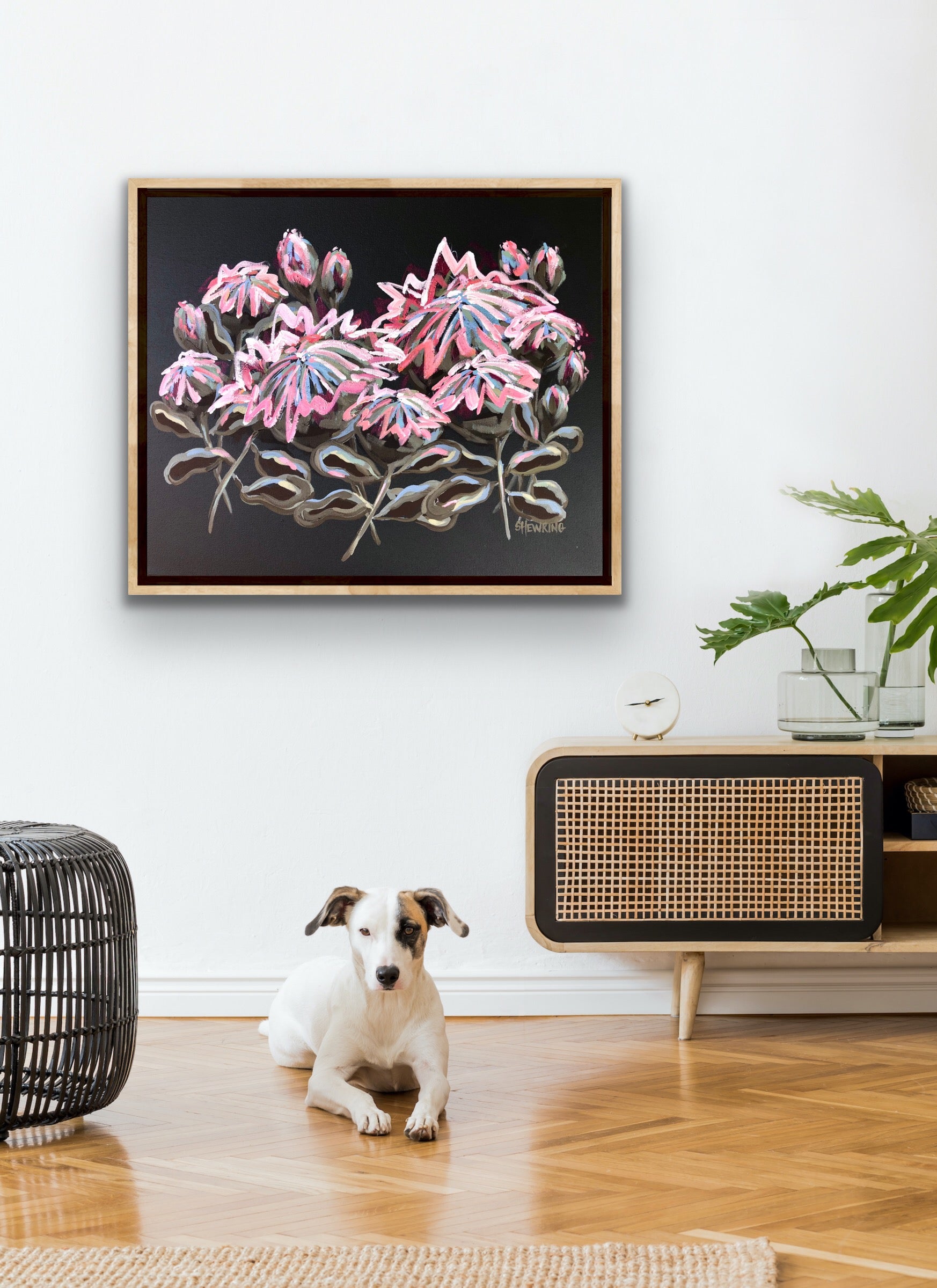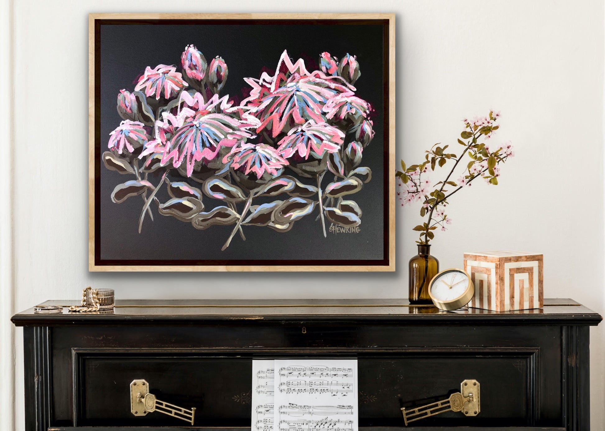 Painting abstract flowers and foliage is such a passion of mine, I adore their awesome colours. In this painting I place their beauty over a dramatic charcoal background.