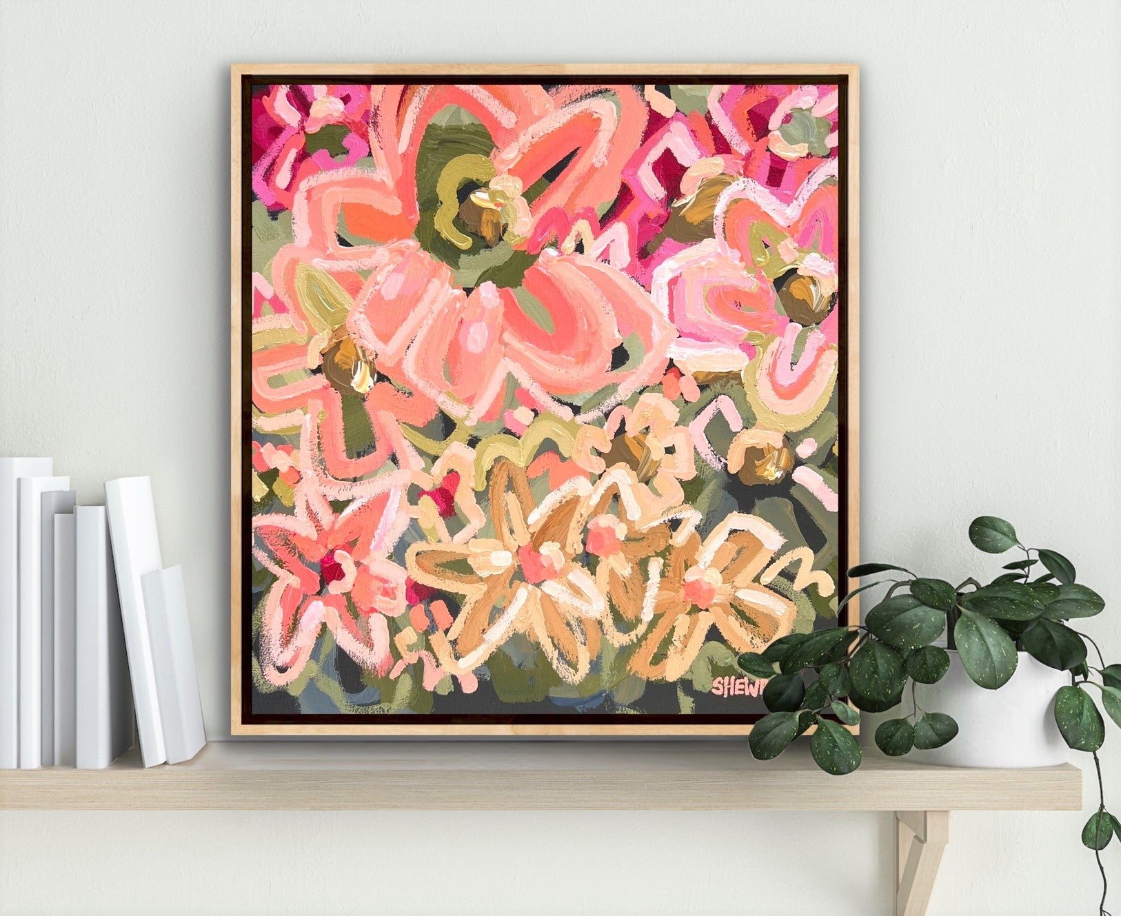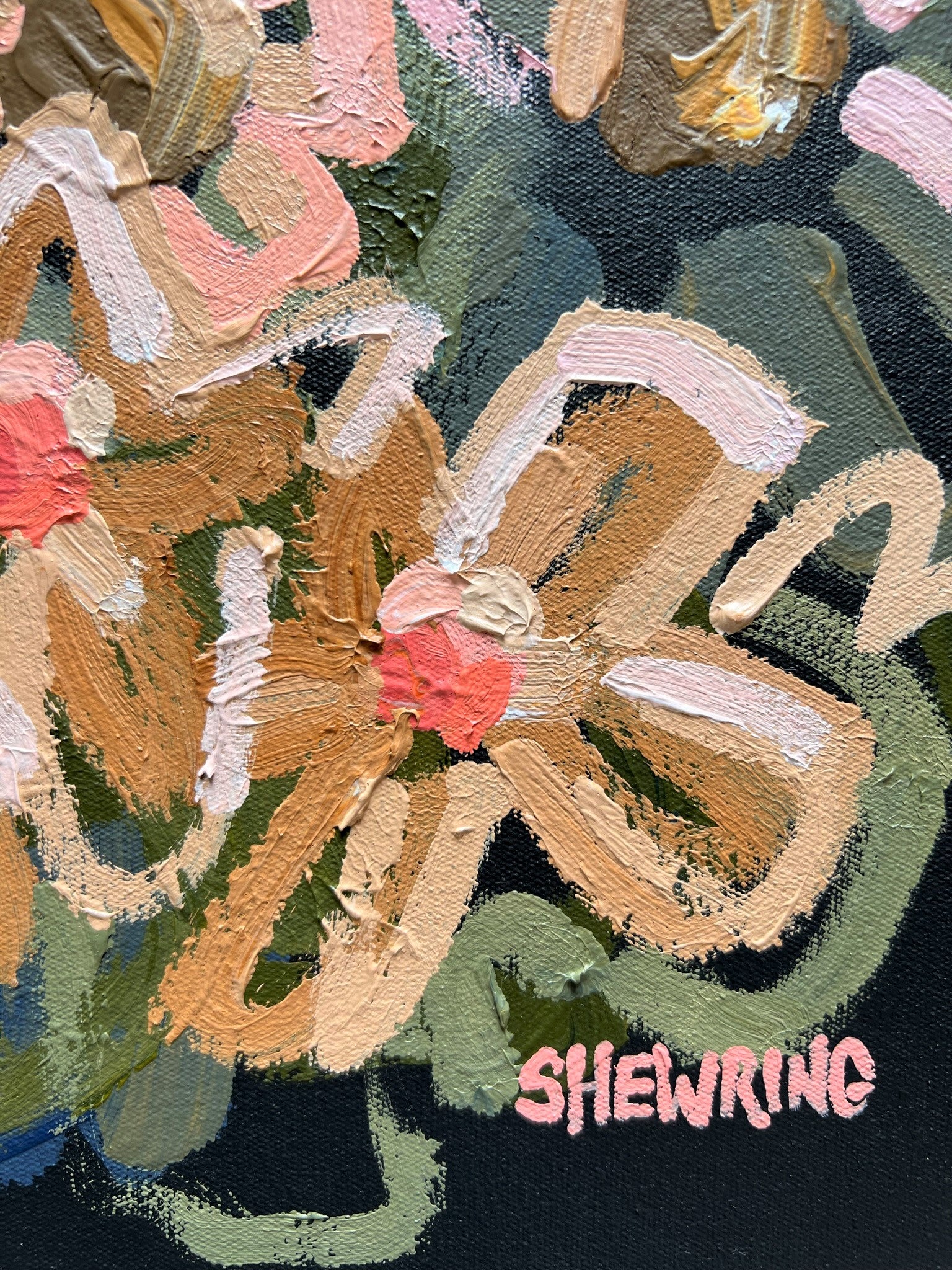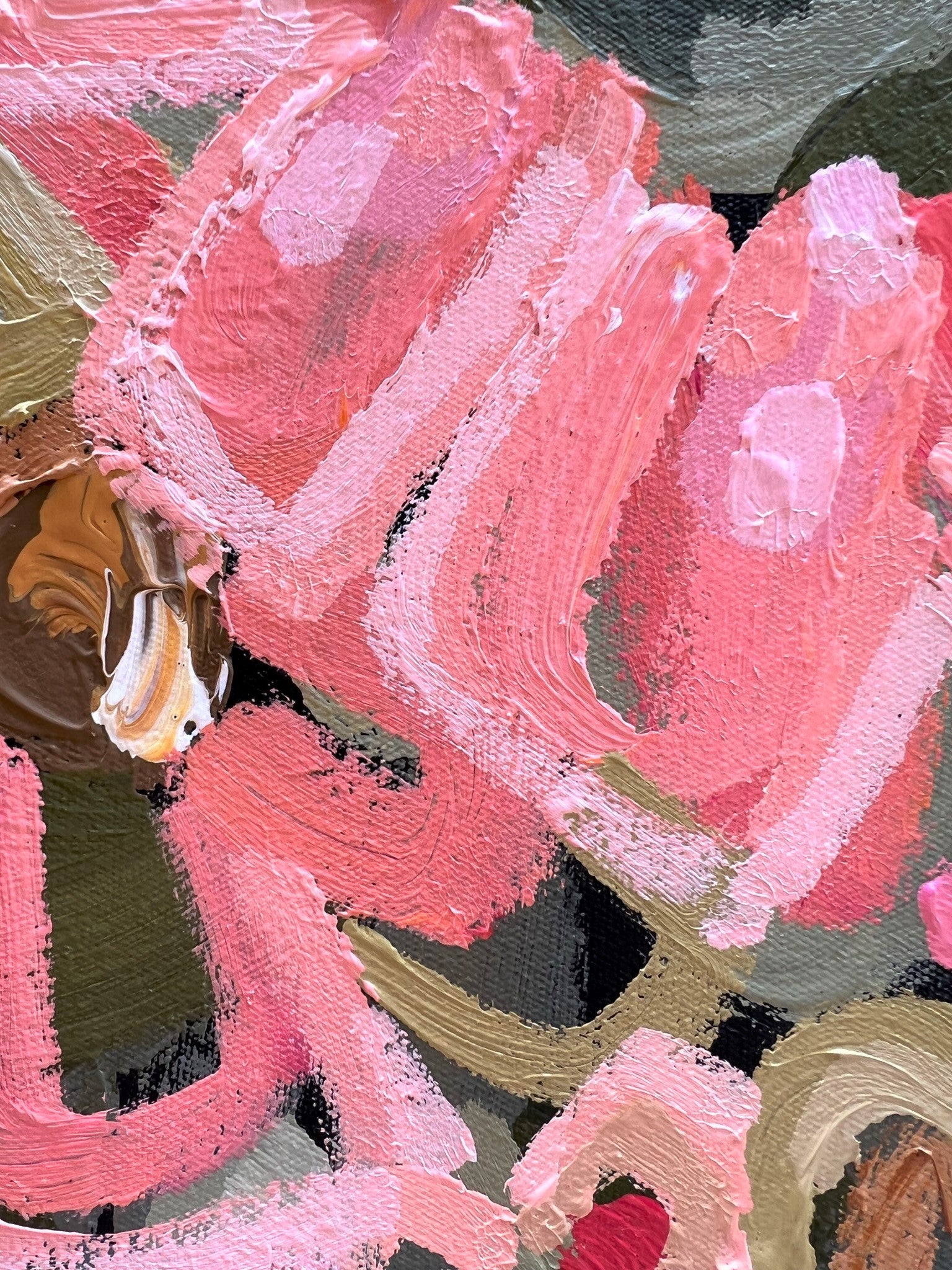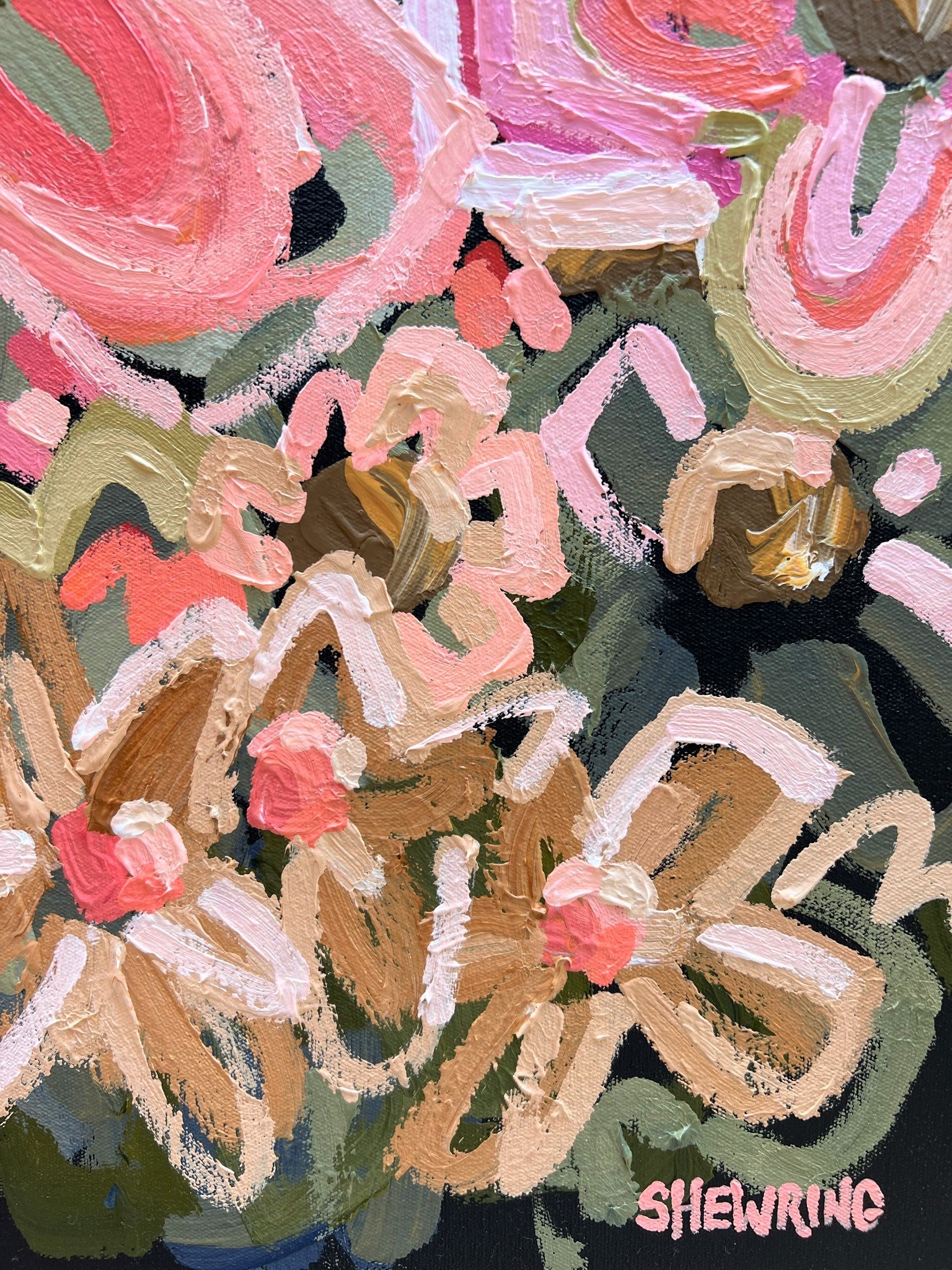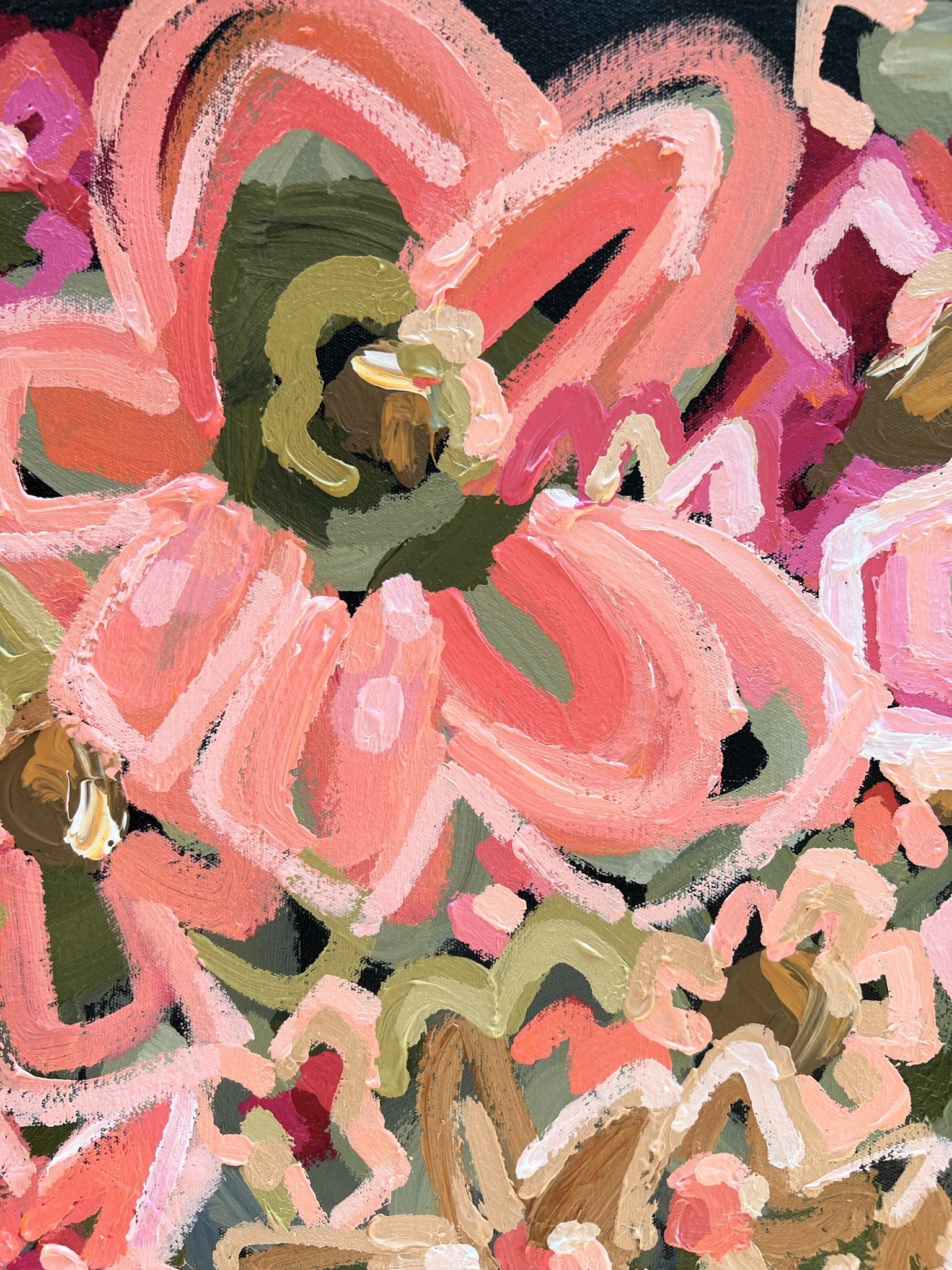 The flowers were created in an expressive style in the colours of love! Eye catching vibrant pinks, delicious apricots, peaches, melons, sage and olive greens have been painted onto a deep charcoal background that would suit a range of different decors.