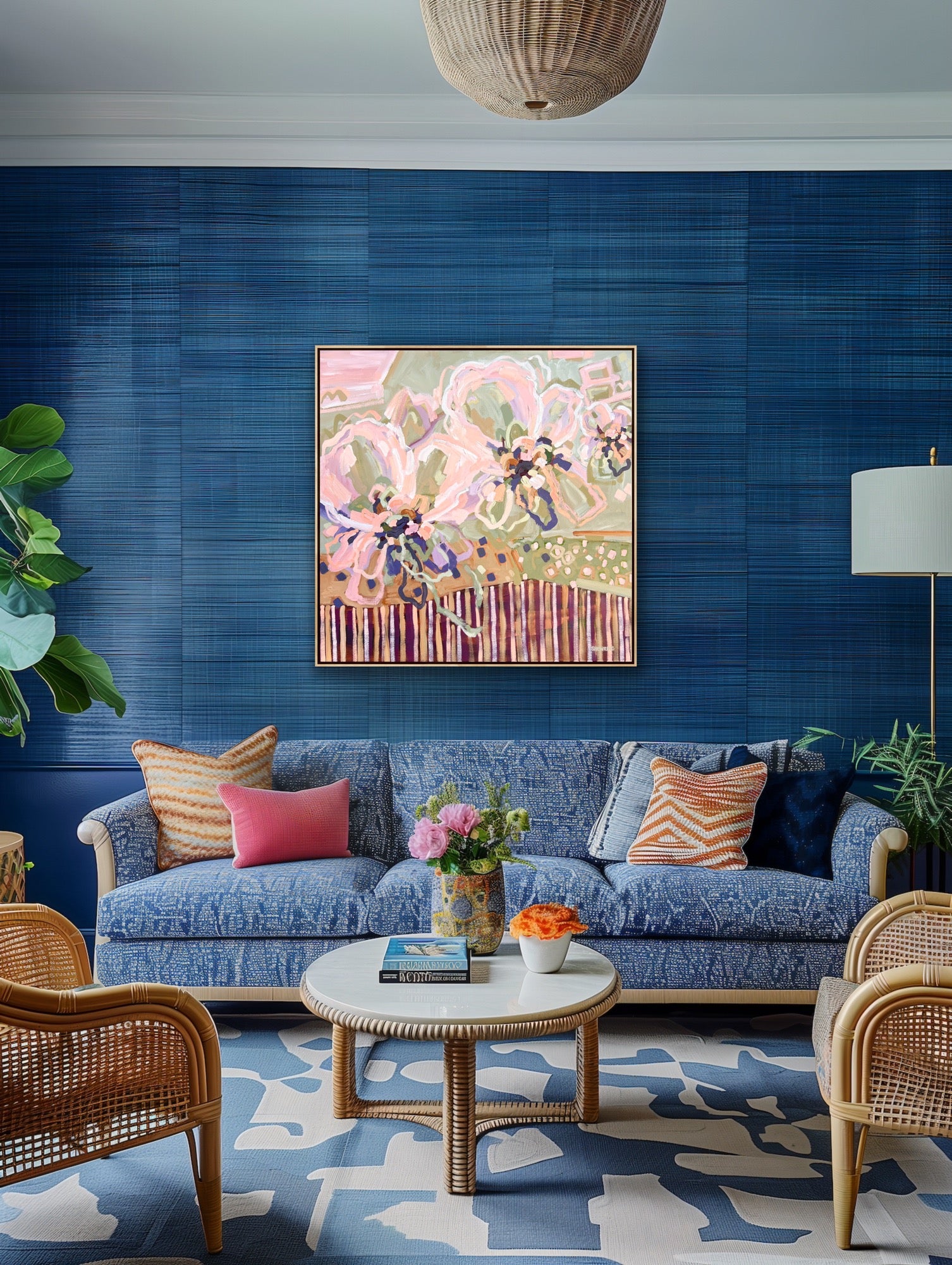 This artwork is full of life, movement and colour with joyous flowers.