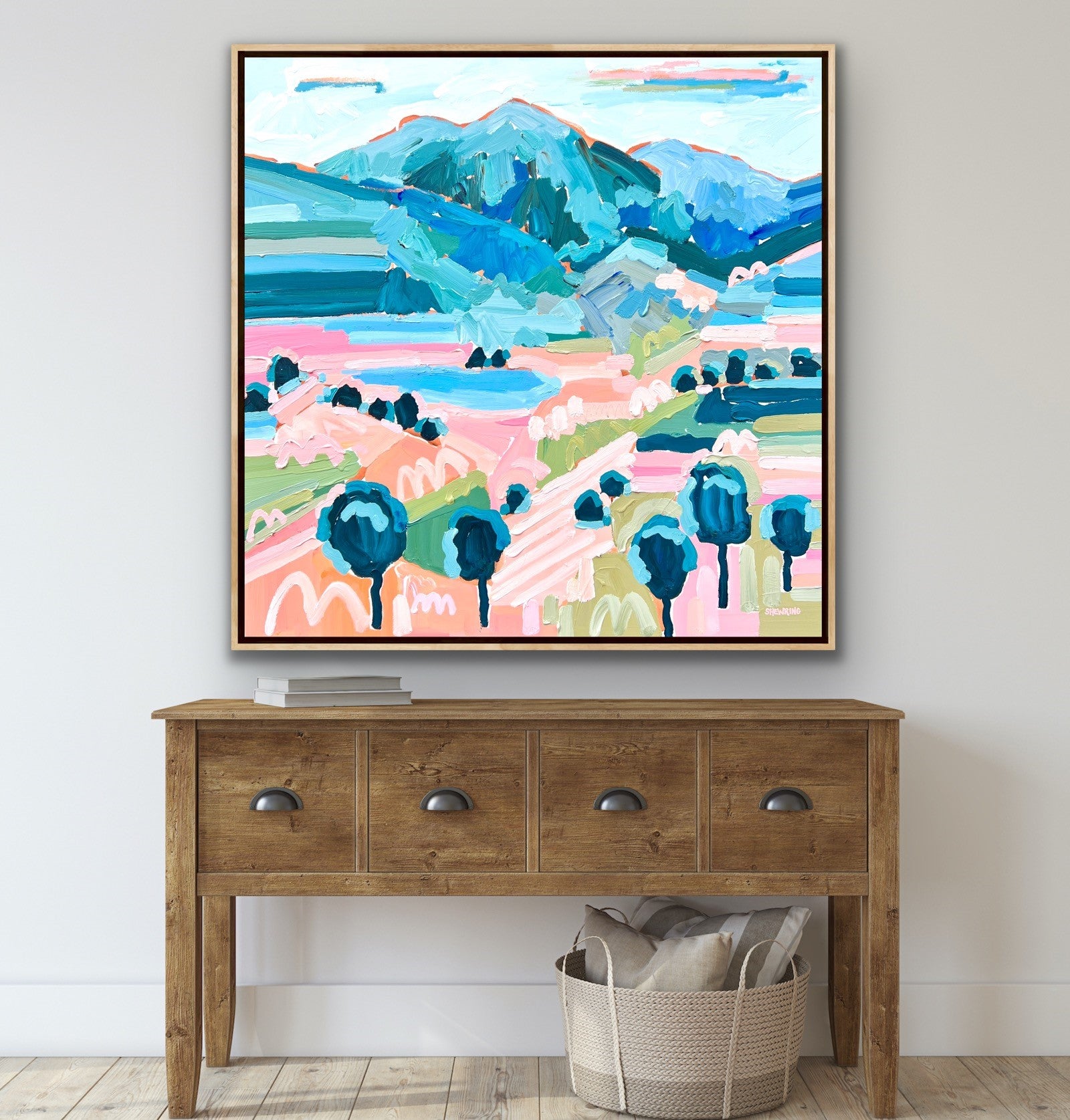 100 x 100 cm Framed in your choice of Tasmanian oak, black painted timber or white painted timber shadow box frame (available unframed - ask Jen for pricing).