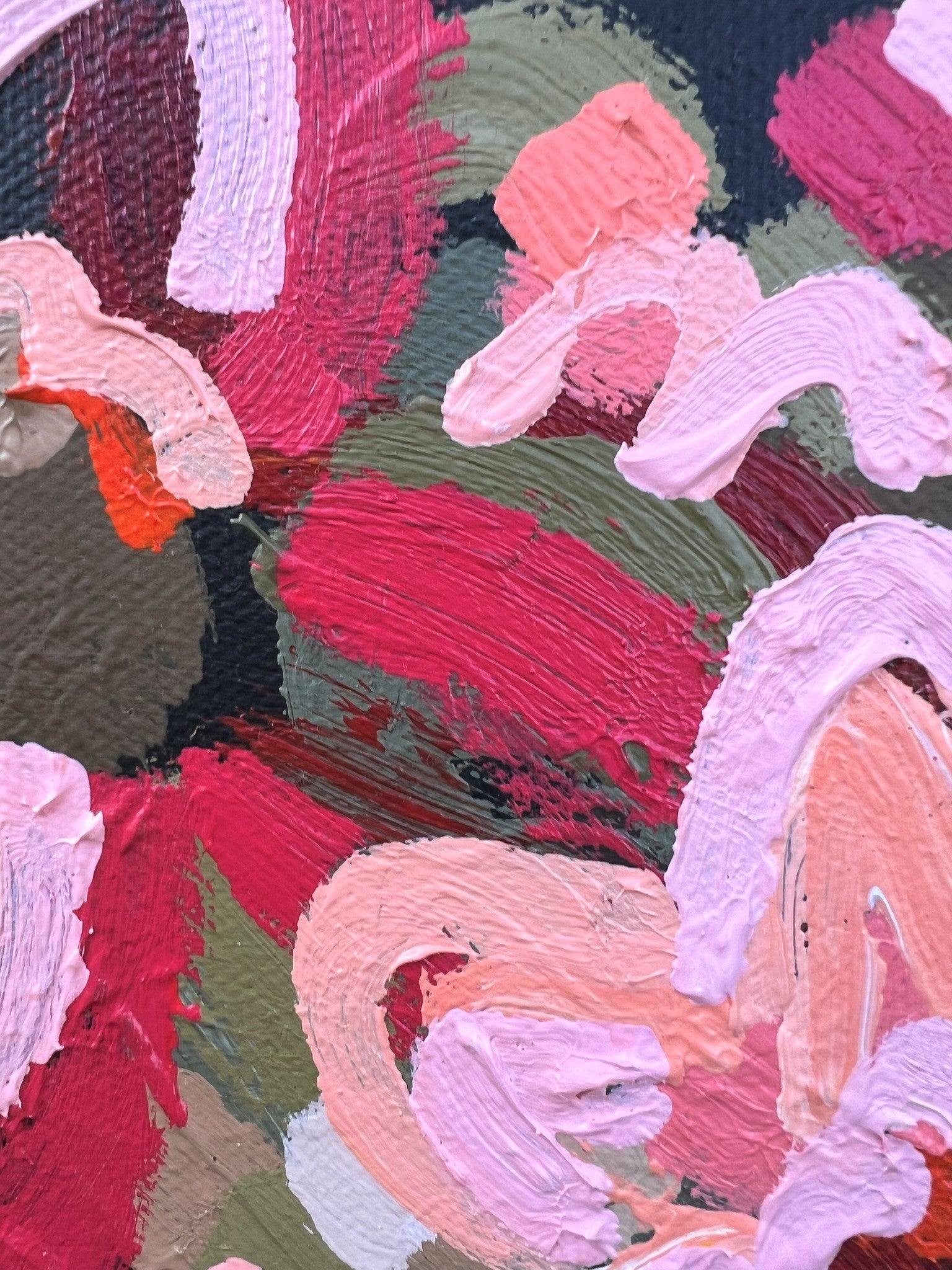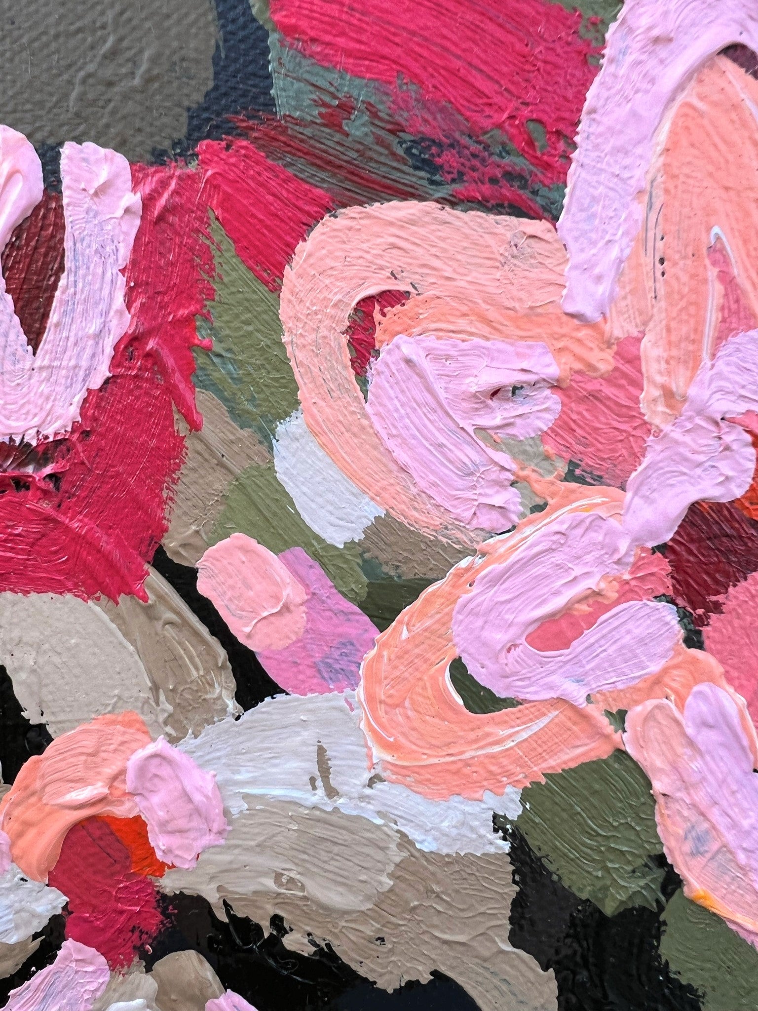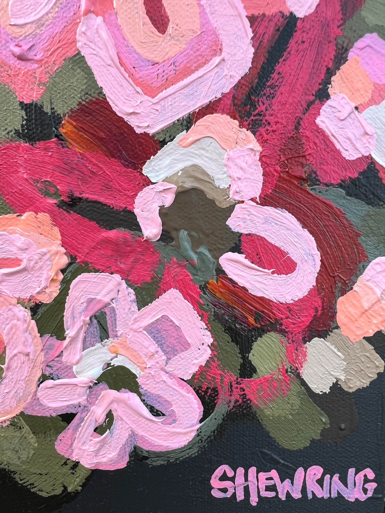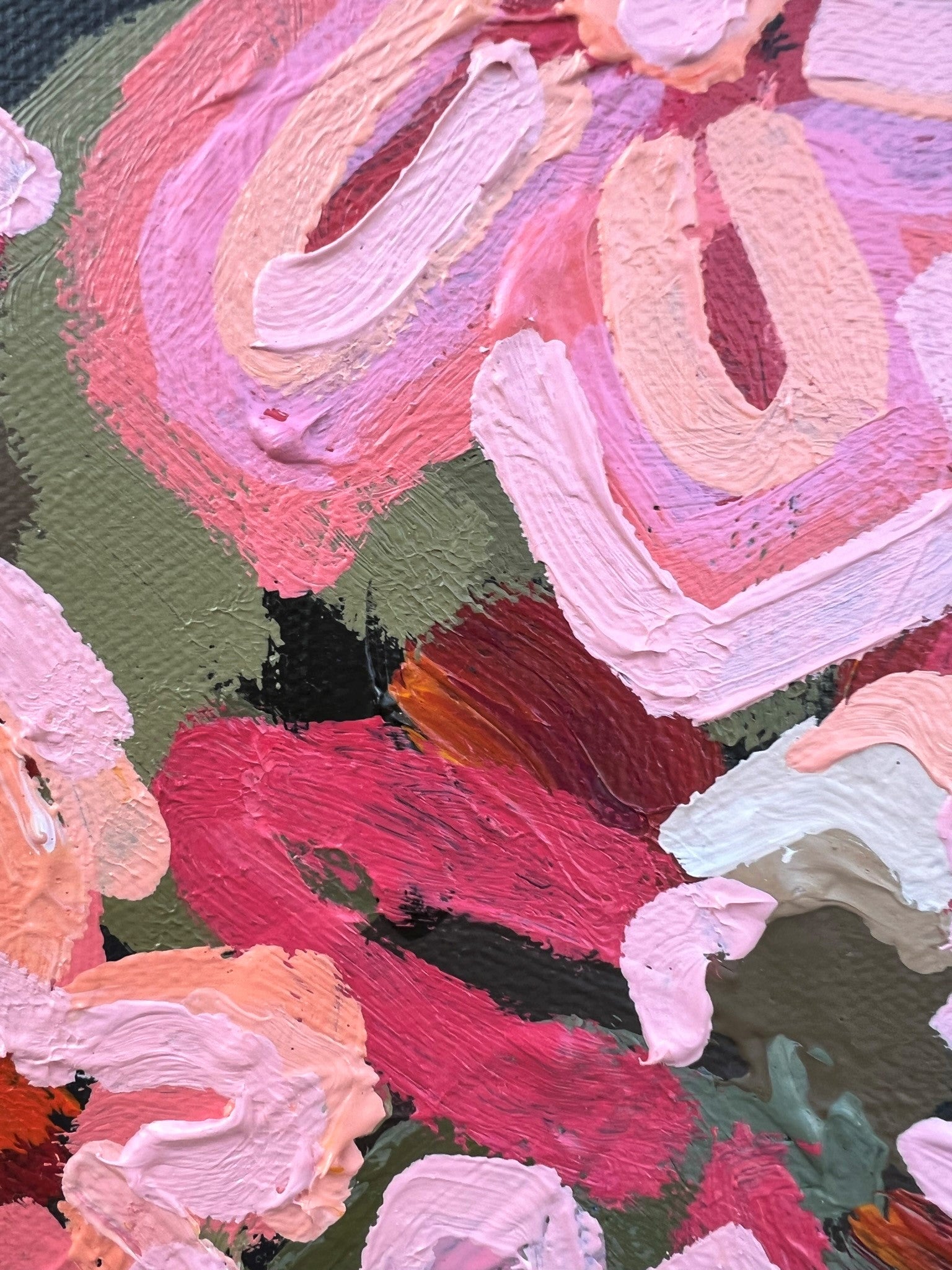 These flowers are painted with texture in an expressive style in vibrant pinks, delicious apricots, peaches, melons, sage and olive green and a touch of soft earthy tones that would suit a range of different decors
