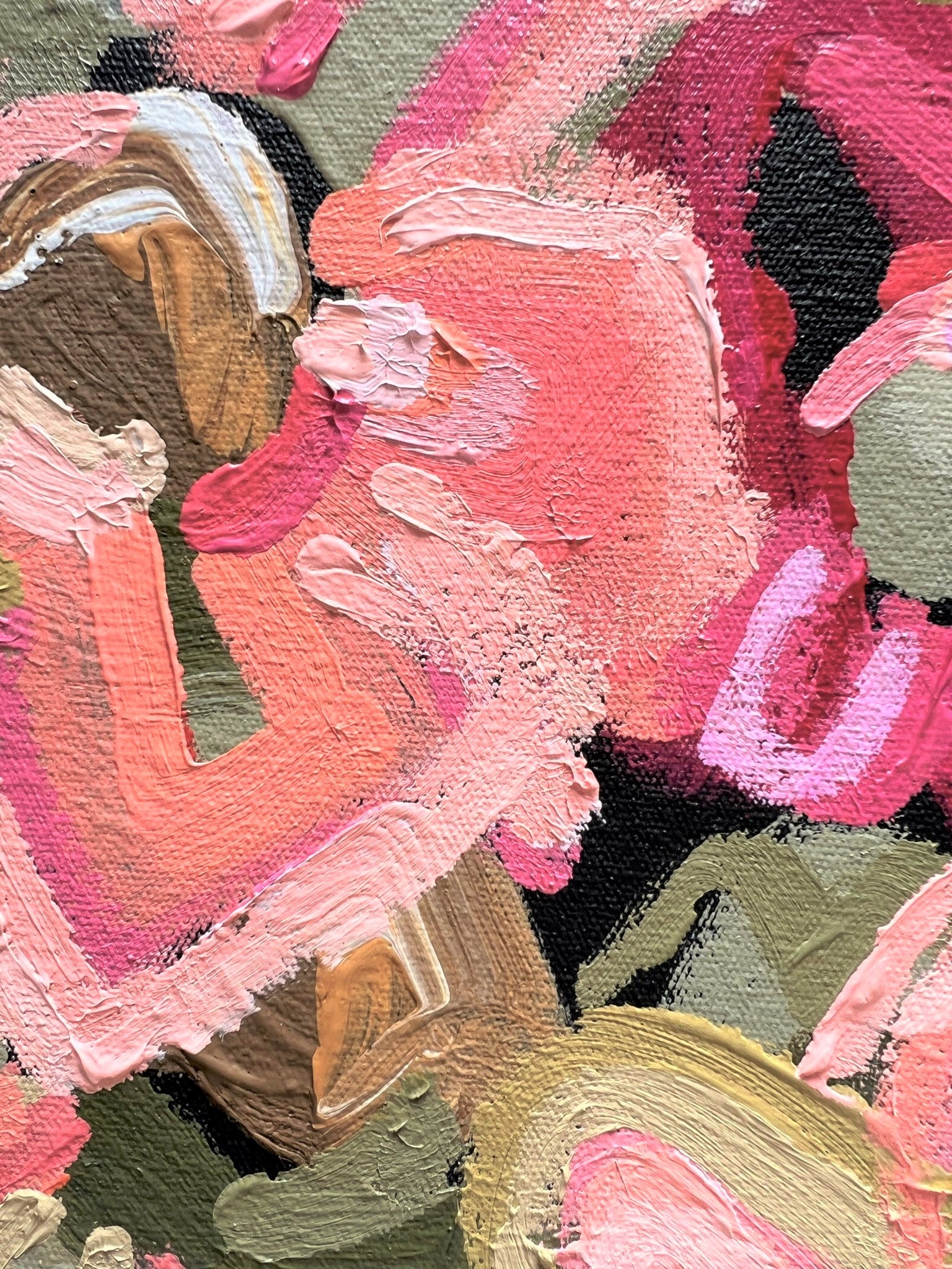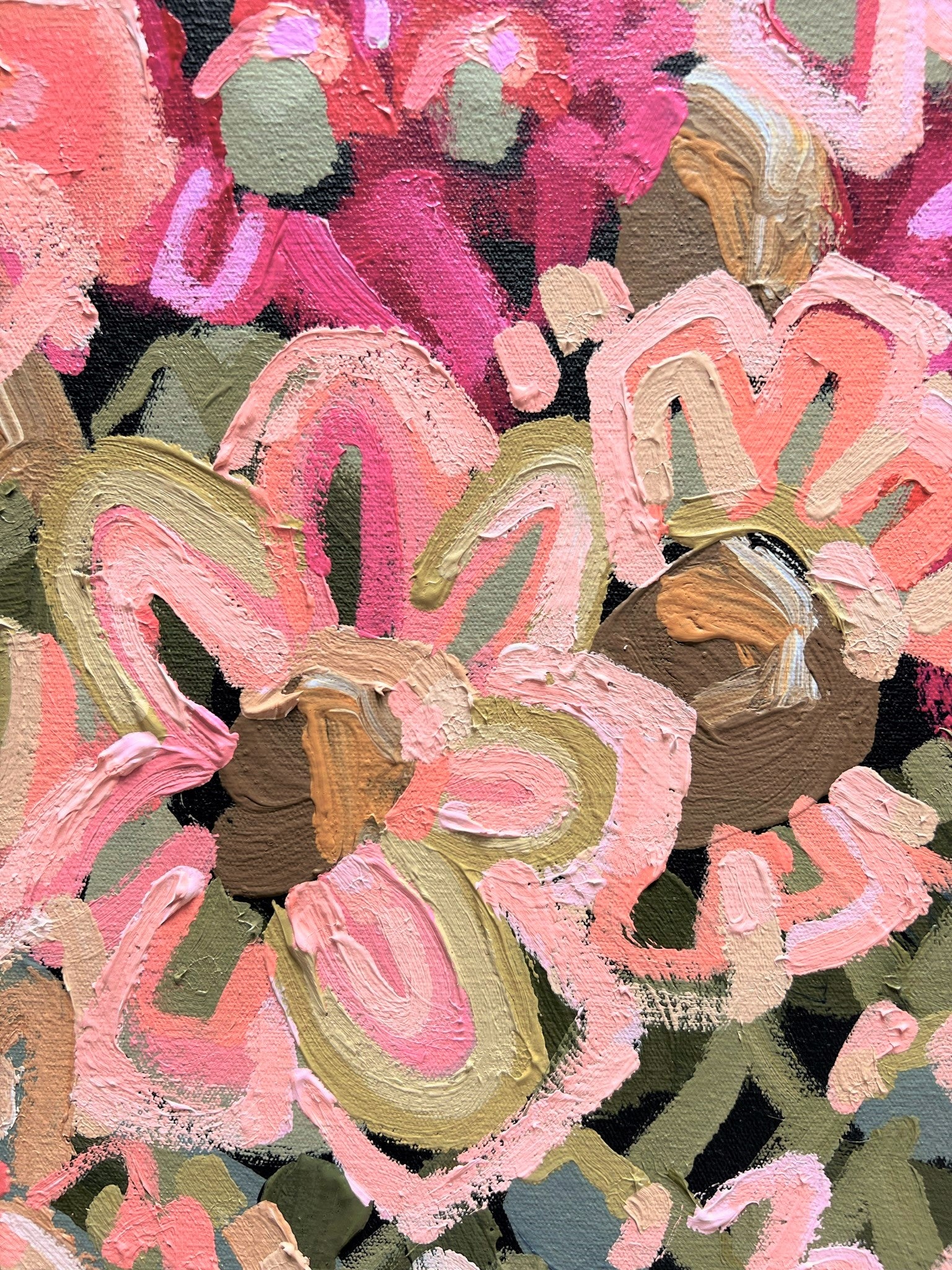 The flowers were created in an expressive style in the colours of love! Eye catching vibrant pinks, delicious apricots, peaches, melons, sage and olive greens have been painted onto a deep charcoal background that would suit a range of different decors.