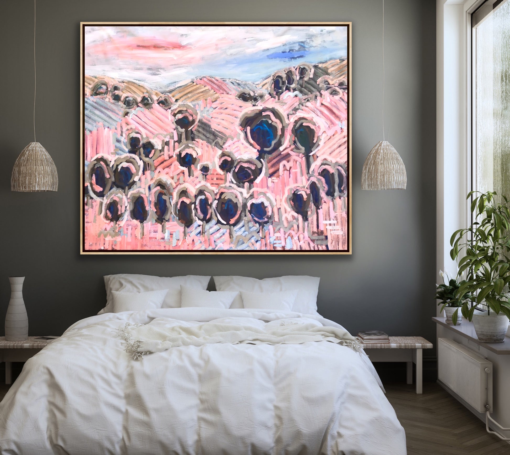 - Painted onto artist professional quality stretched canvas with an external oak or black or white float style frame and internal wooden frame and wire on the back so it is ready to hang (please advise me of your choice of framing).