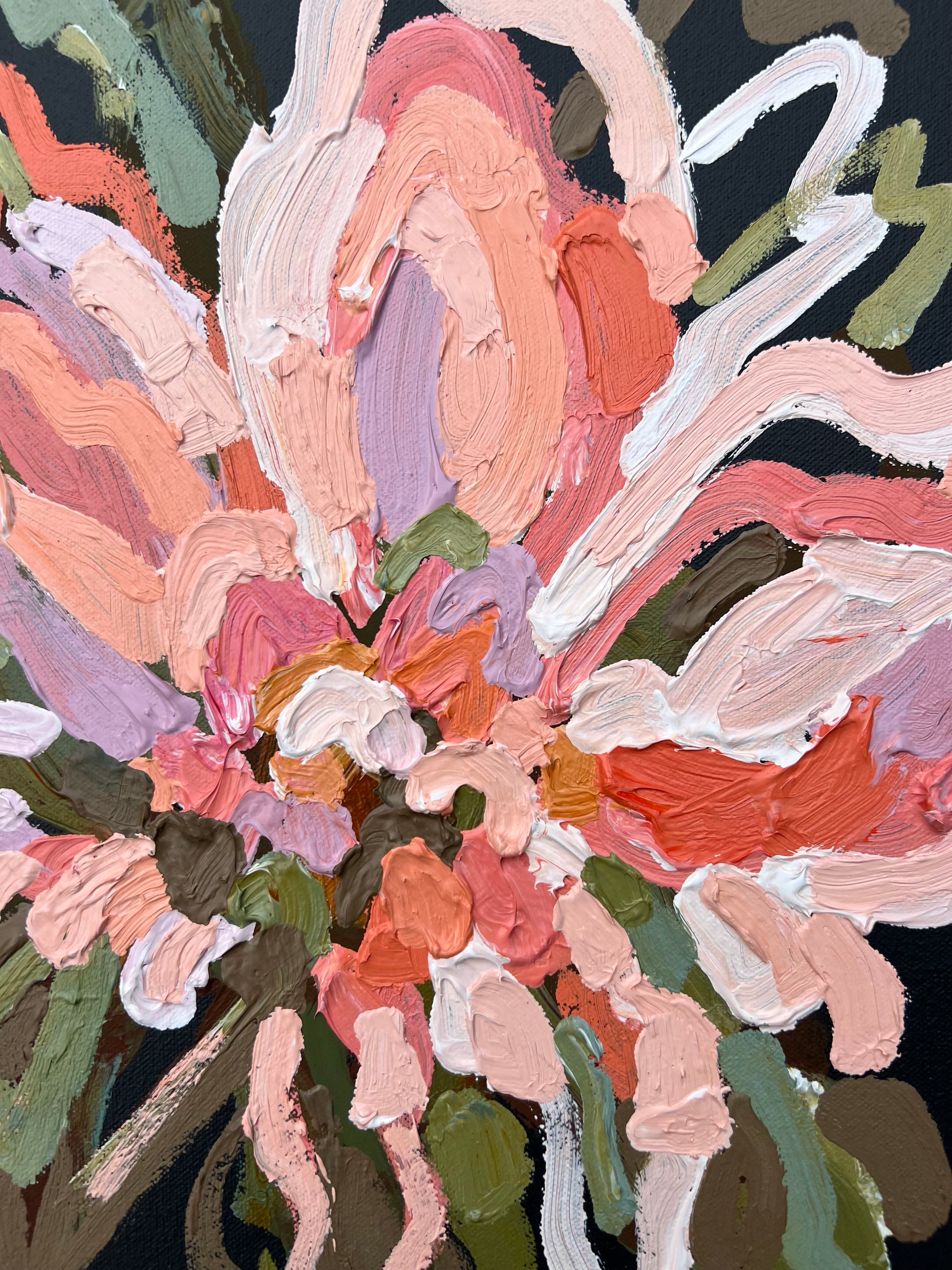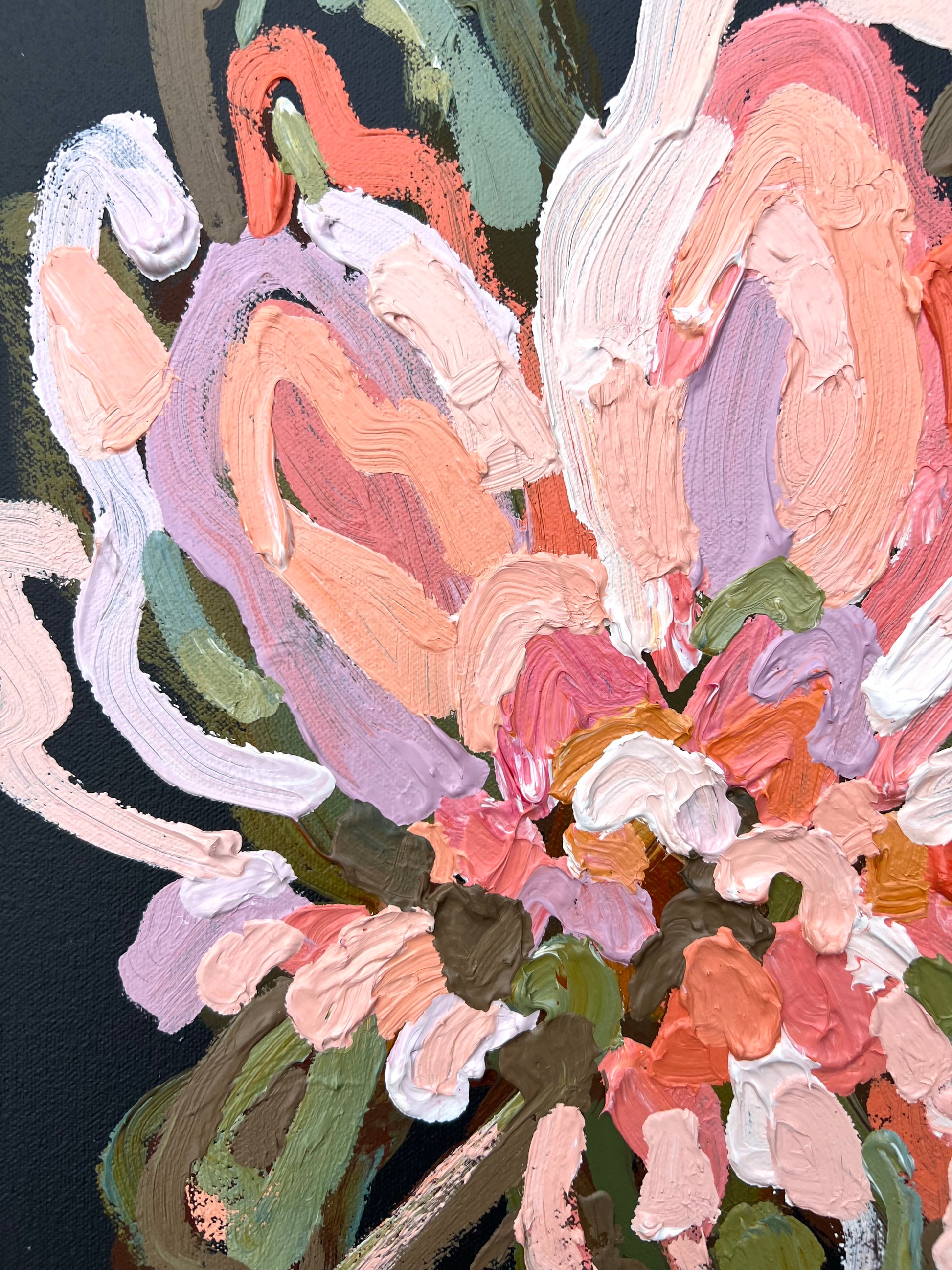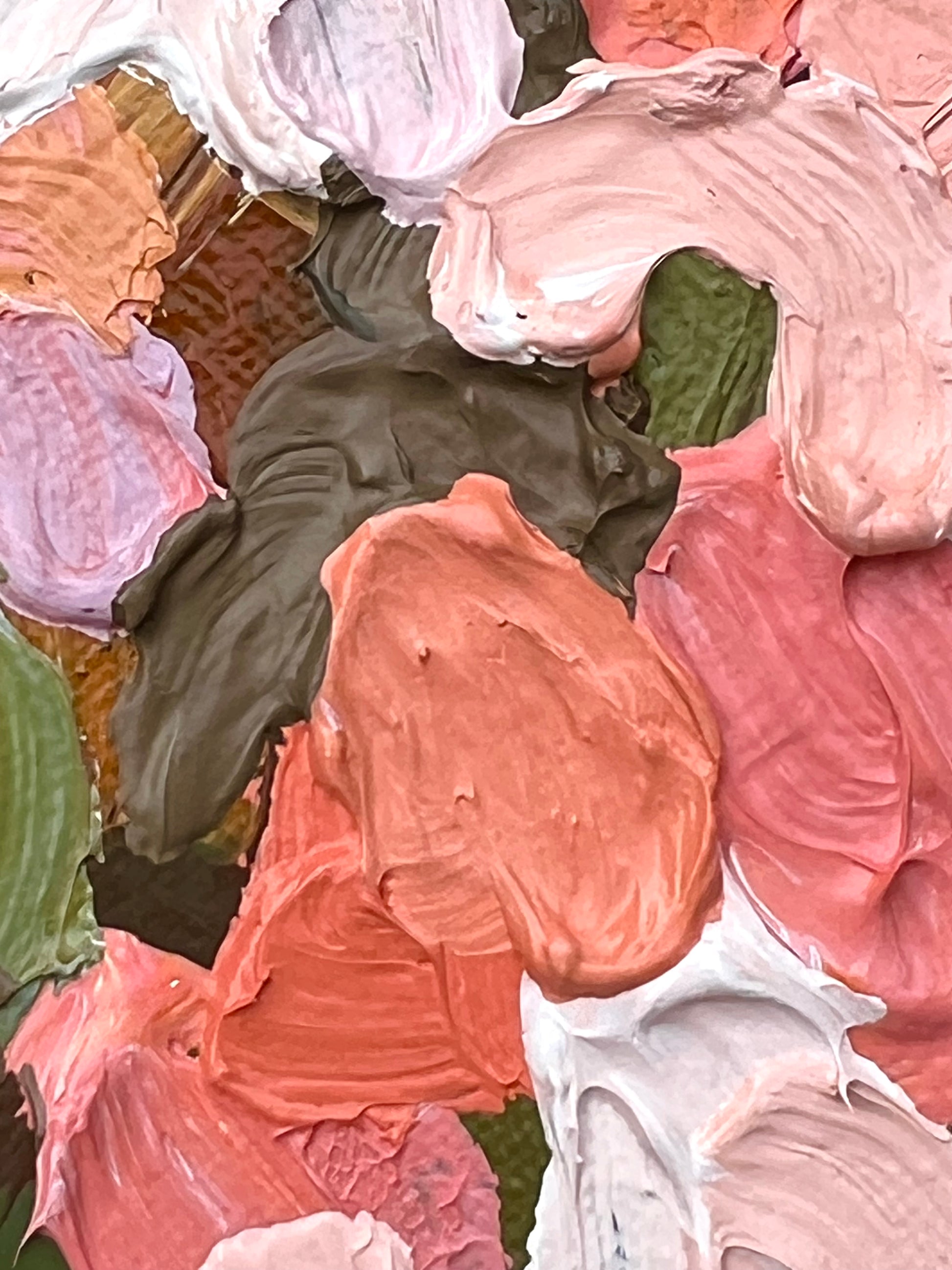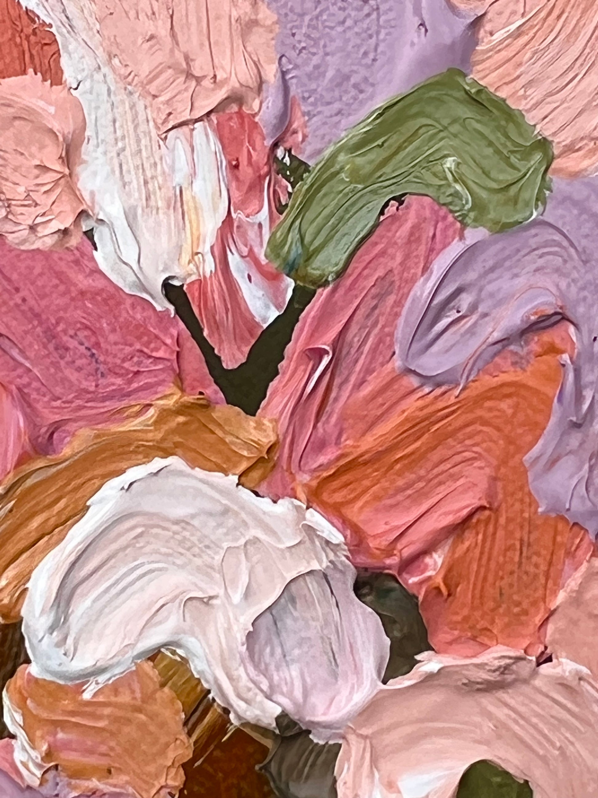 Flower Candy is a beautifully textured flower abstract with gorgeous dusty pinks, peach, lilac and apricot petals with impressions of leaves in sage and olive greens. This painting has expressive individual brushstrokes that bring it to life!