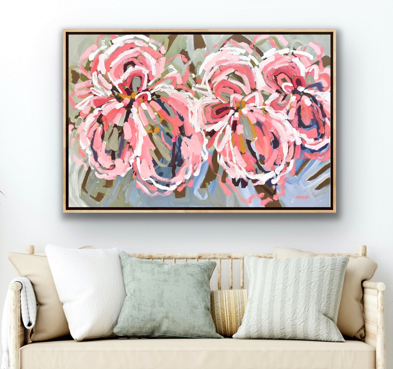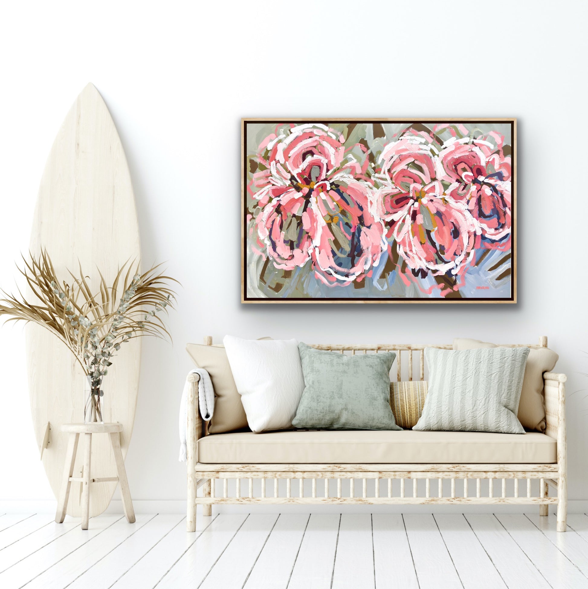 These flowers are painted with texture in an expressive style in vibrant pinks, delicious apricots, peaches, melons, sage green and soft steel blue that would suit a range of different decors.