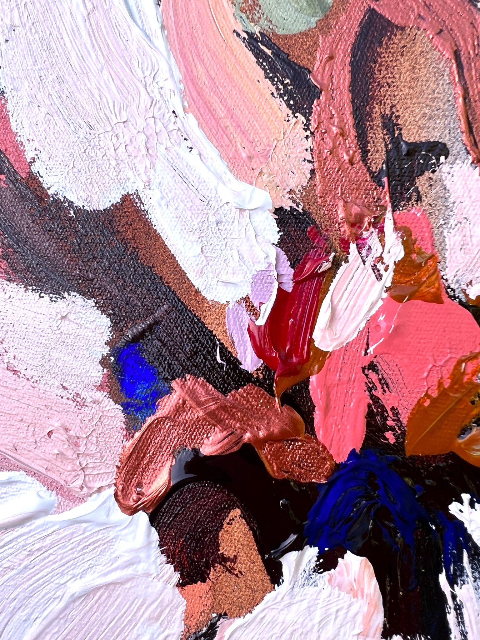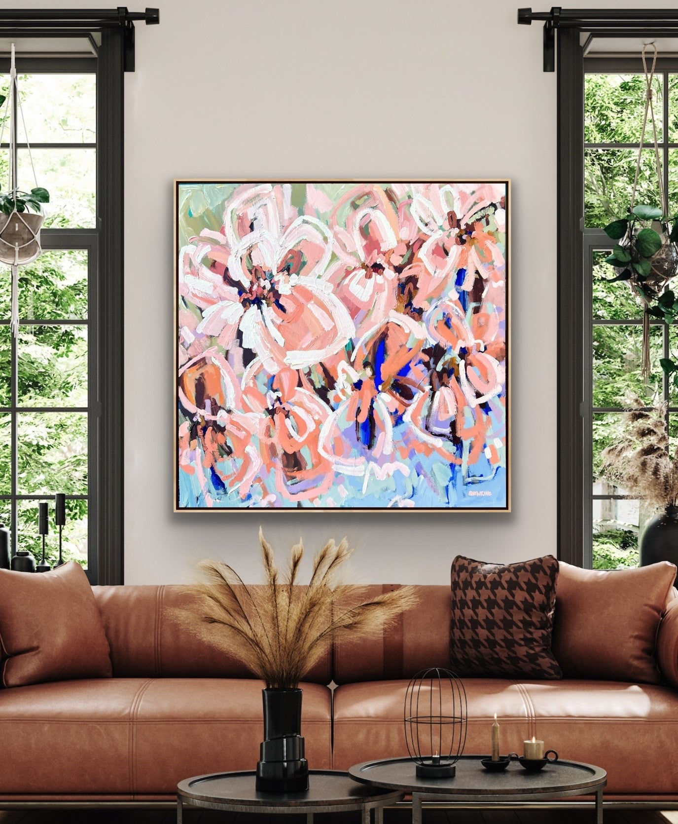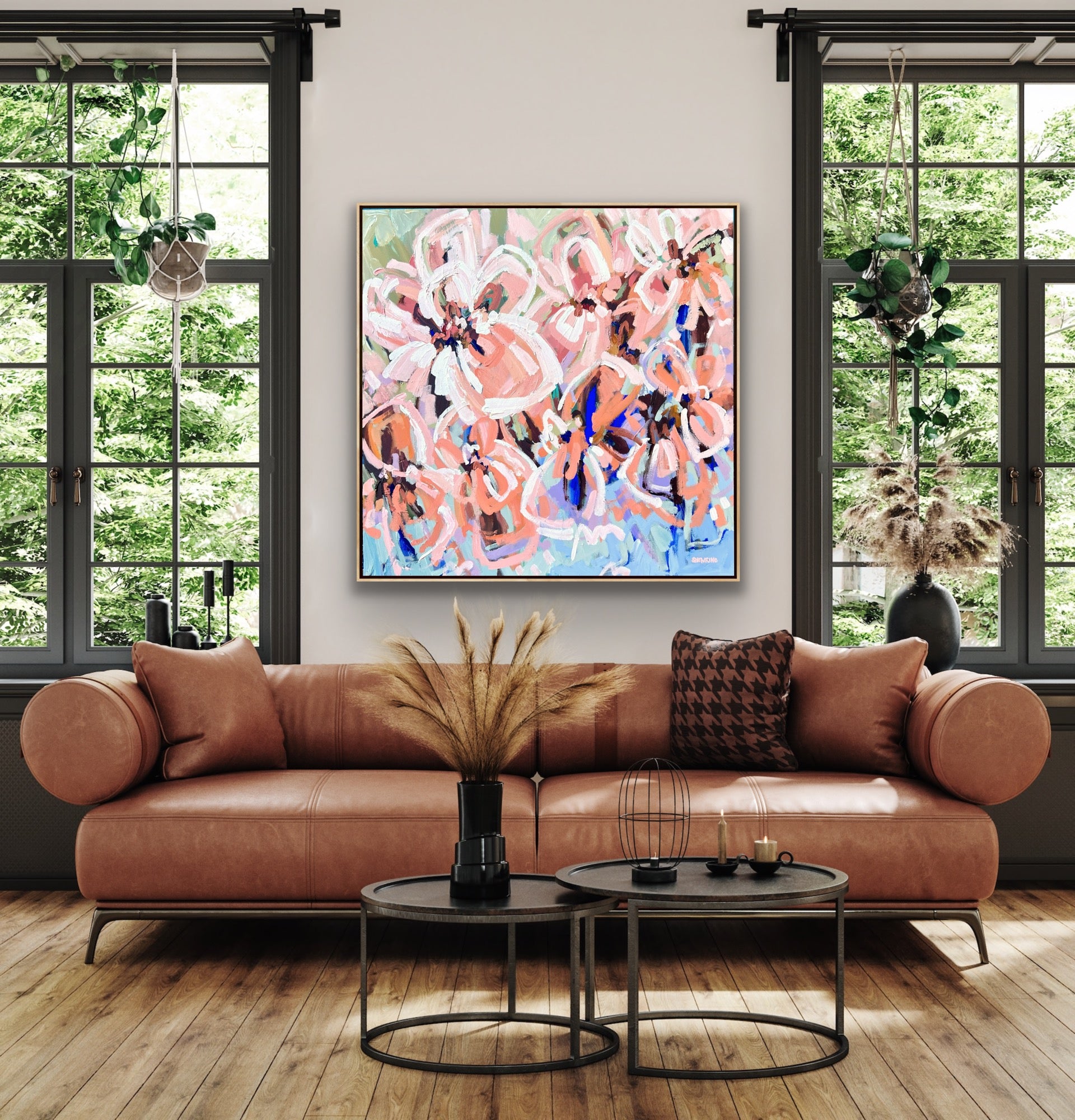 Forever Your Love is a bright and bold flower abstract with chunky paint texture inspired by the delicious summer colours of melons, strawberries and raspberries complimented with shades of gorgeous greens and blues and a touch of bronze. This painting has the passionate colours of love!