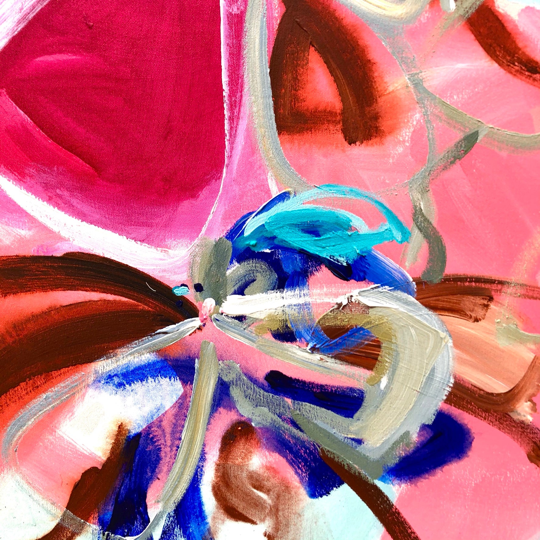 Forever Yours is a bright and really happy flower abstract with delicious melon and berry colours inspired by the beautiful petals in my garden along with a splash of warm earth tones and a sparkle of copper paint. The impressionistic style of the organic shapes were created from my many sketches of foliage and painted in olive greens, navy blues and a touch of turquoise.