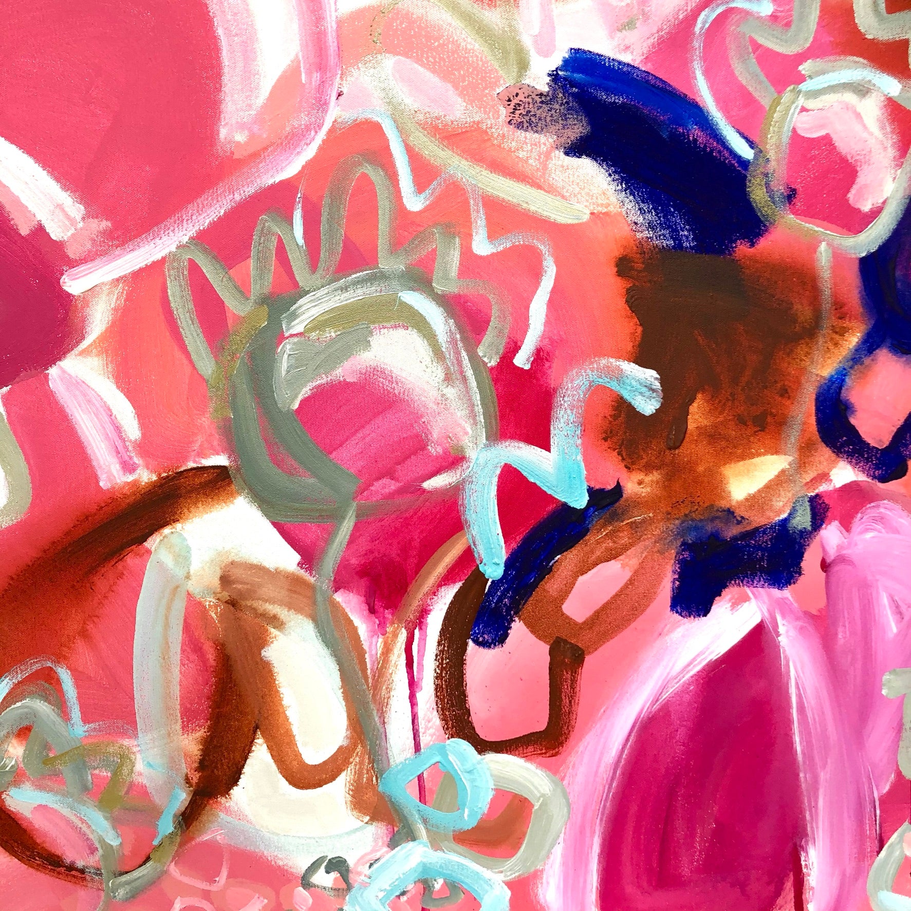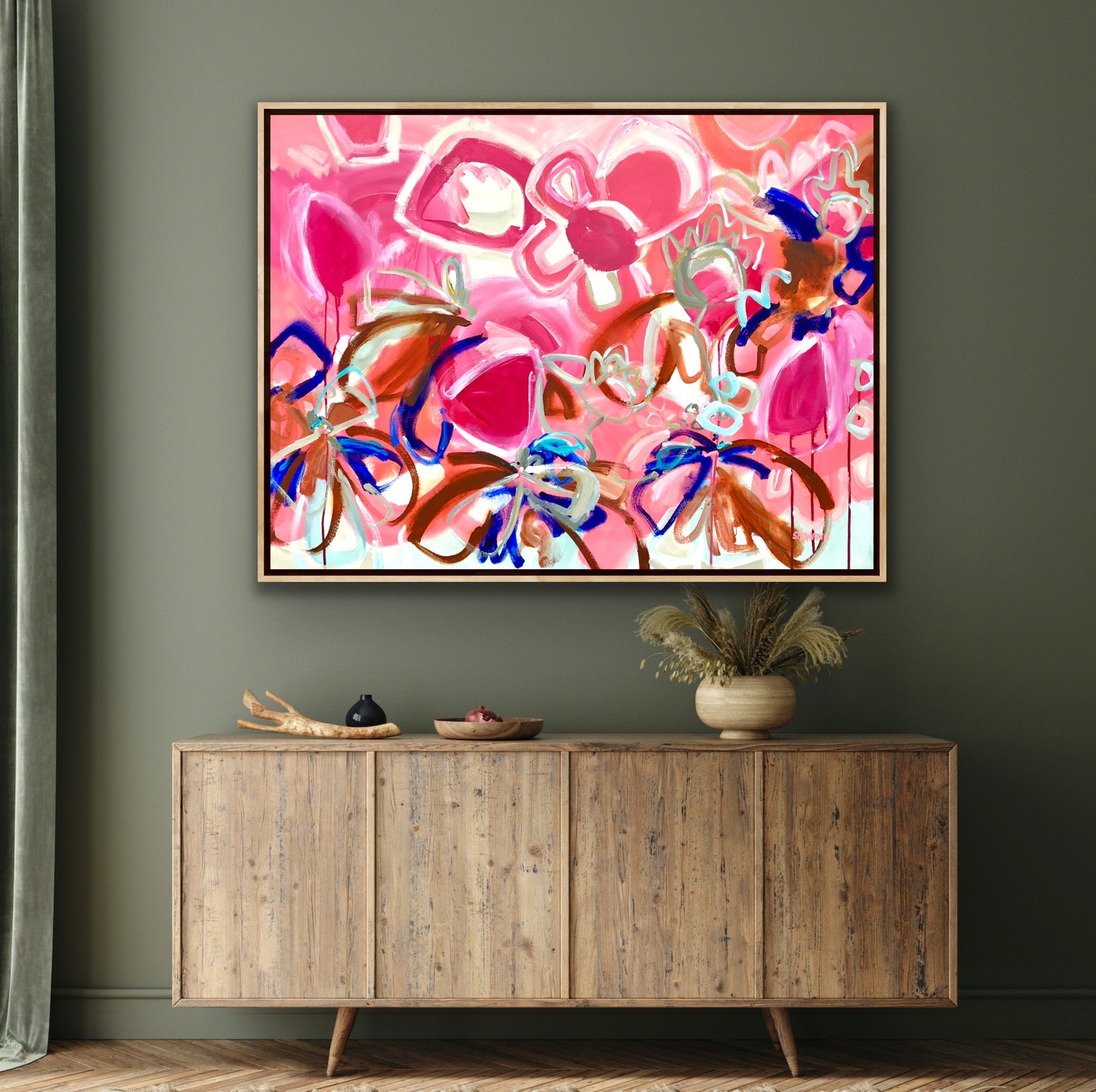 Forever Yours is a bright and really happy flower abstract with delicious melon and berry colours inspired by the beautiful petals in my garden along with a splash of warm earth tones and a sparkle of copper. The impressionistic style of the organic shapes were created from my many sketches of foliage and painted in olive greens, navy blues and a touch of turquoise.
