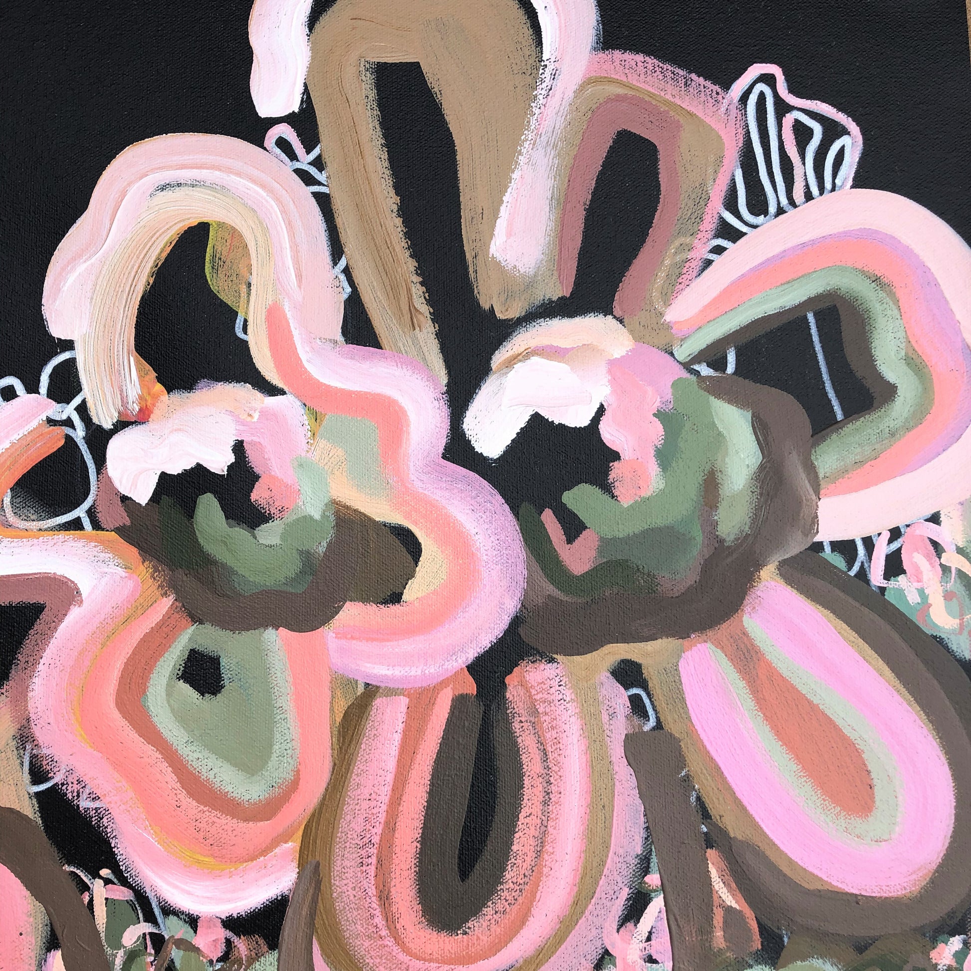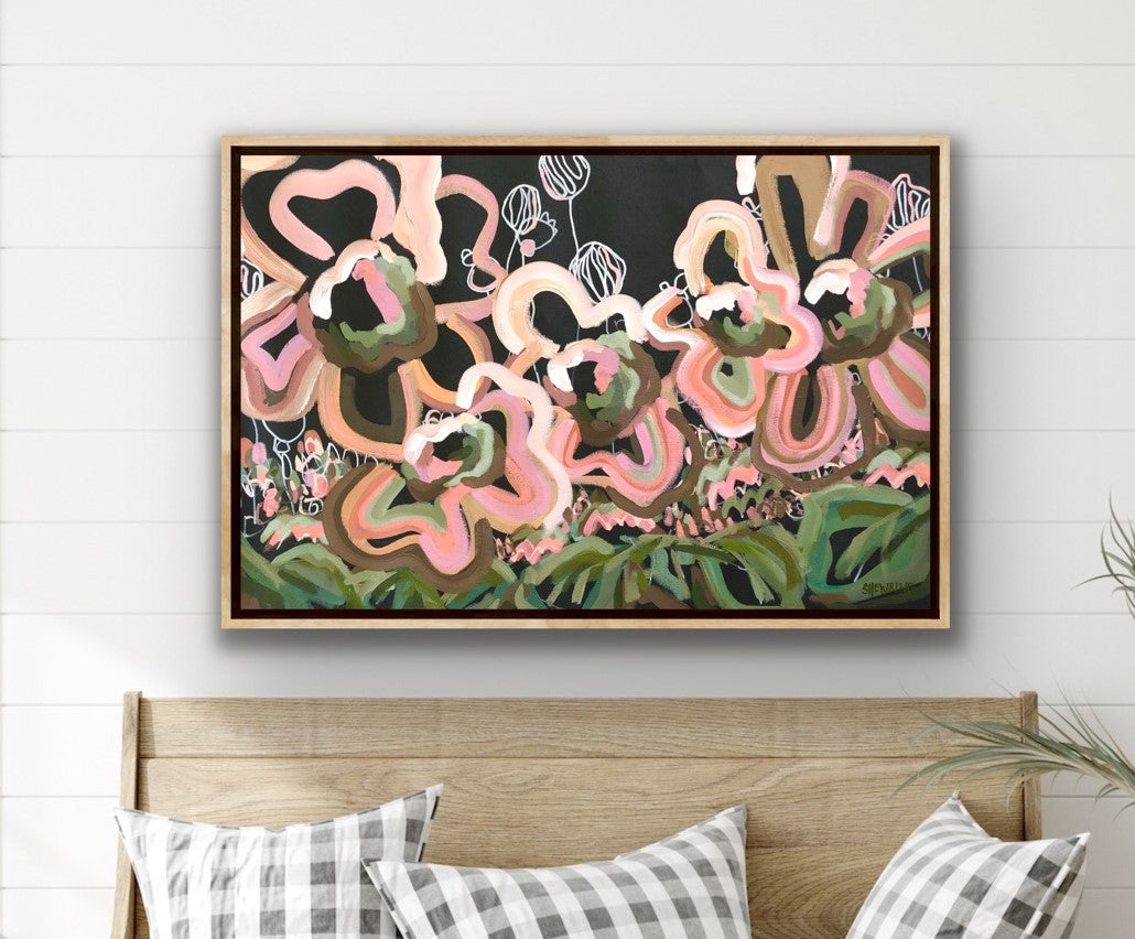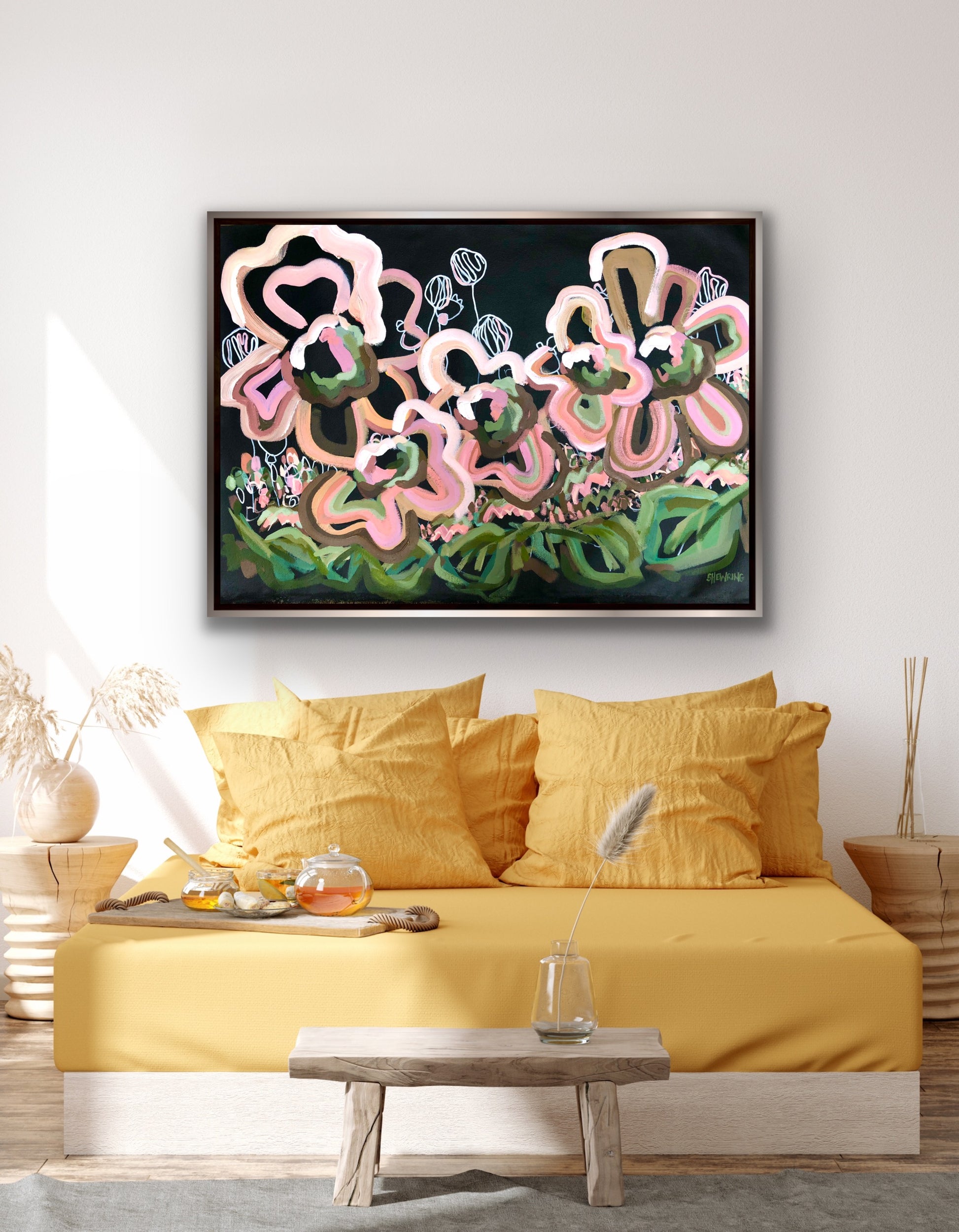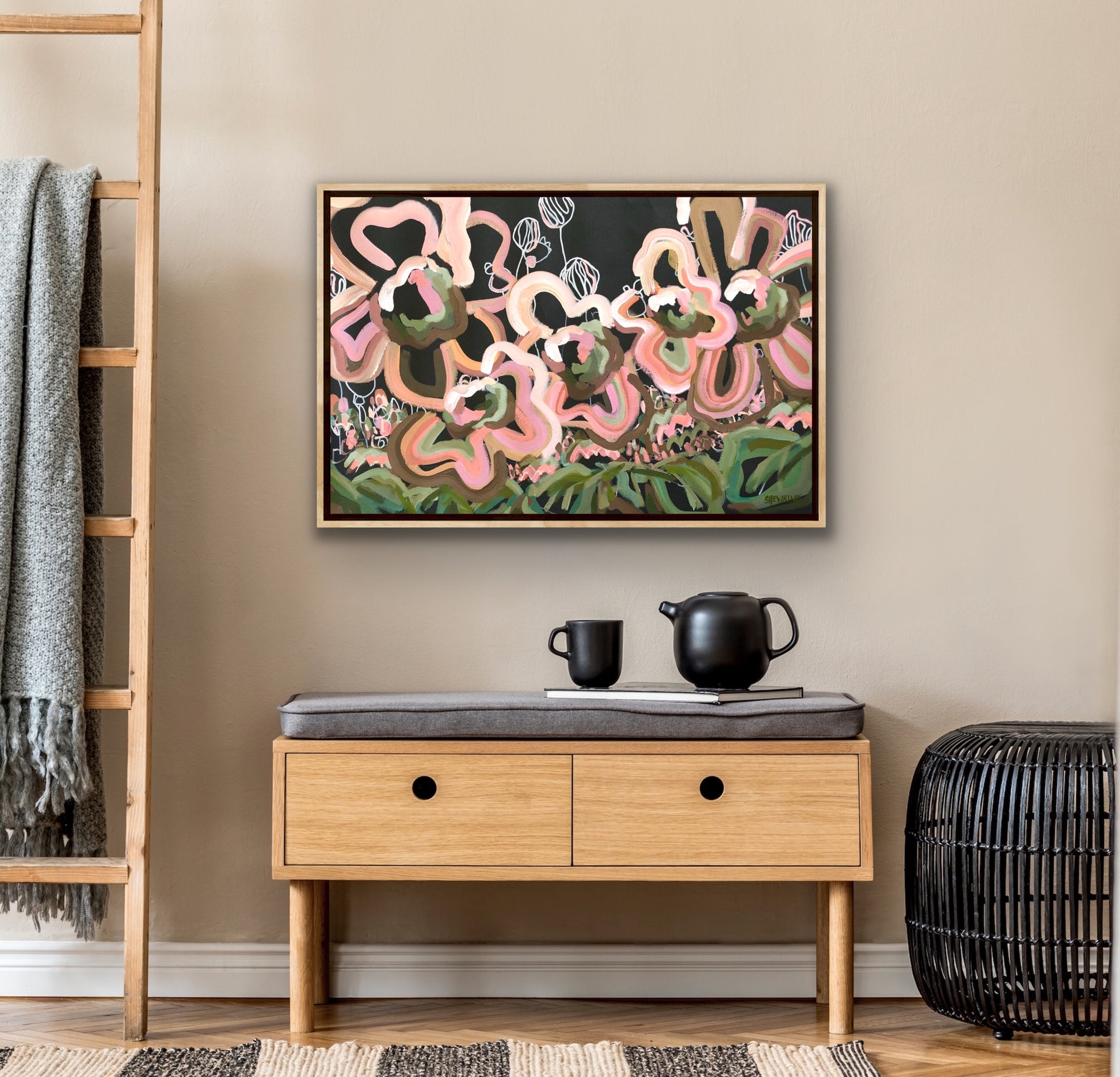 Groovy Love is playful and has loads of retro fun! I really enjoyed painting this one and I think the positive vibes come across in the painting, I would love to share this happiness with you. This artwork is full of life, movement and colour with flowers and loose foliage shapes inspired by nature.