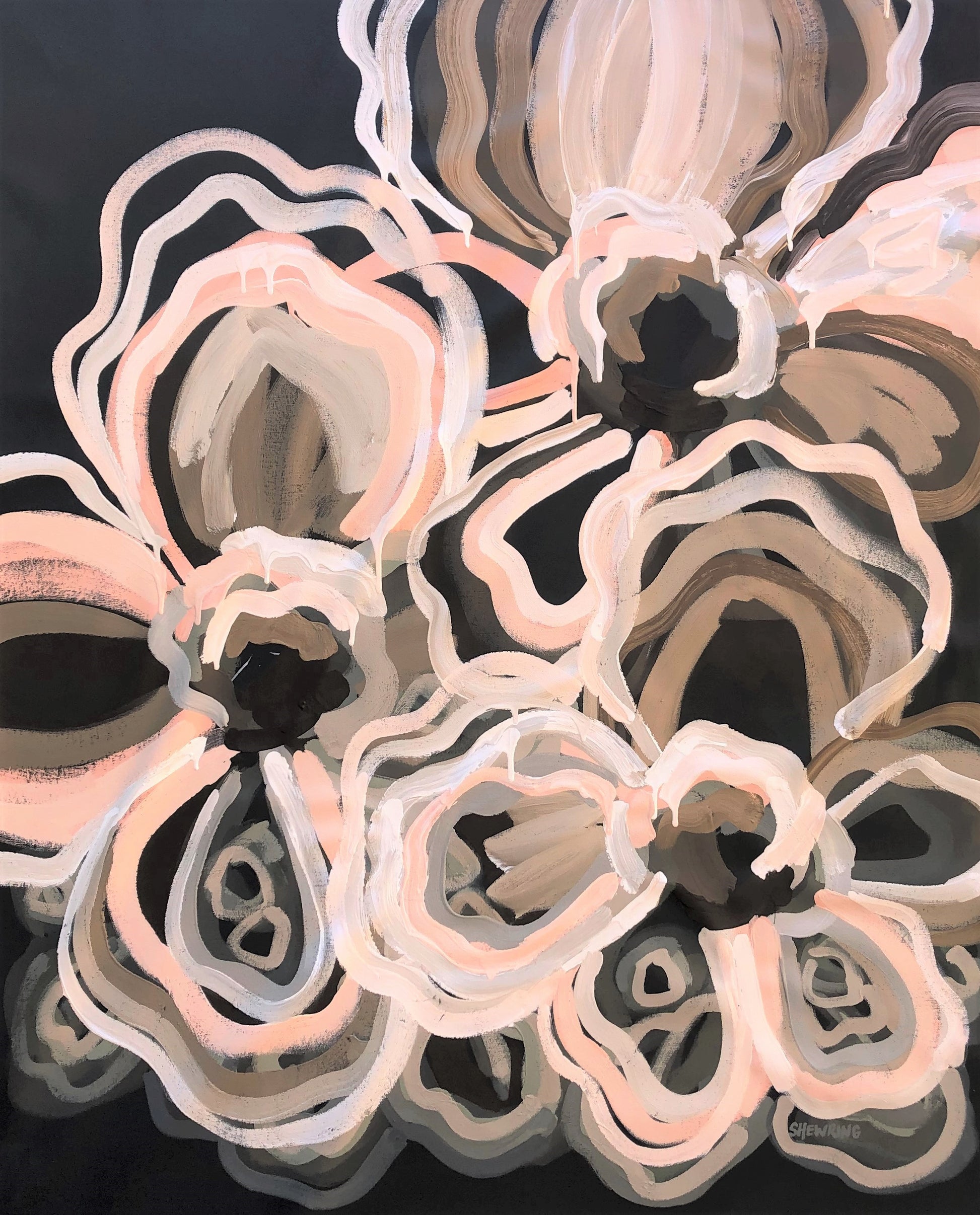 My artwork is full of life, movement and colour with loose organic shapes taken from nature. In this painting I place their beauty over a dramatic warm charcoal background.