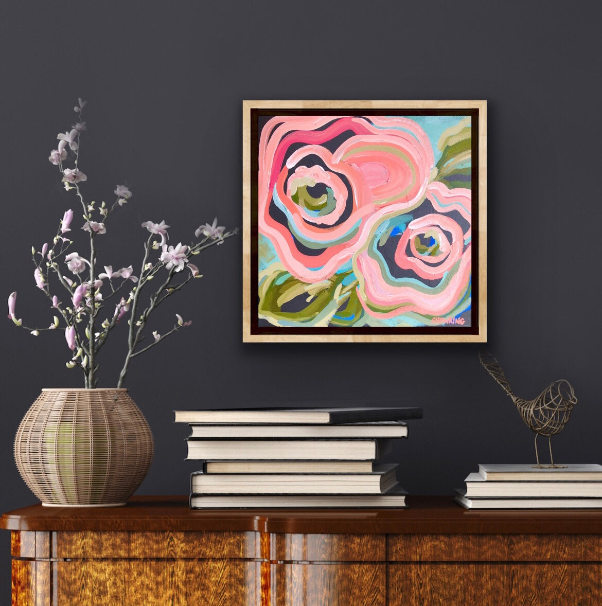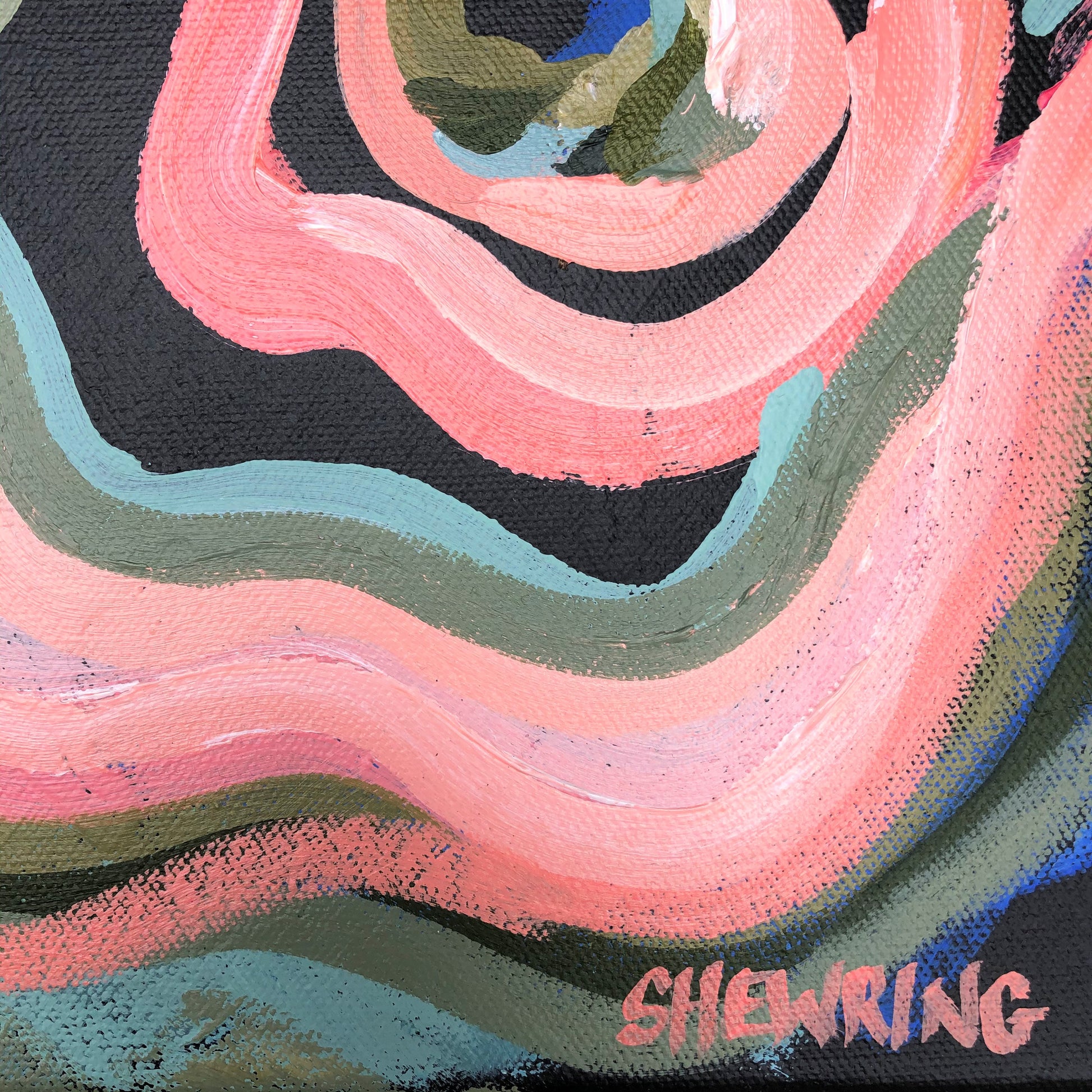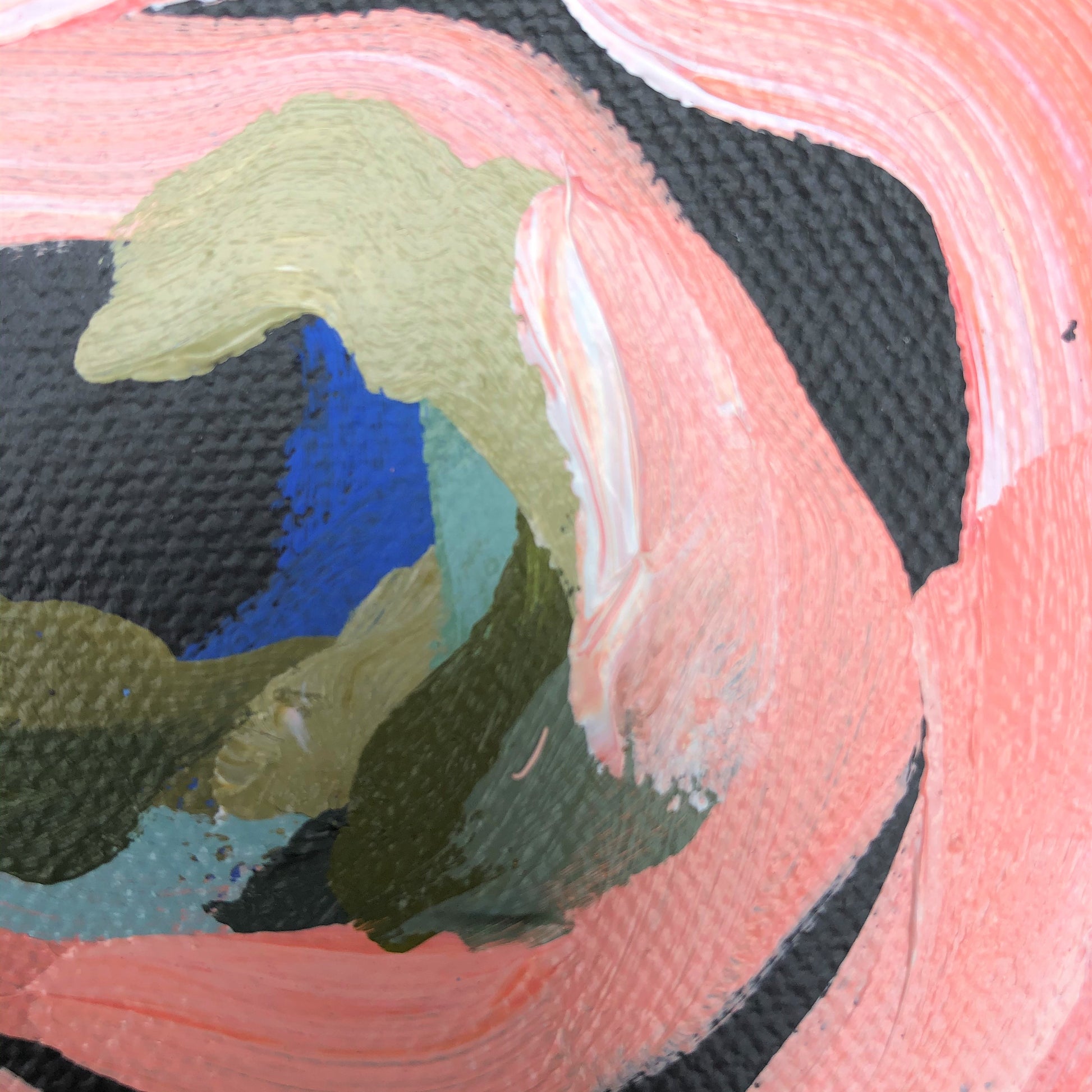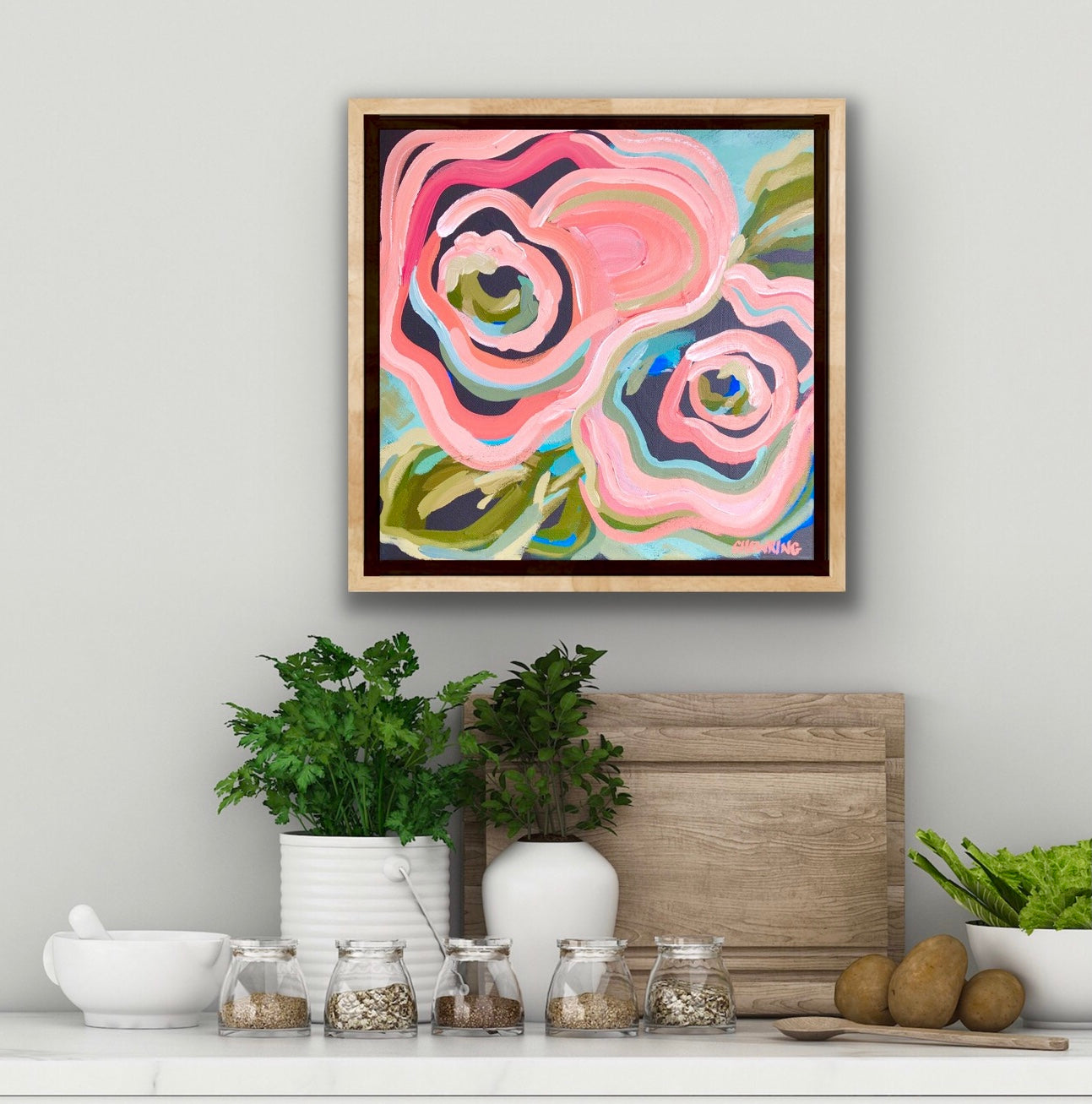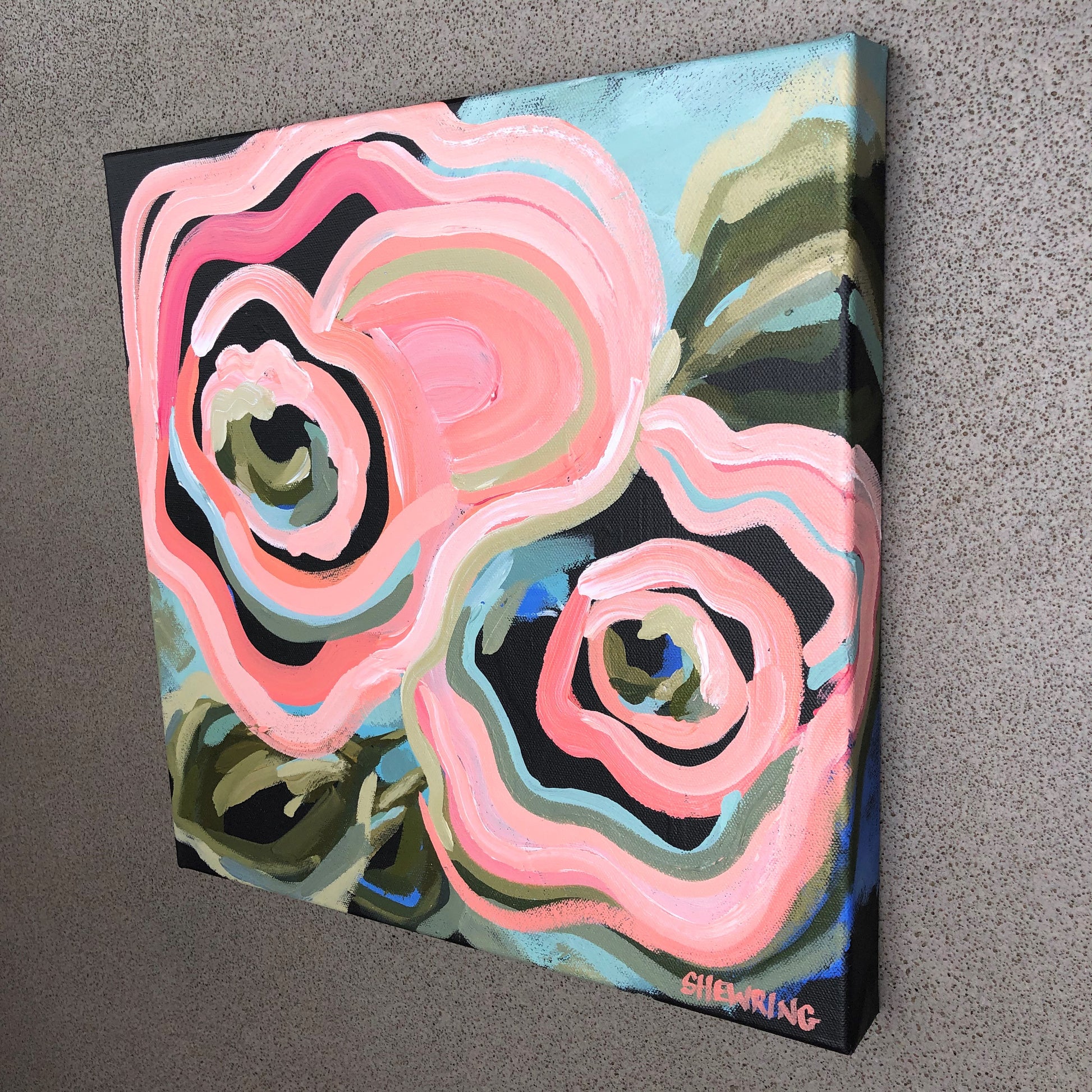 Love In Motion is a bright flower abstract with delicious colour of watermelon along with highlights of sky blue, mint and olive greens. This painting has expressive individual brushstrokes that bring it to life!