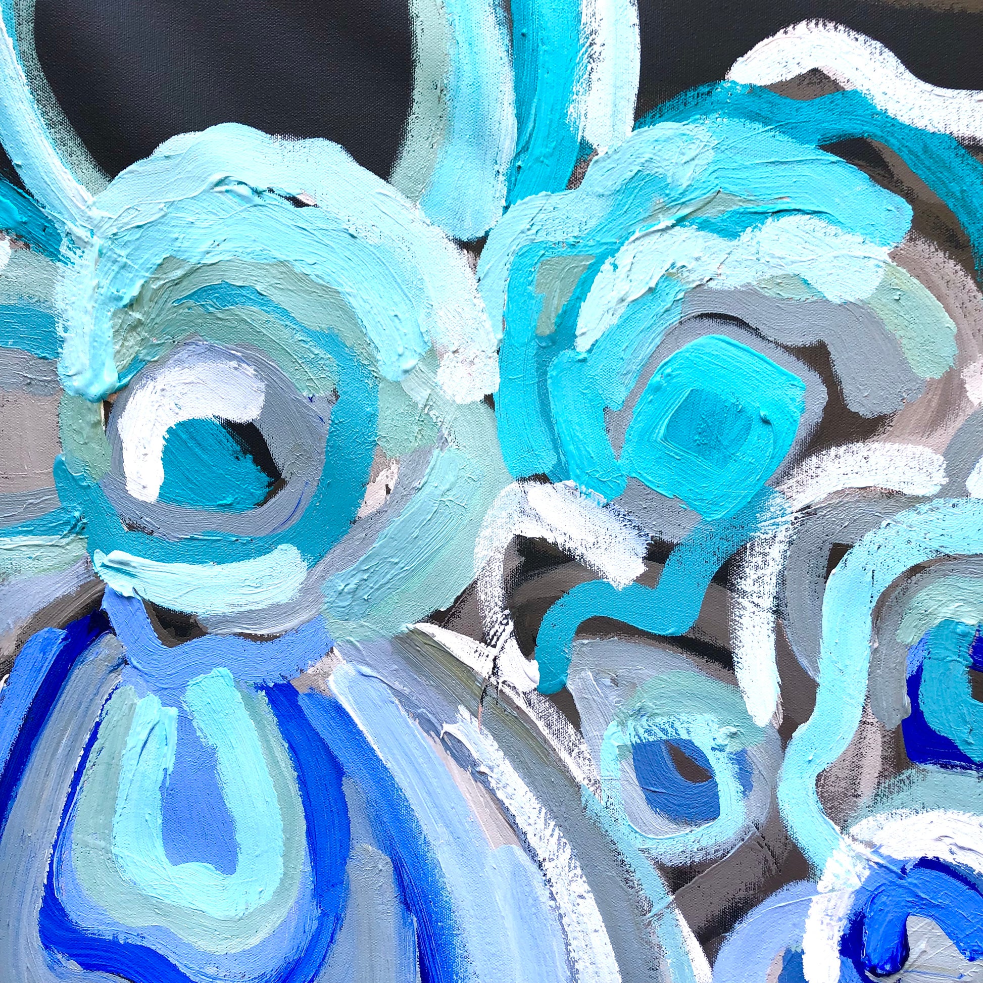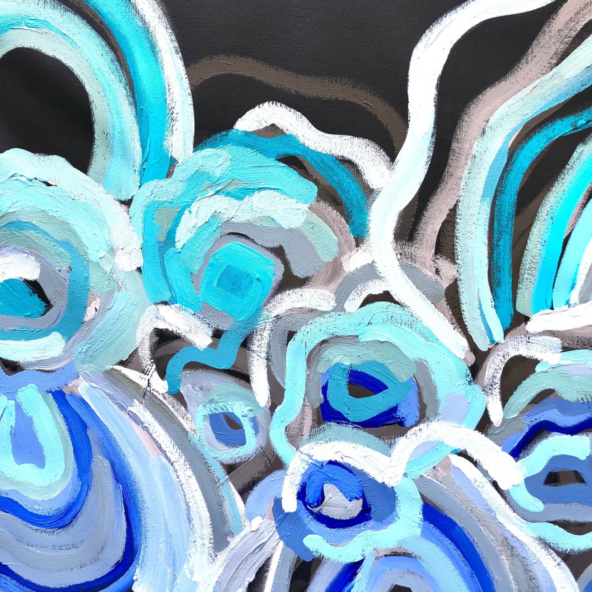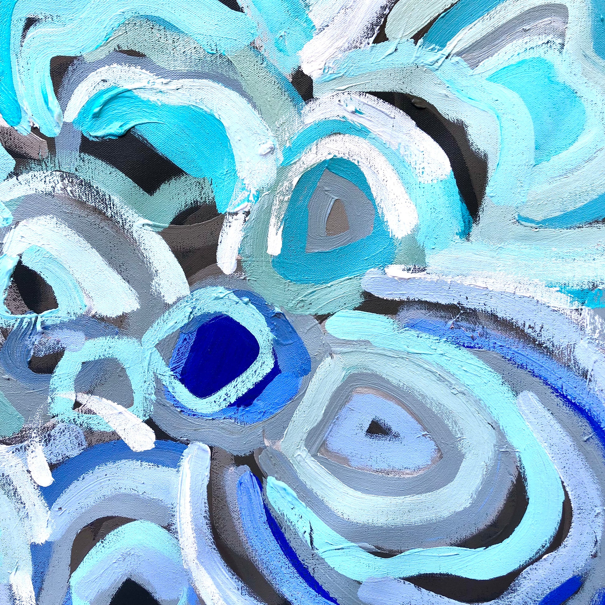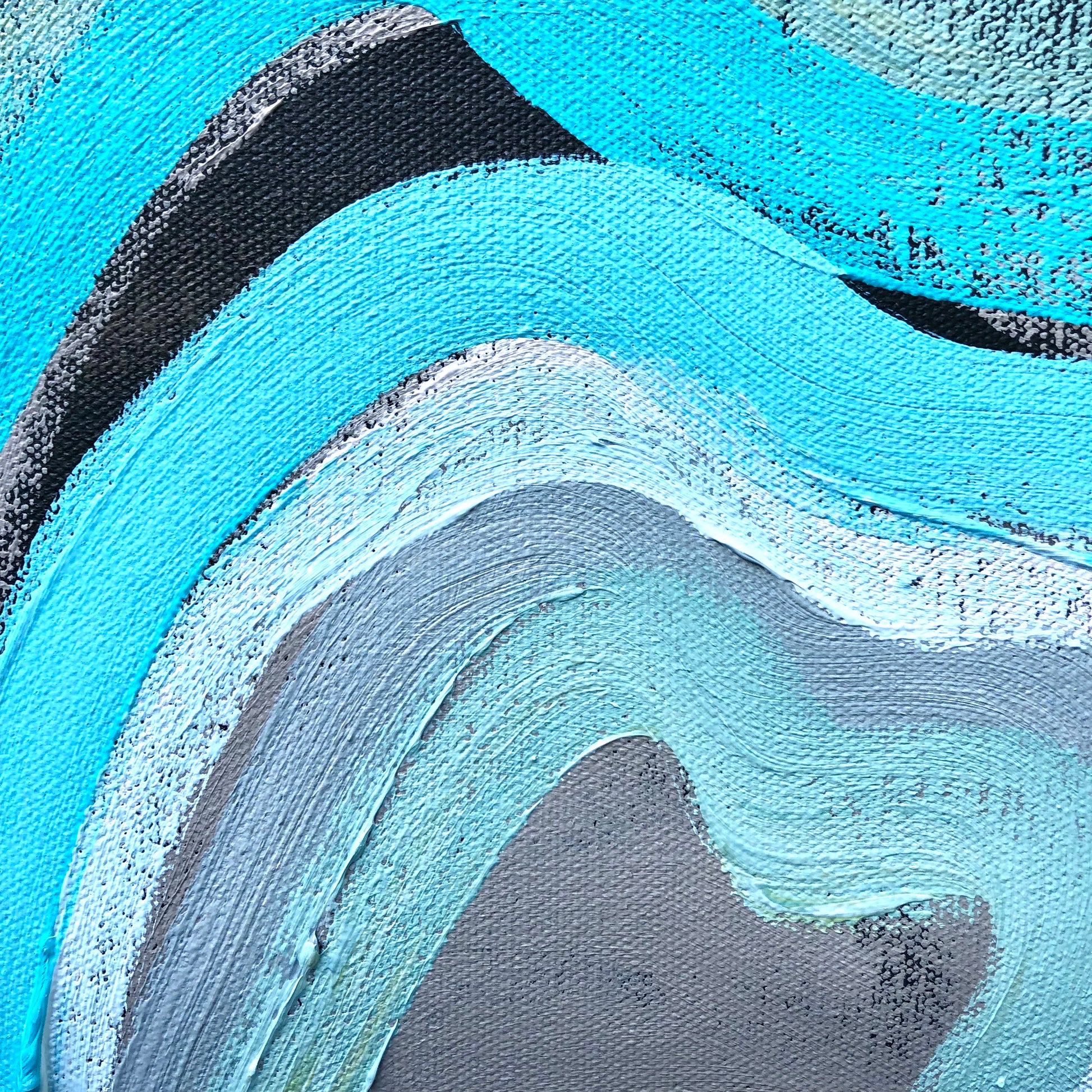 Love Infusion packs a big bright punch of bold organic shapes inspired by nature! Powerful textured abstract with shades of bright blues and turquoise overlapping the rich earthy warm dark grey tones. This painting has expressive individual brushstrokes that bring it to life!
