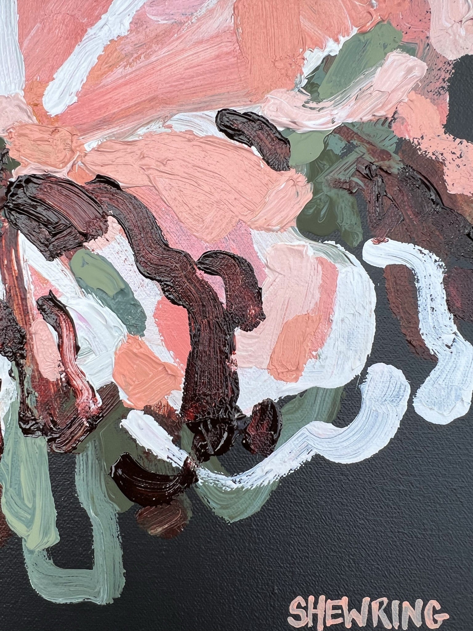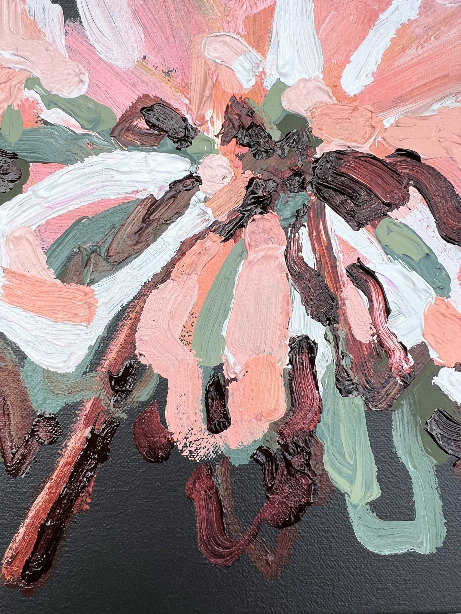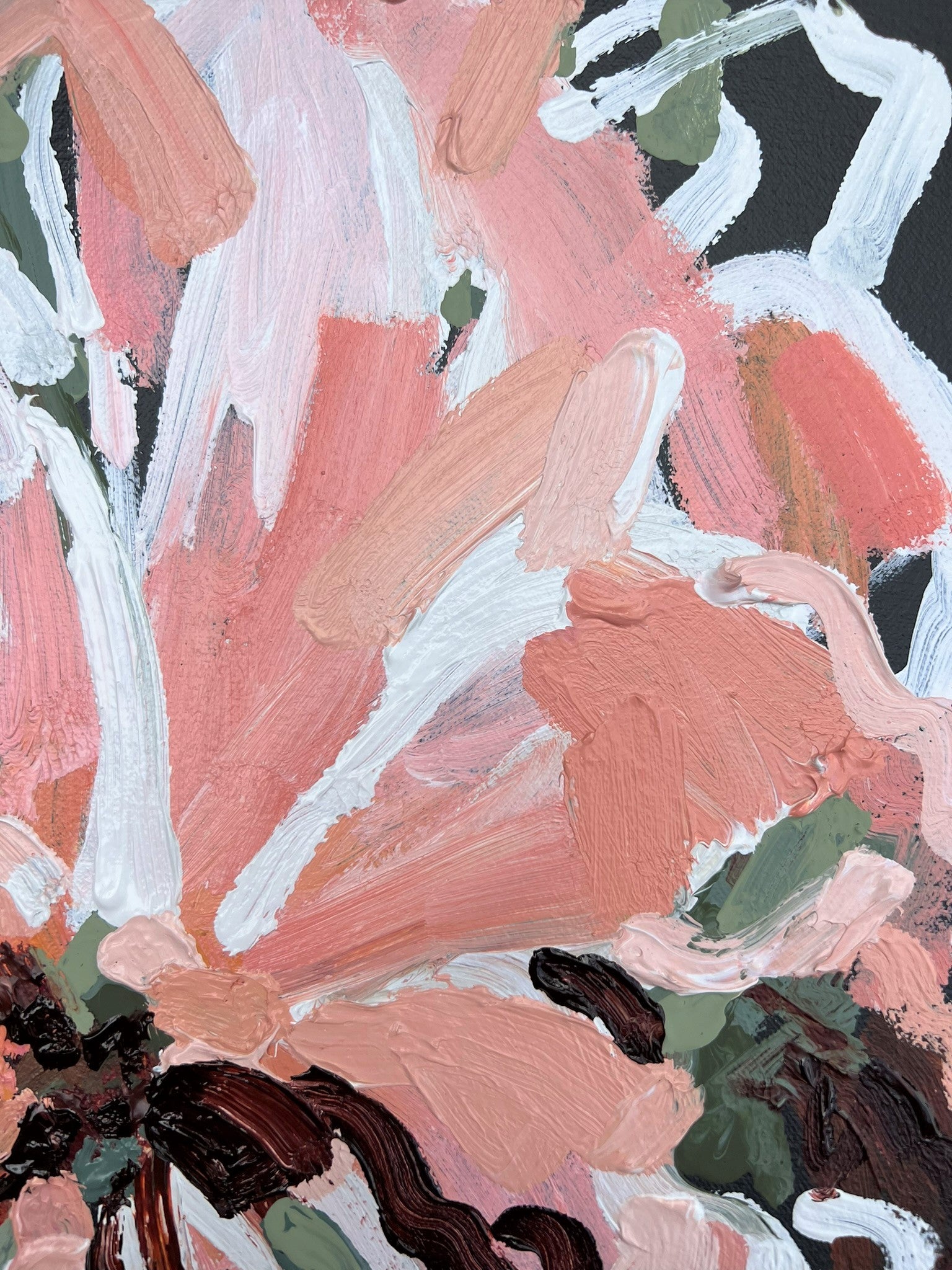 Love Of Mine is a beautifully textured flower abstract with gorgeous pinks and apricots, leather coloured impressions of leaves with bursts of terracotta, melons, sage and olive greens. This painting has expressive individual brushstrokes that bring it to life!