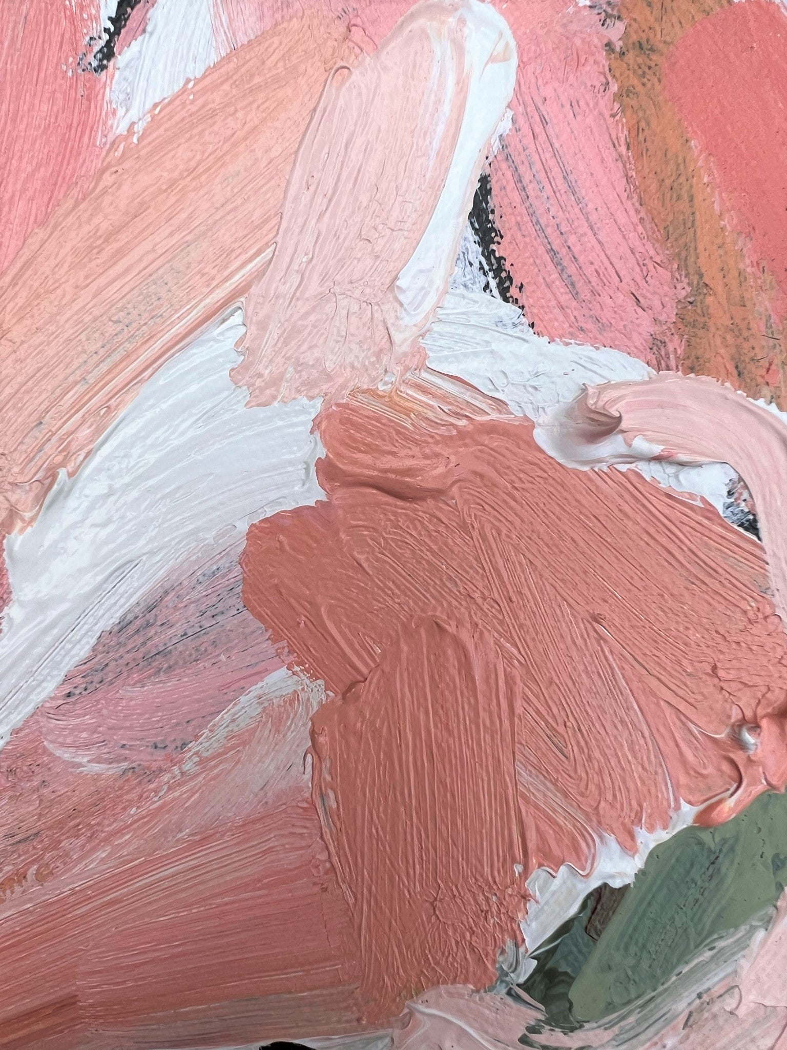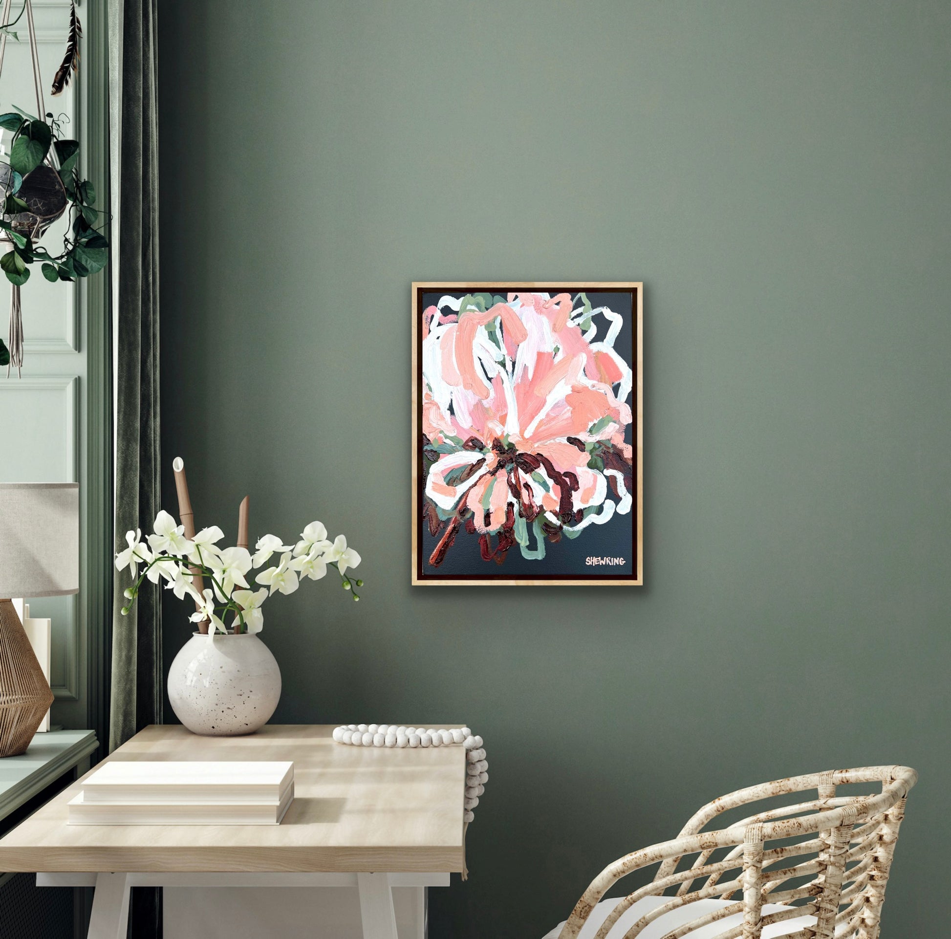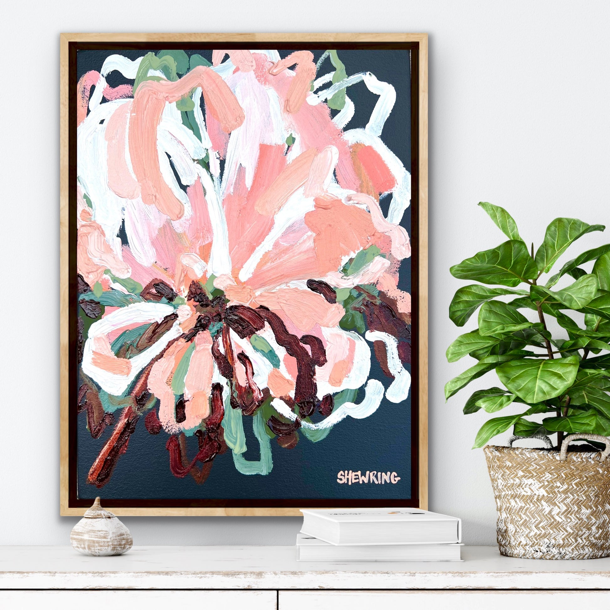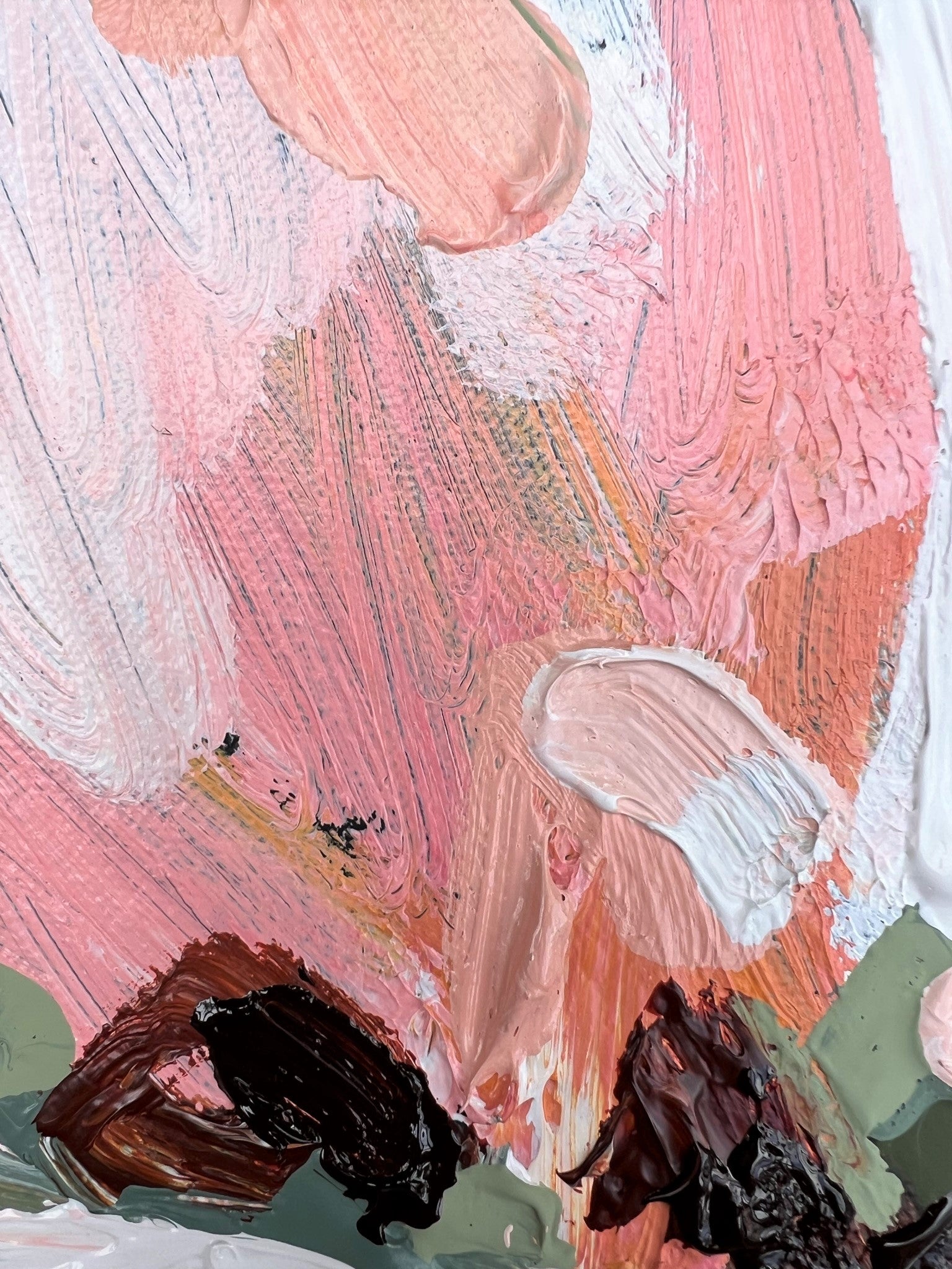 Love Of Mine is a beautifully textured flower abstract with gorgeous pinks and apricots, leather coloured impressions of leaves with bursts of terracotta, melons, sage and olive greens. This painting has expressive individual brushstrokes that bring it to life!