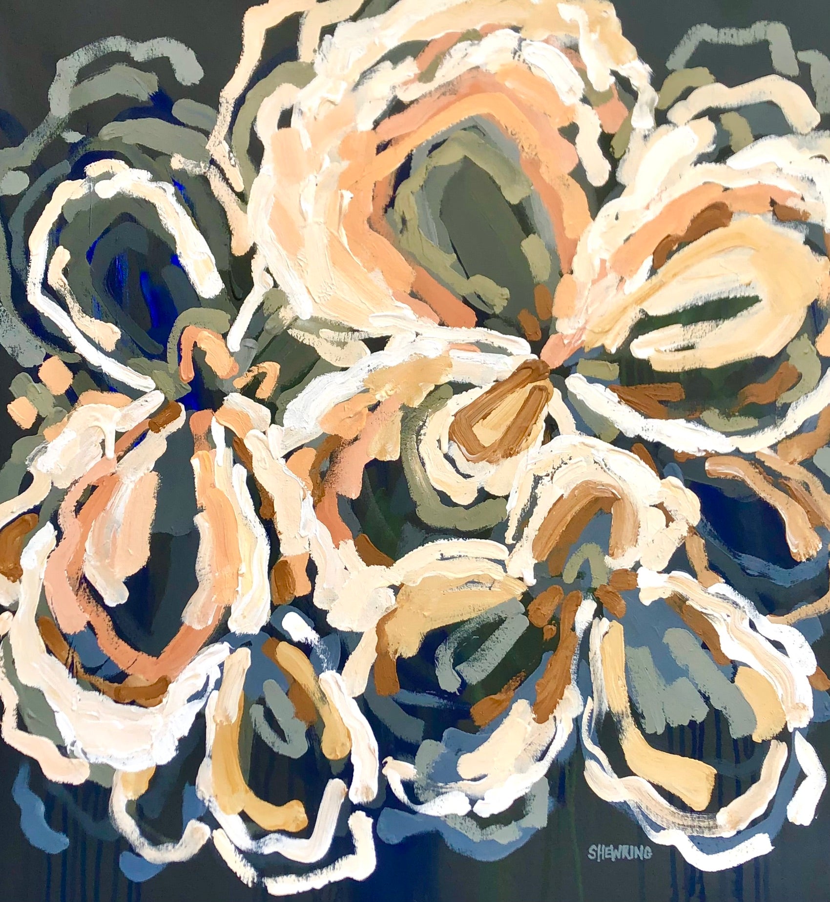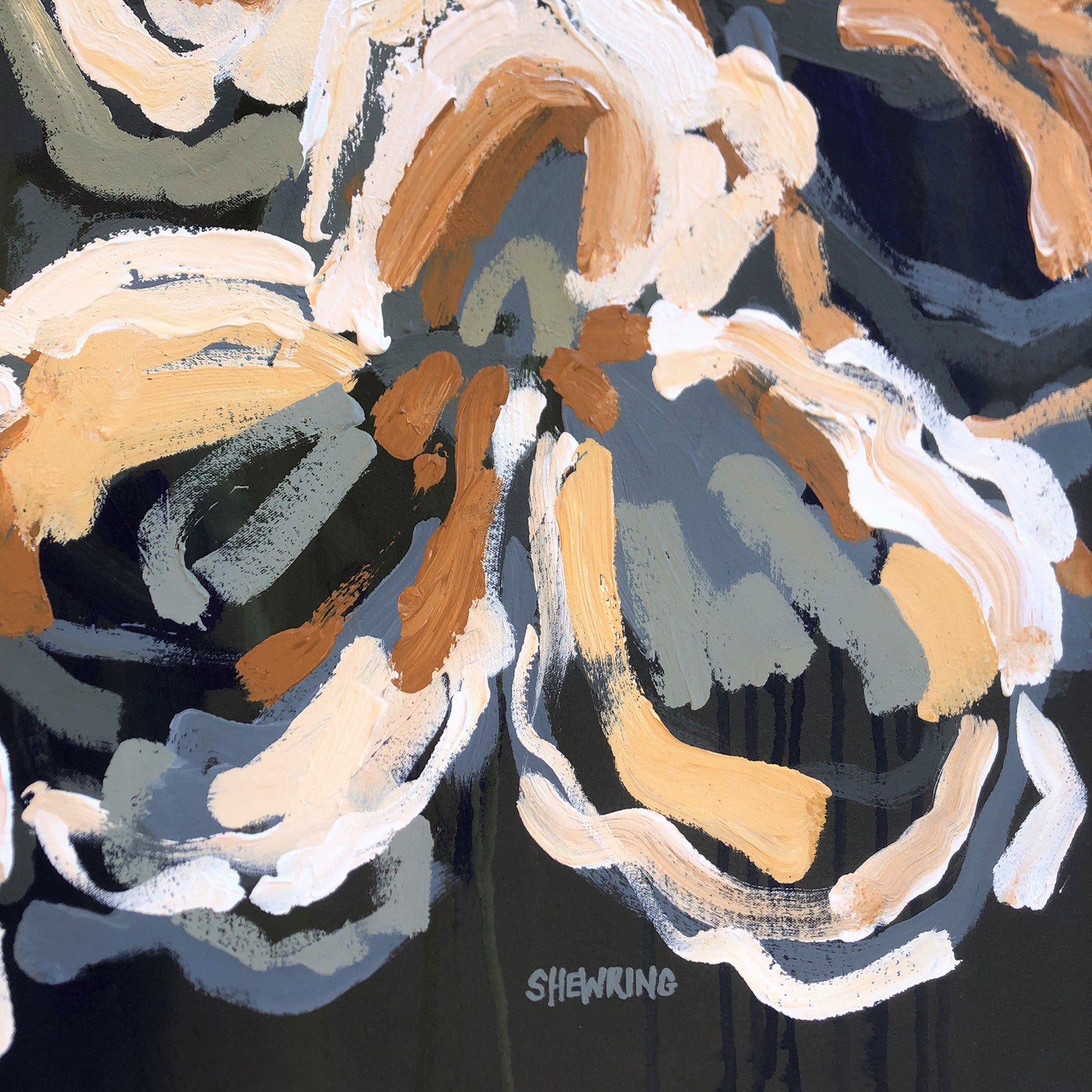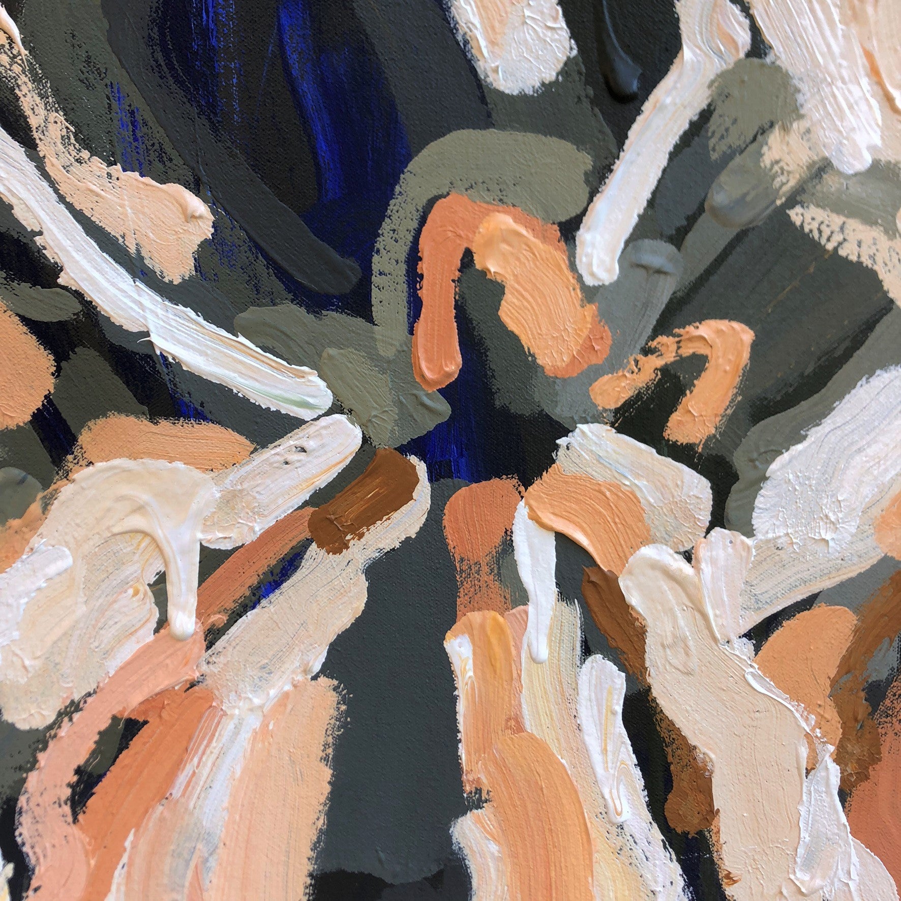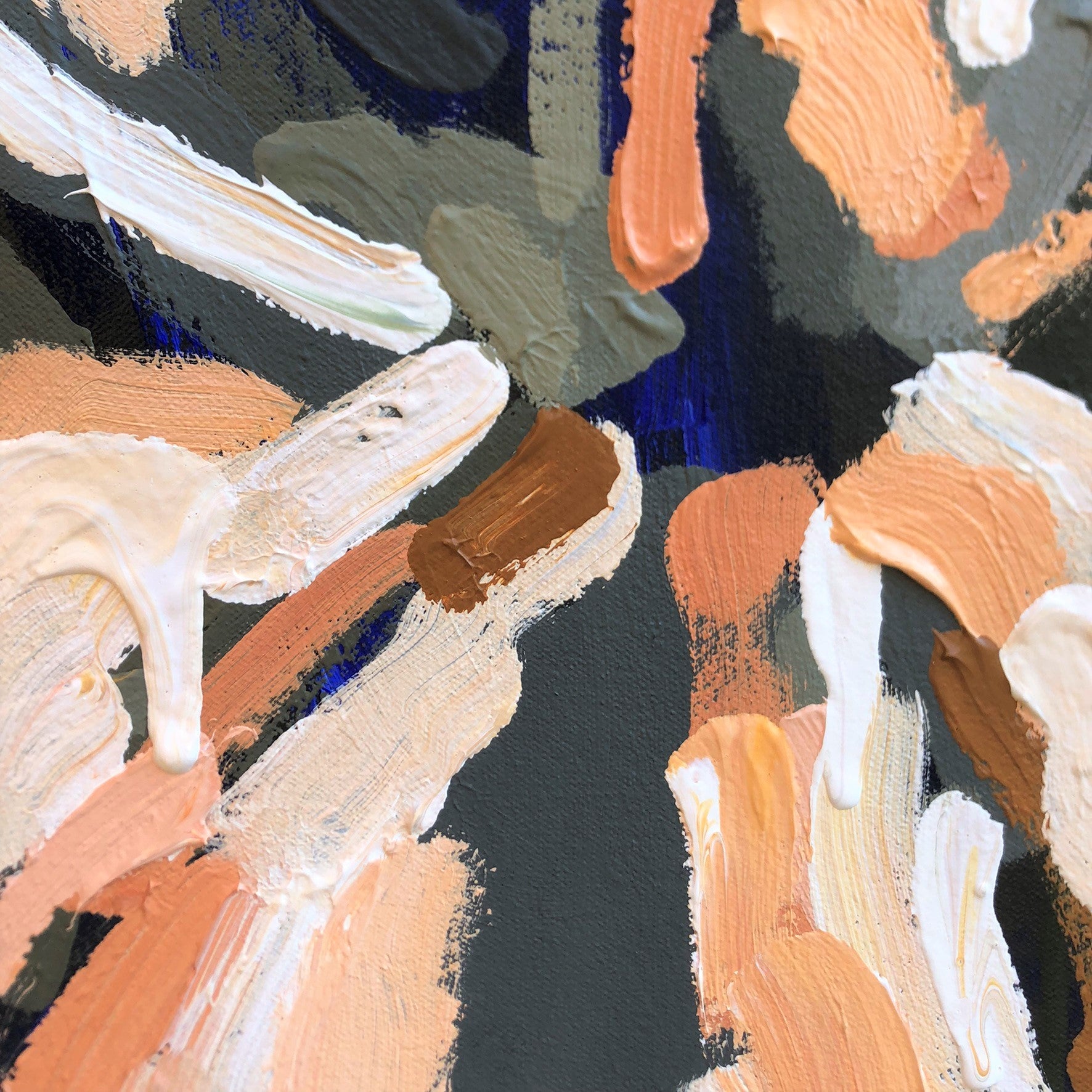 The background is a warm charcoal with subtle drips of deep ultramarine blues and warm dark greens that draw you into the painting.