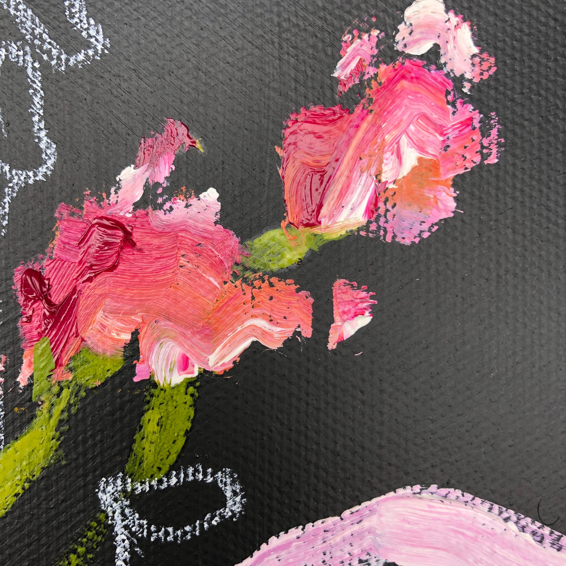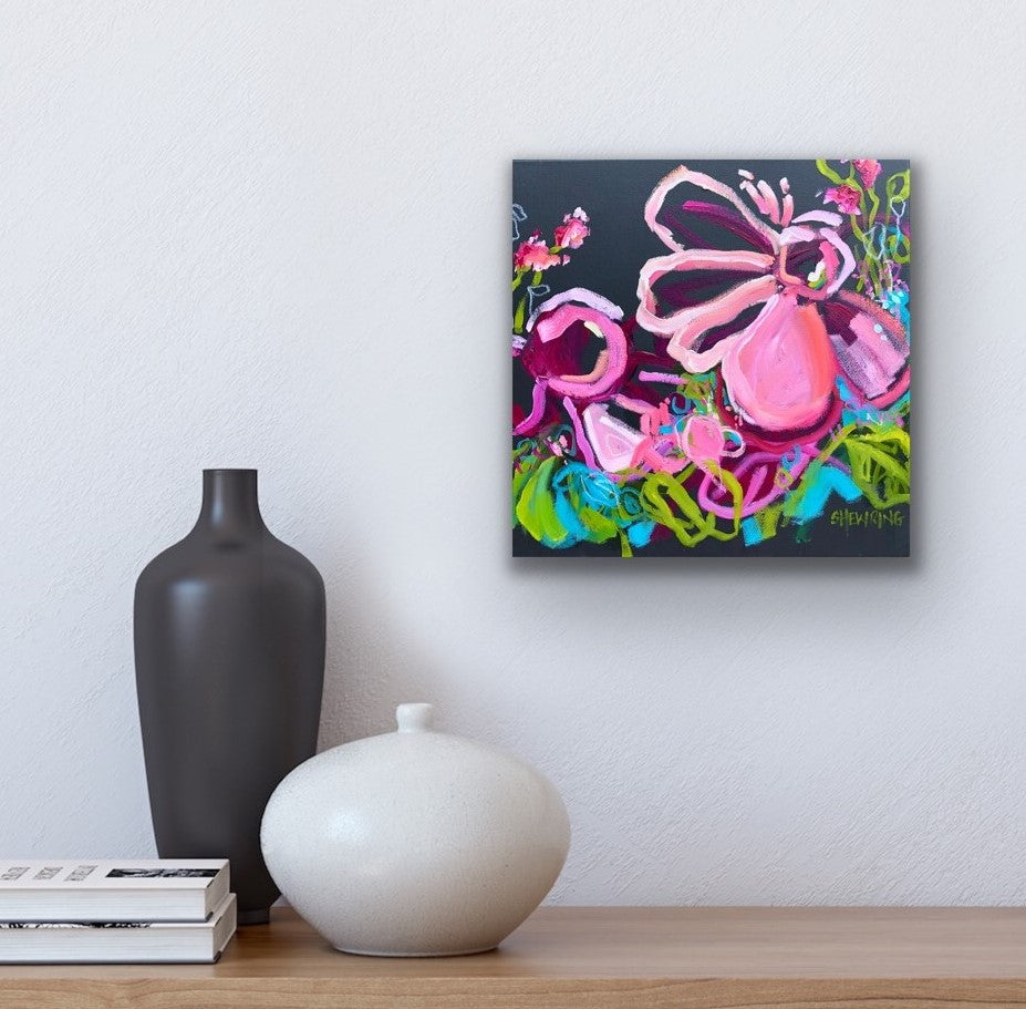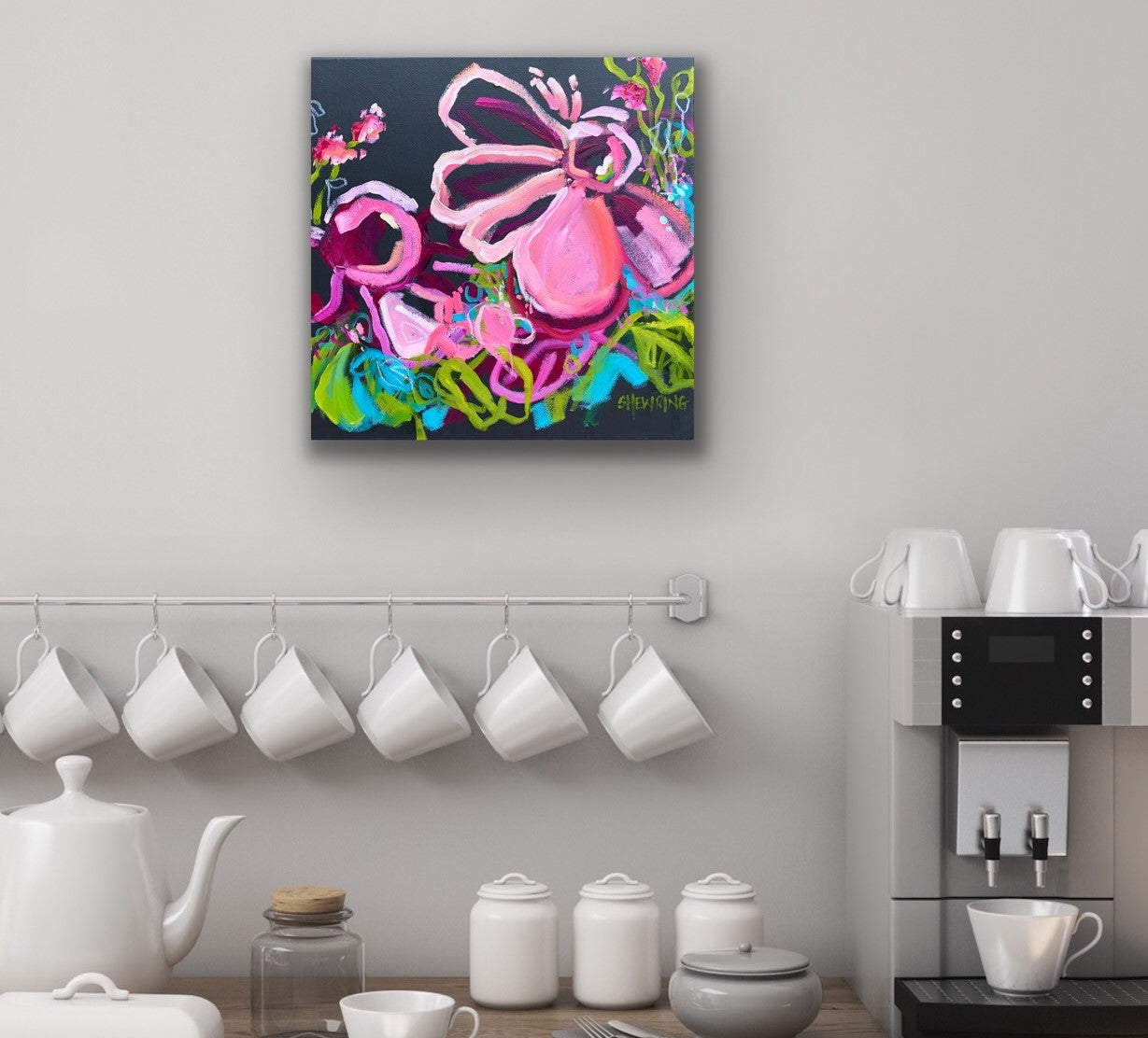 Painting flowers is a passion of mine mixed with my love of their happy colours. In this painting I have placed their beauty at the forefront over a dramatic deep coloured charcoal background.
