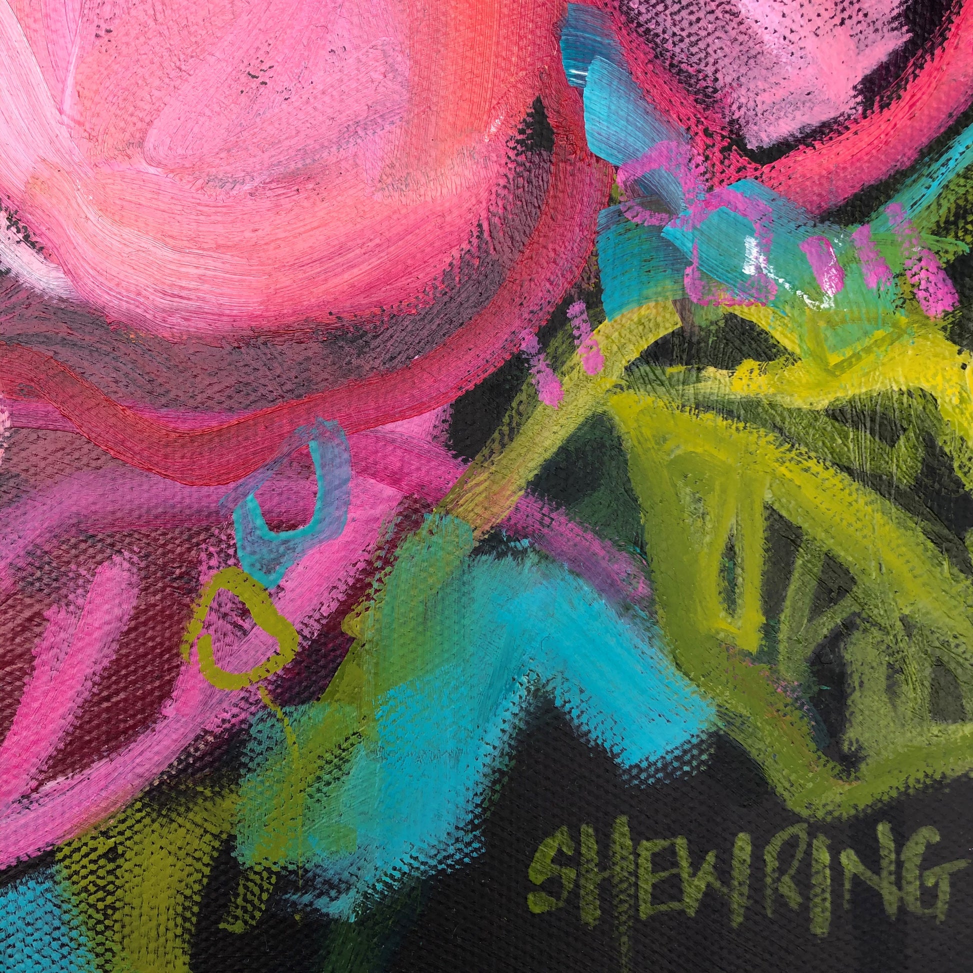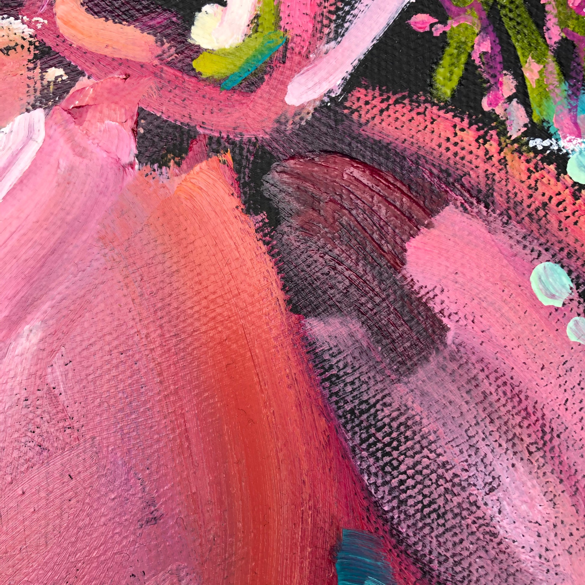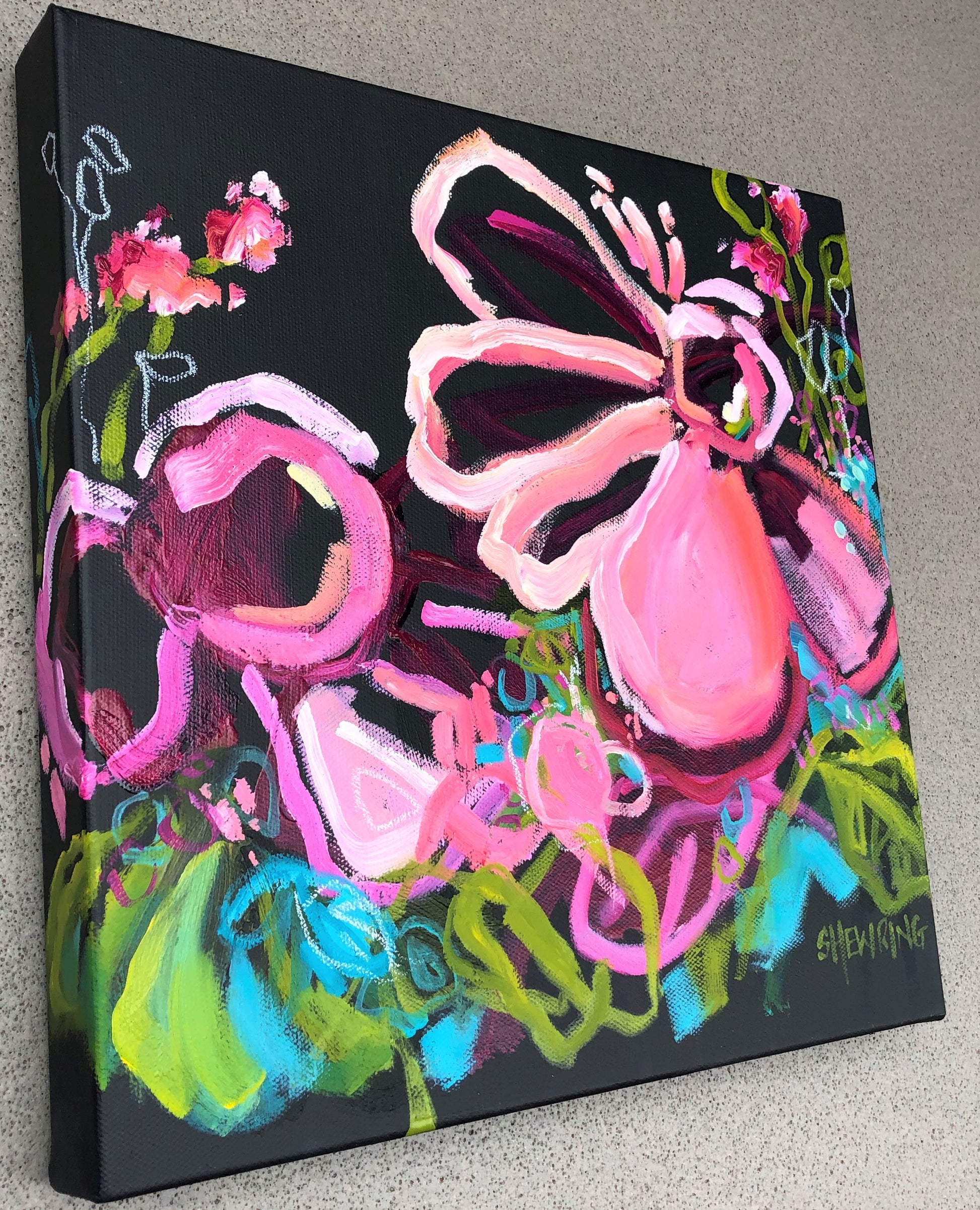 Painting flowers is a passion of mine mixed with my love of their happy colours. In this painting I have placed their beauty at the forefront over a dramatic deep coloured charcoal background.