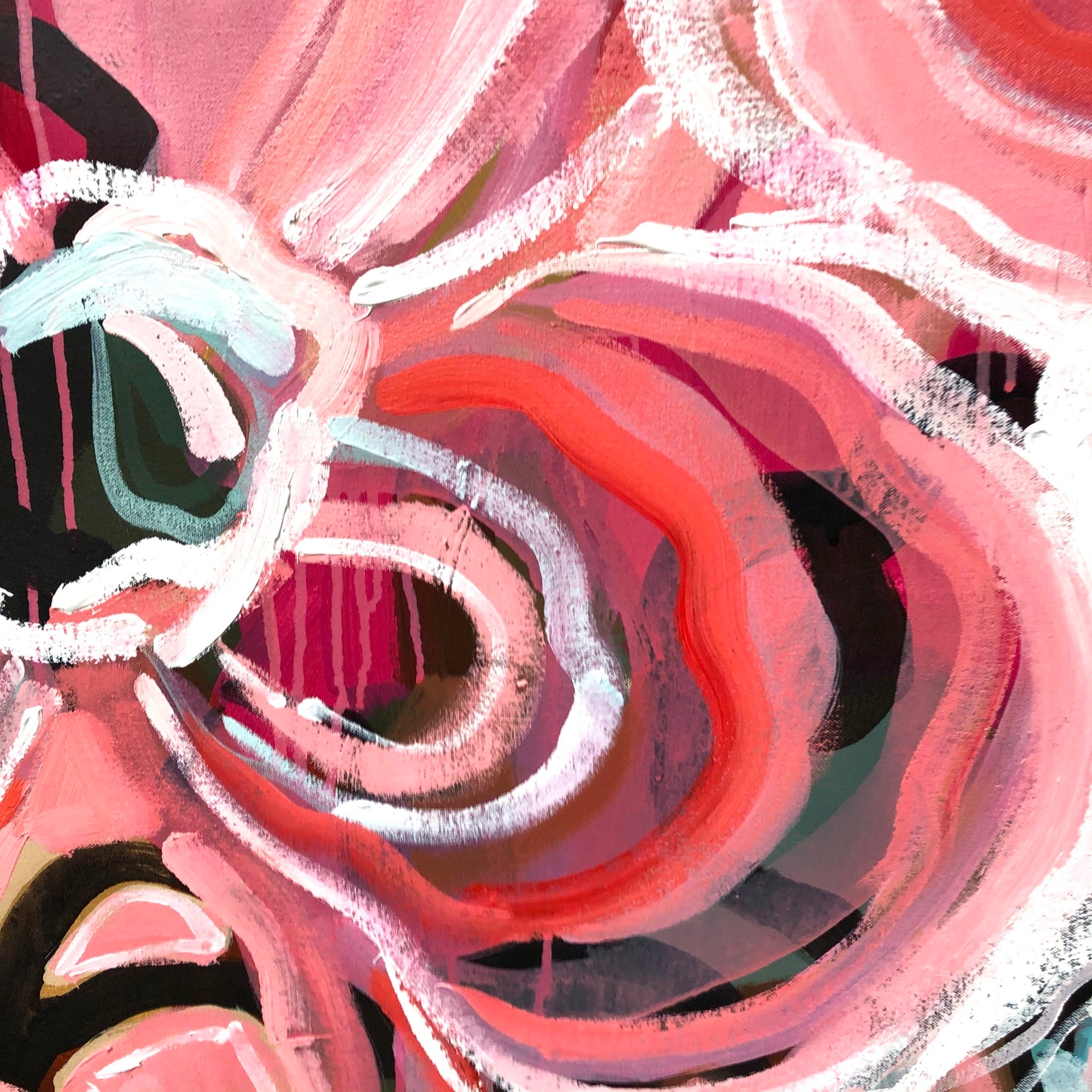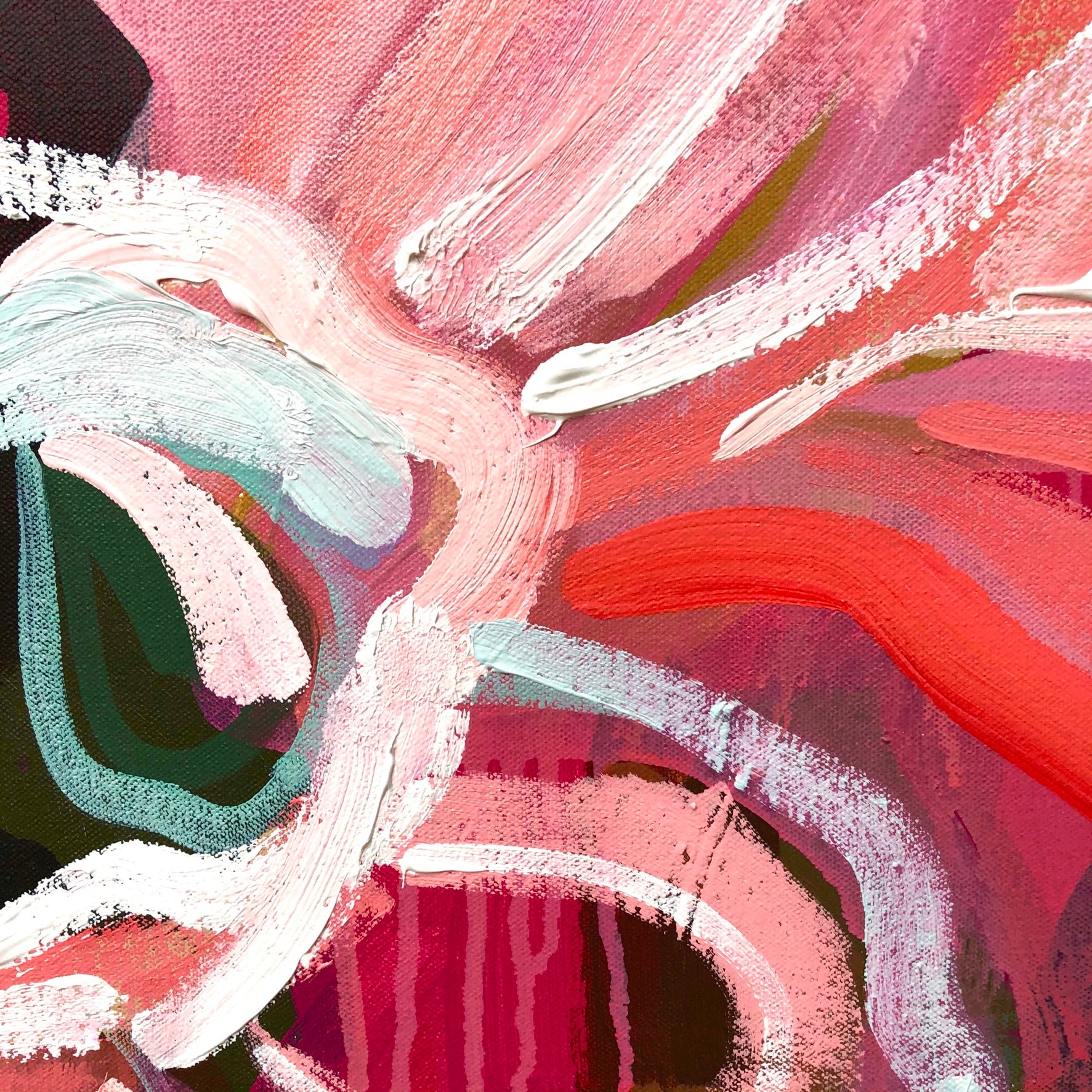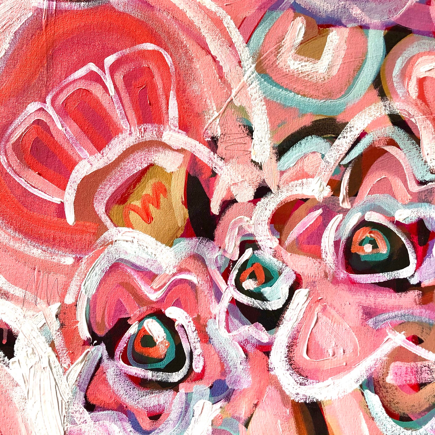 Love Tonic is a bright and bold flower abstract inspired by the delicious summer colours of melons, strawberries and raspberries. This painting has the passionate colours of love!