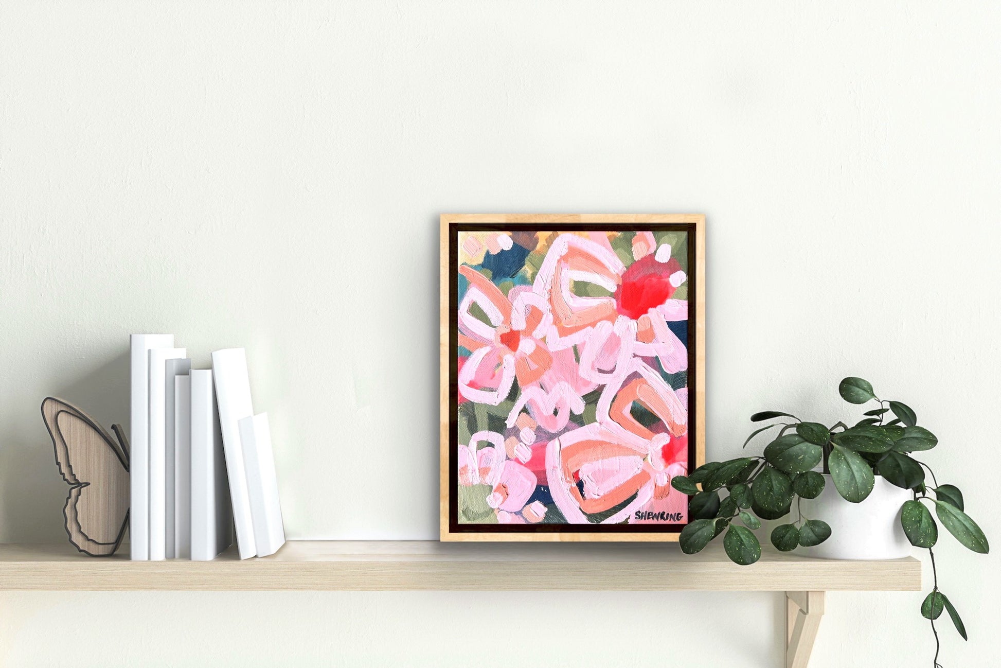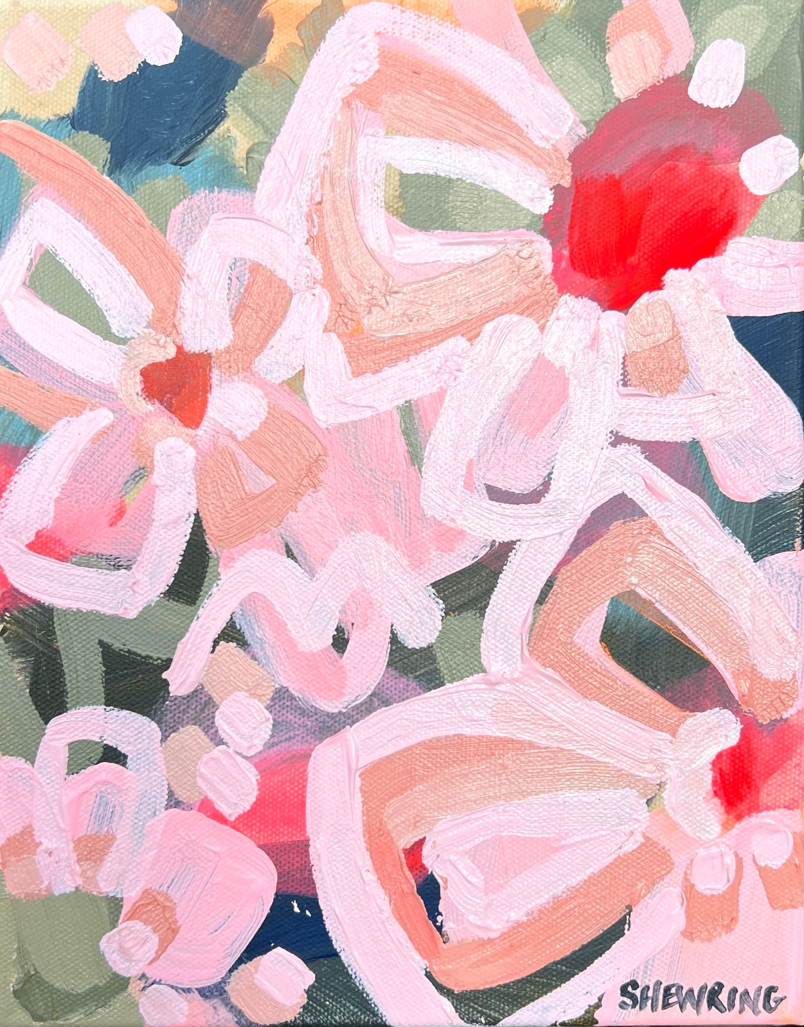 Love You #1 is a bright and bold flower abstract inspired by the delicious colours of melons, strawberries and raspberries complimented with shades of gorgeous greens and blues. This painting has the passionate colours of love!